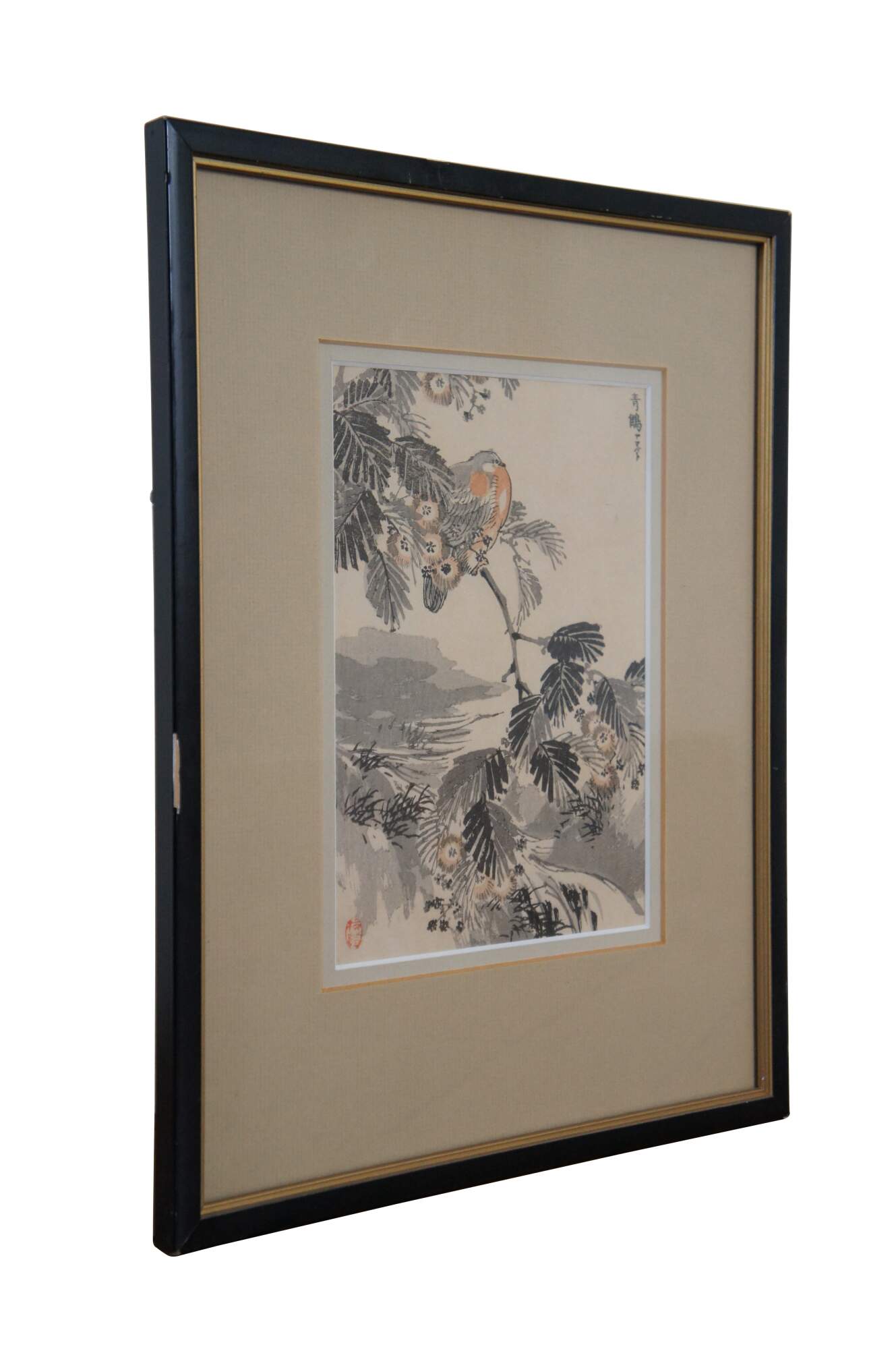 Antique 1881 Japanese woodcut print by Kono Bairei showing a round red breasted bird perched on a flowering branch, printed in shades of gray with orange accents. Published by Ohkura-Ya.