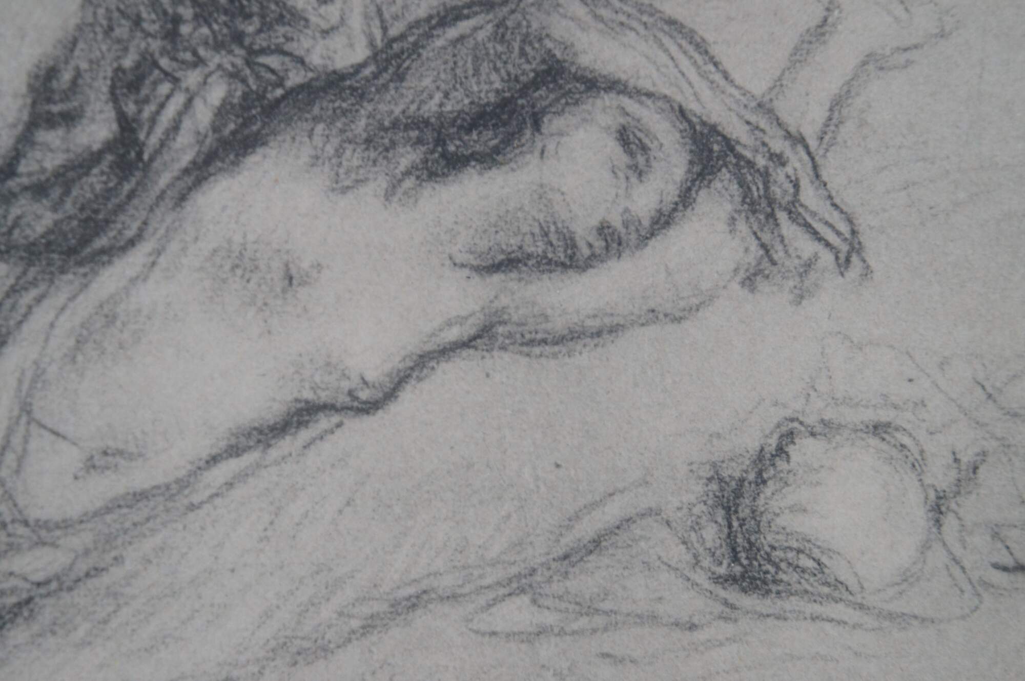 Antique etching of Jean-François Millet's "Femme � moitié nue, étendue au pied d'une meule" (Half-naked woman, lying at the base of a haystack), ca. 1846. (Original in the collection of the Musee du Louvre.) Framed in a simple silver metal frame.
