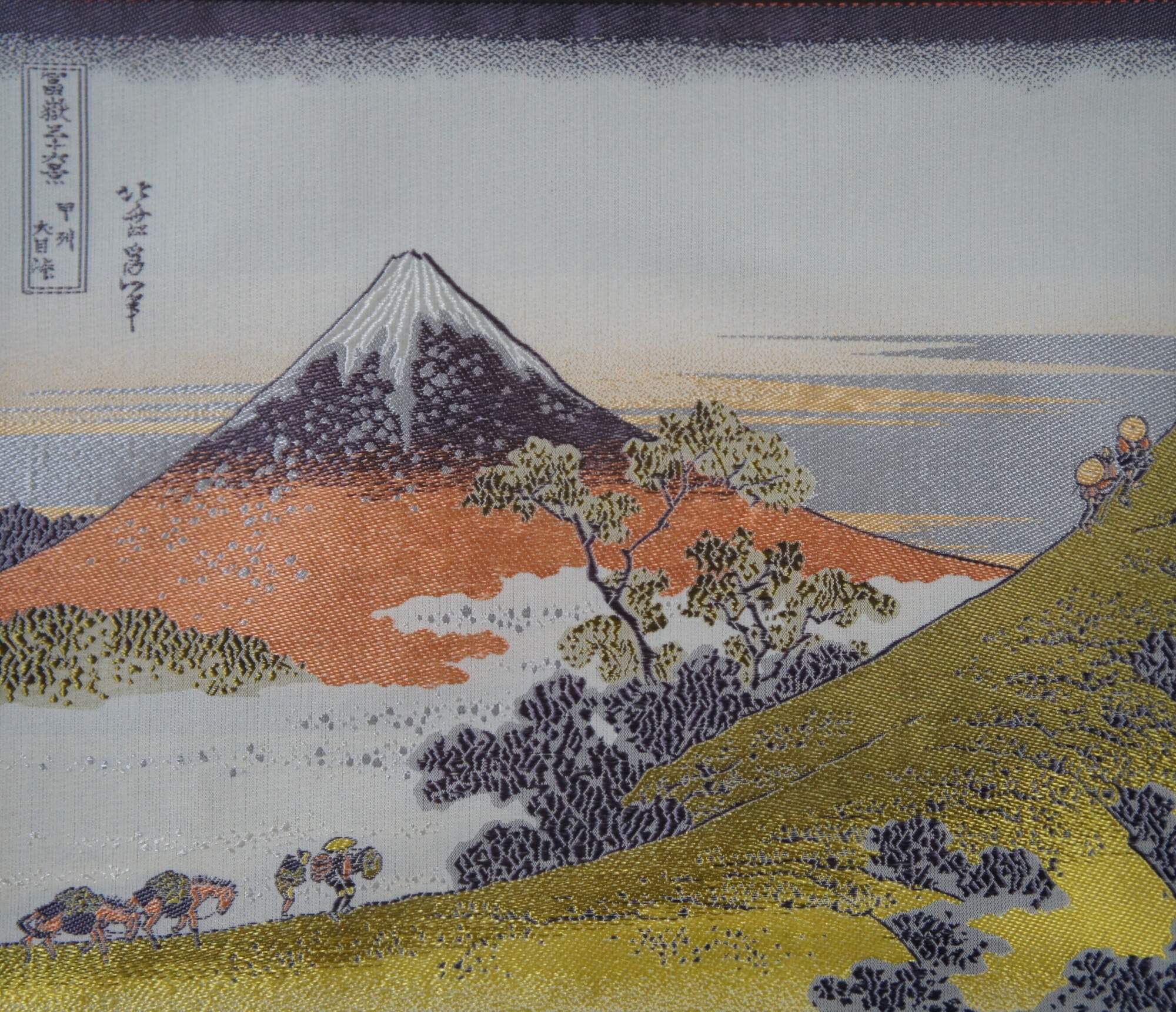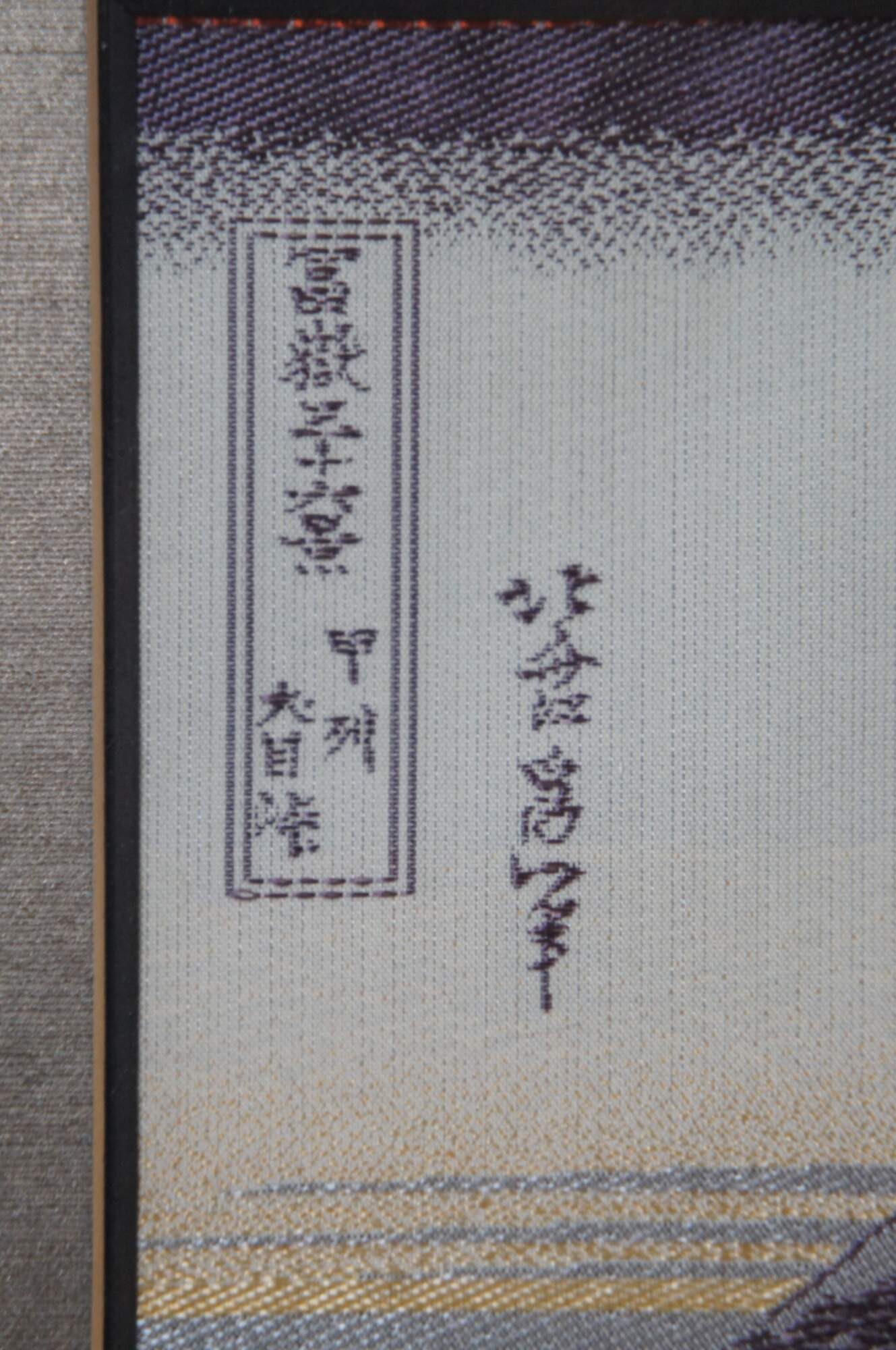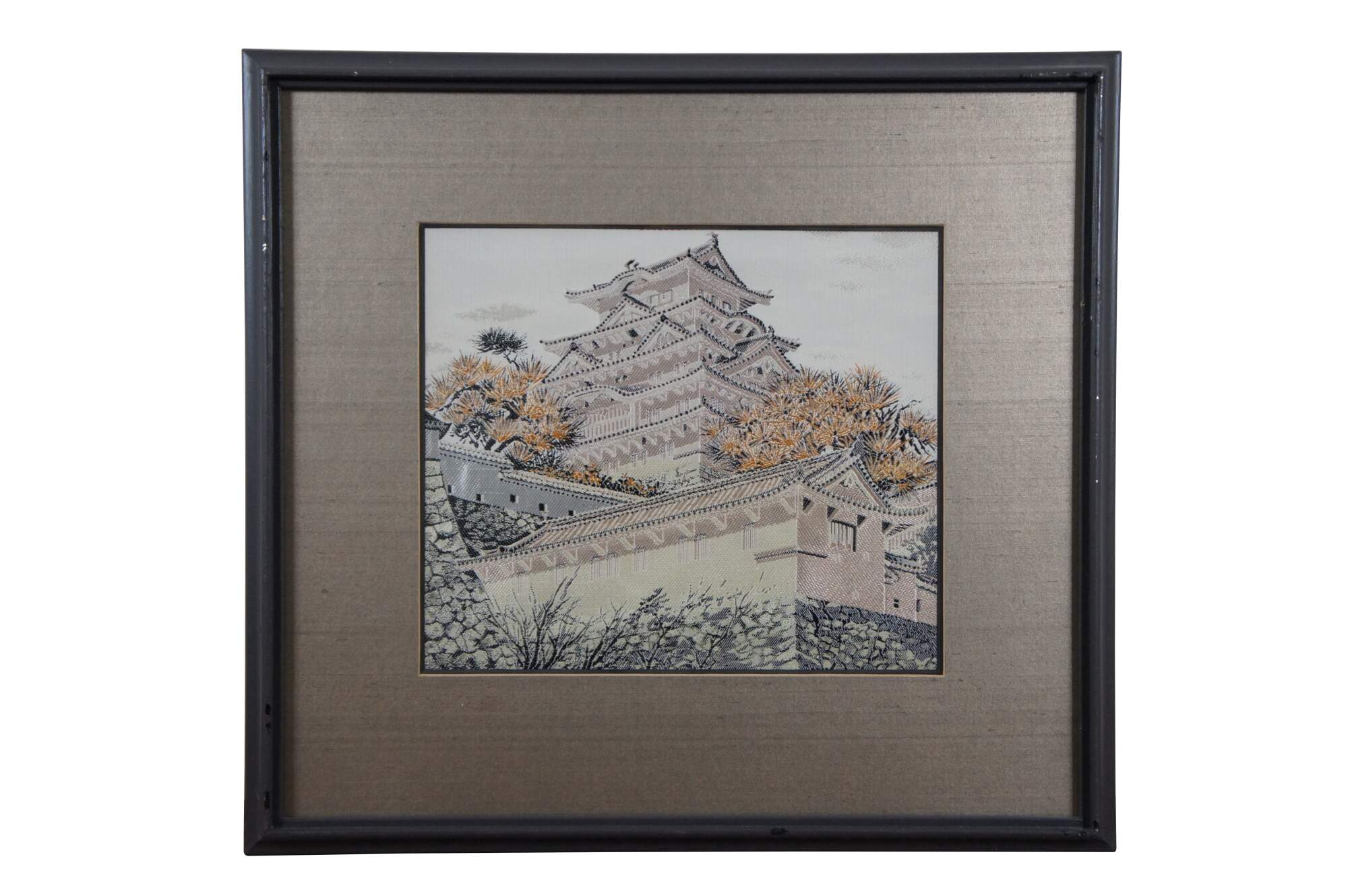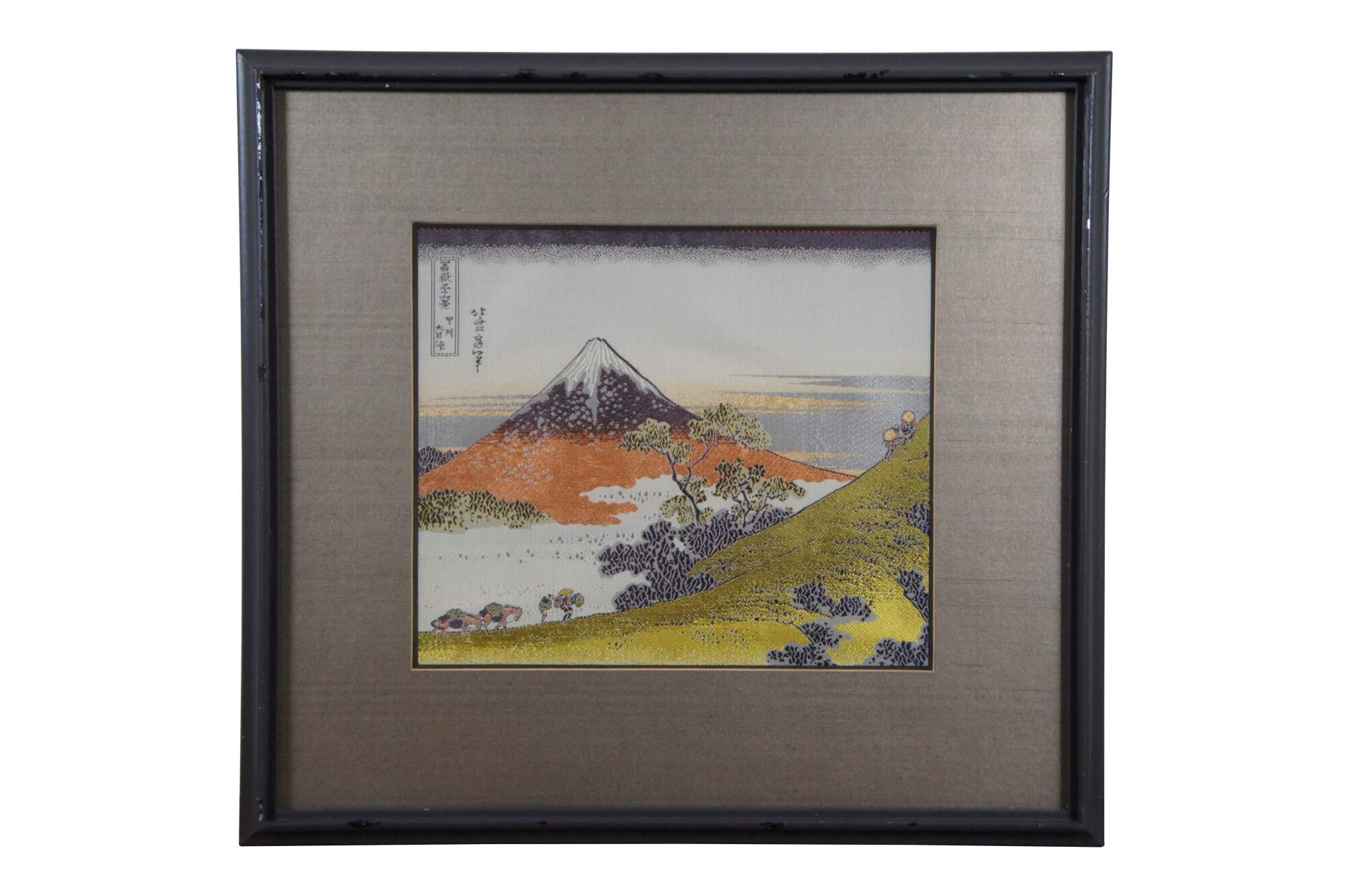 Pair of vintage embroidered silk scenes based on Japanese woodblock prints. One shows a mountain landscape with figures, after a woodblock print of Inume Pass in Kai Province (Kōshū Inume tōge), from the series Thirty-six Views of Mount Fuji (Fugaku sanjūrokkei) by Katsushika Hokusai. The other appears to be Himeji (White Heron) Castle, viewed from below. Framed in matte black raised bevel frames.