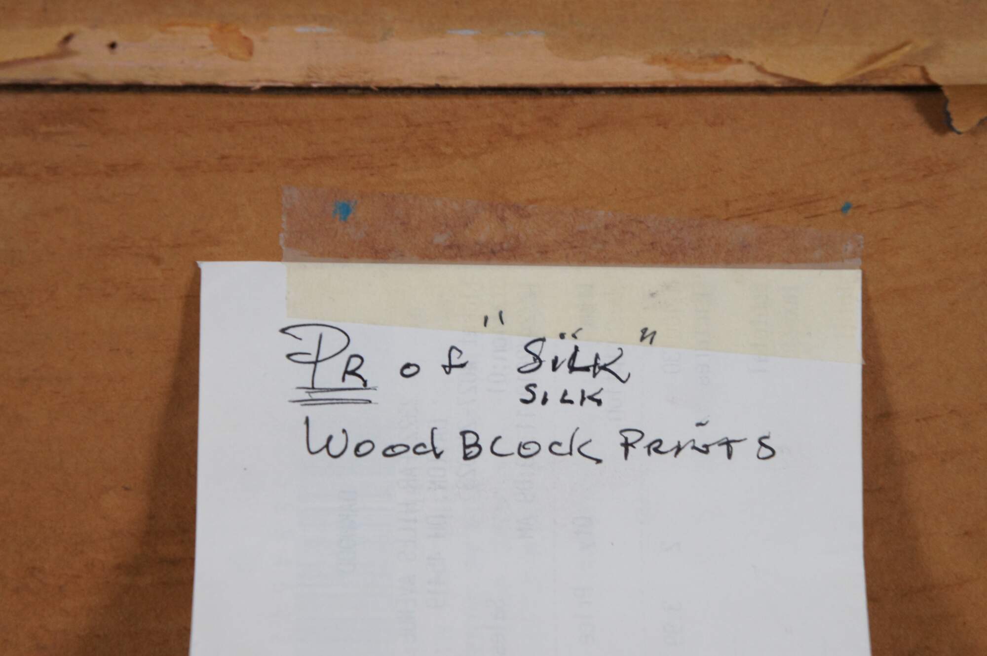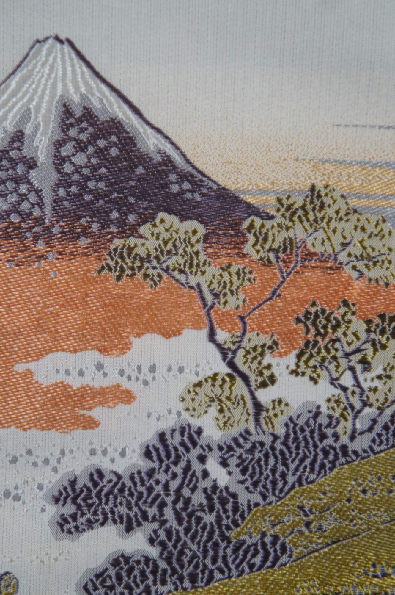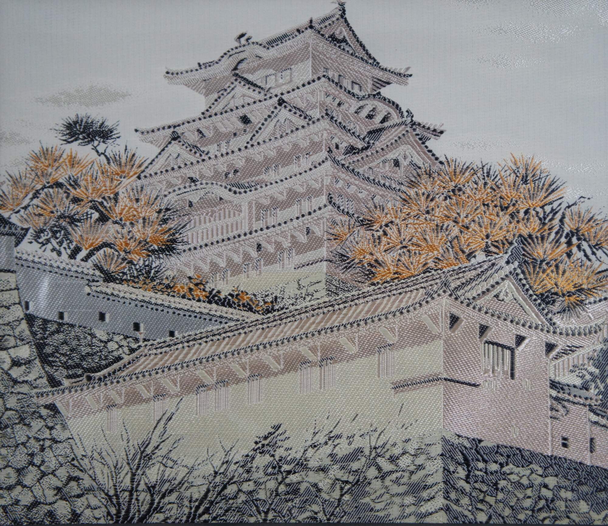 Pair of vintage embroidered silk scenes based on Japanese woodblock prints. One shows a mountain landscape with figures, after a woodblock print of Inume Pass in Kai Province (Kōshū Inume tōge), from the series Thirty-six Views of Mount Fuji (Fugaku sanjūrokkei) by Katsushika Hokusai. The other appears to be Himeji (White Heron) Castle, viewed from below. Framed in matte black raised bevel frames.