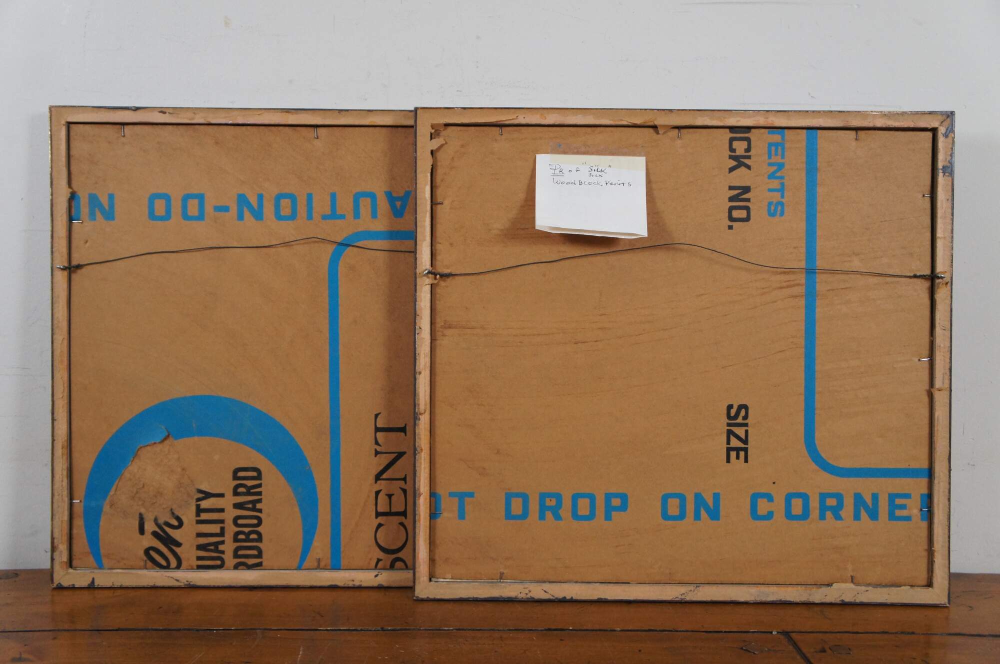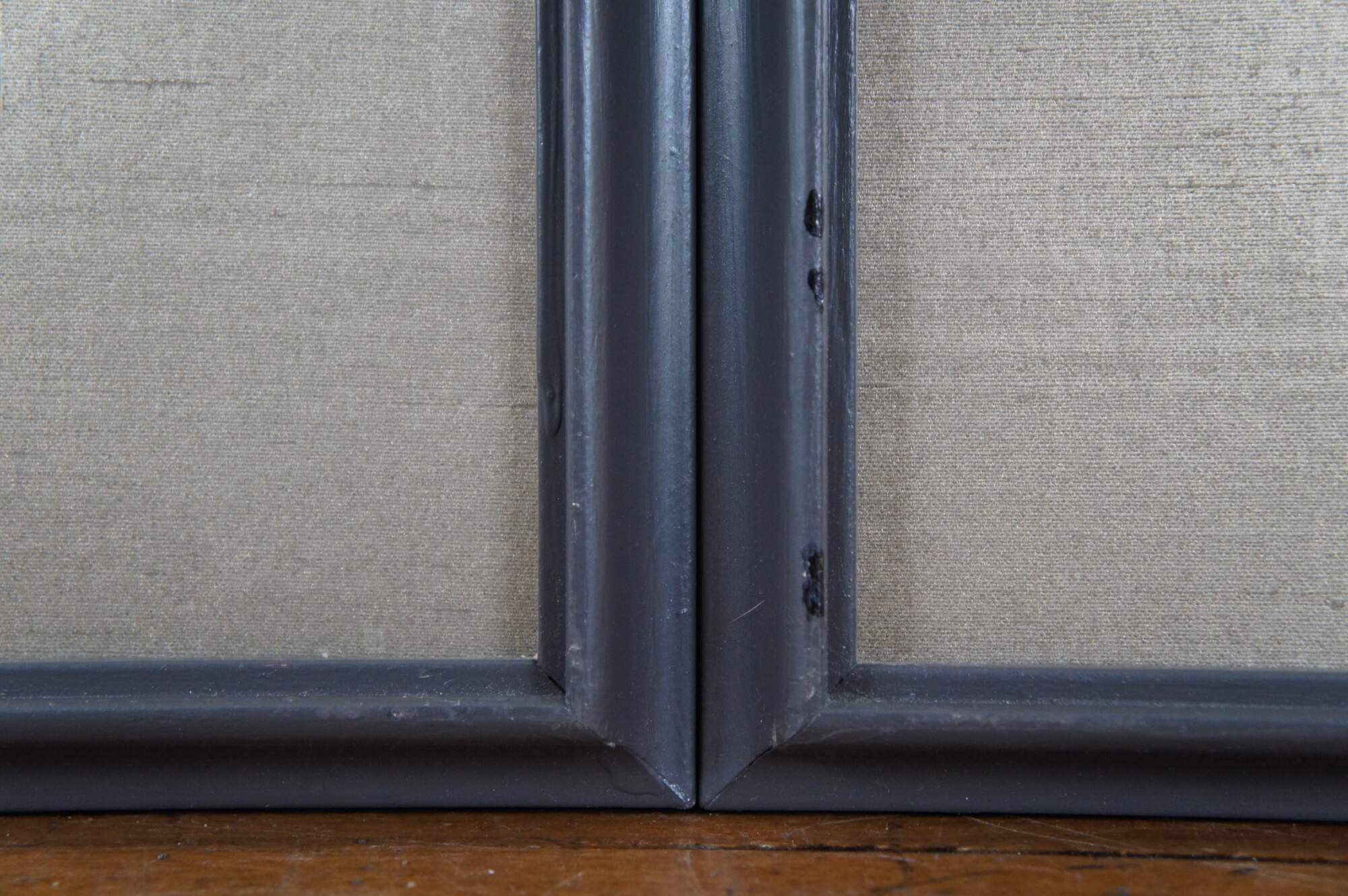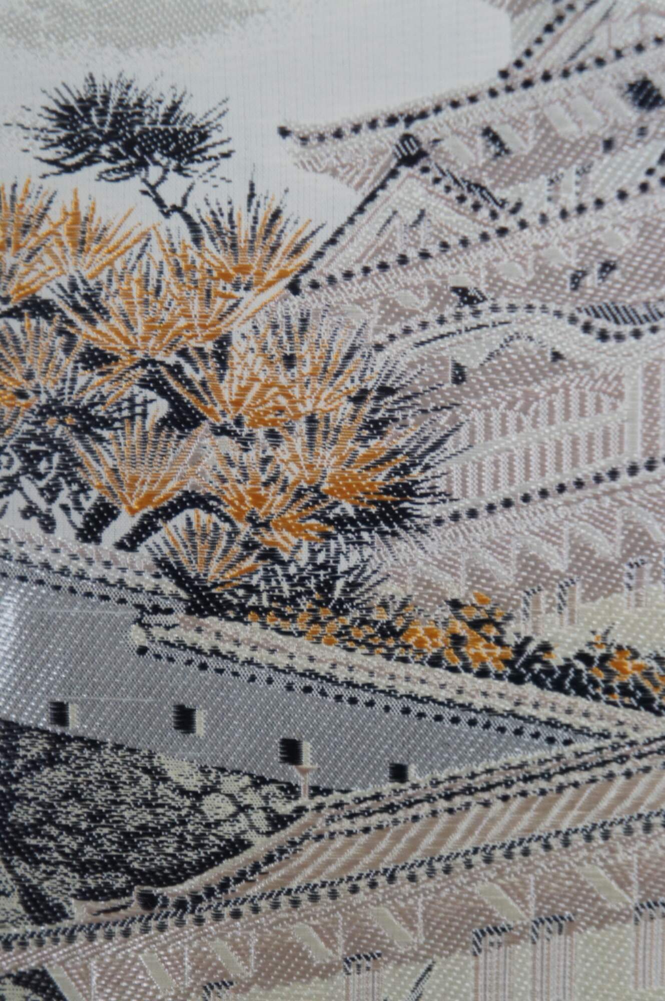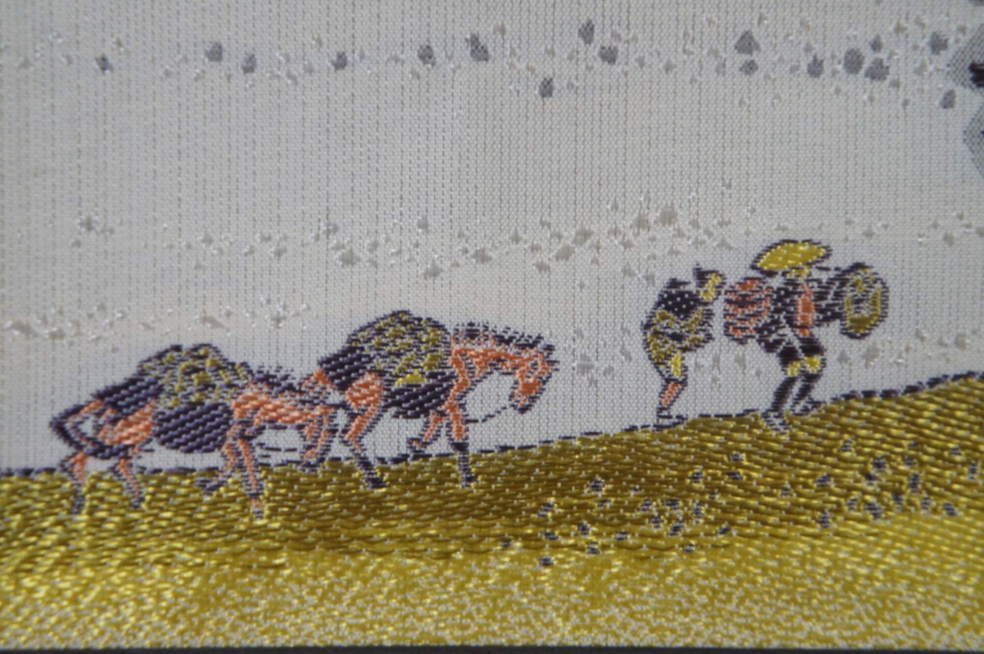 Pair of vintage embroidered silk scenes based on Japanese woodblock prints. One shows a mountain landscape with figures, after a woodblock print of Inume Pass in Kai Province (Kōshū Inume tōge), from the series Thirty-six Views of Mount Fuji (Fugaku sanjūrokkei) by Katsushika Hokusai. The other appears to be Himeji (White Heron) Castle, viewed from below. Framed in matte black raised bevel frames.