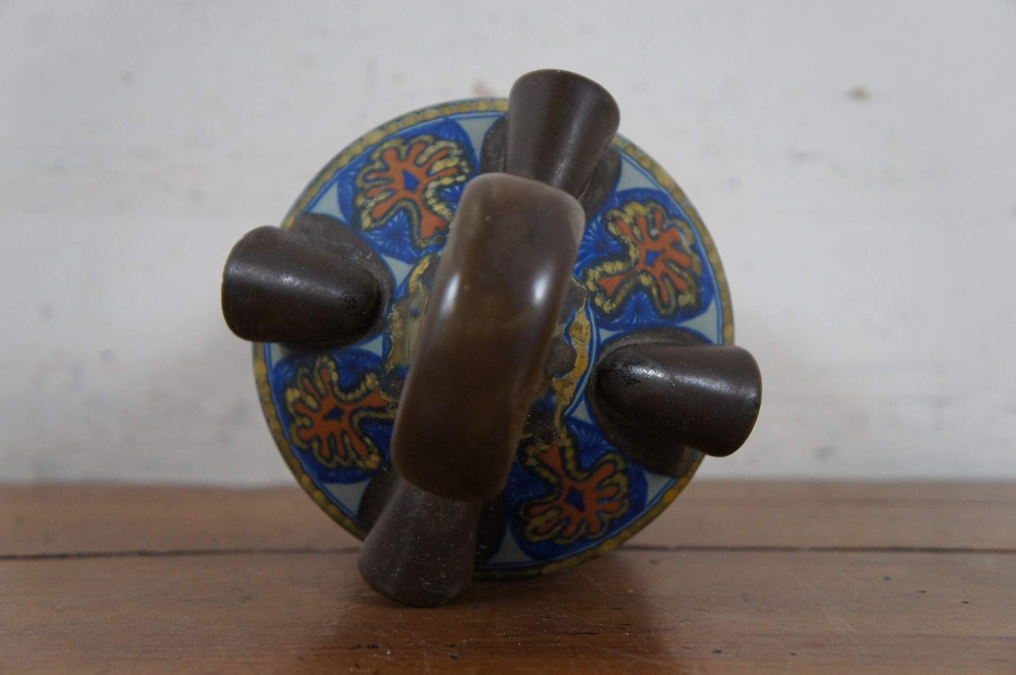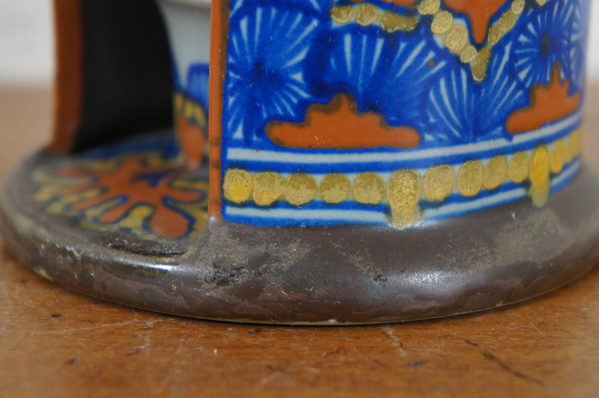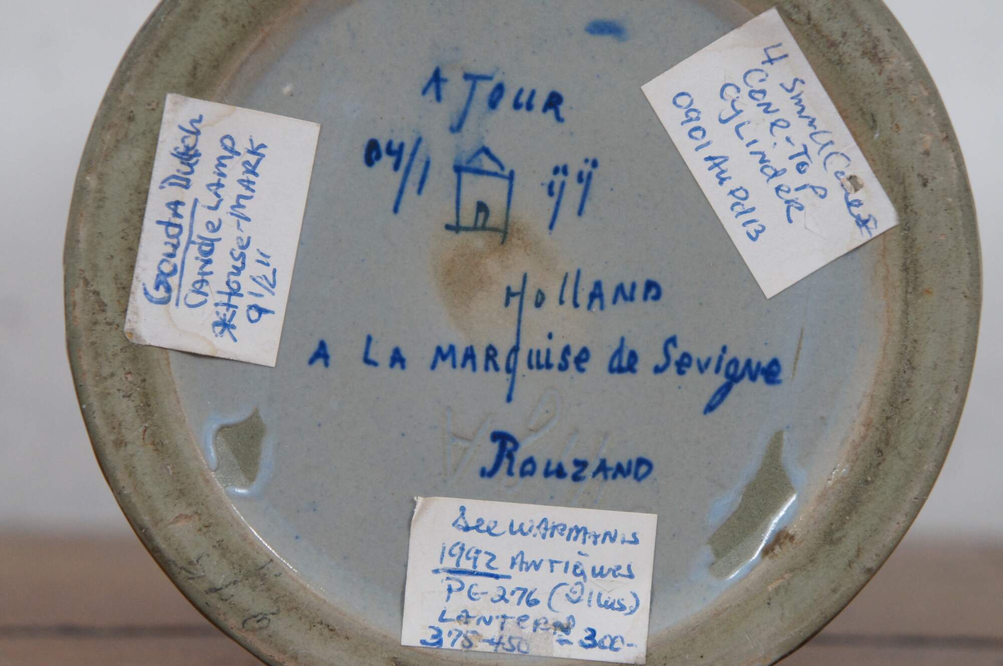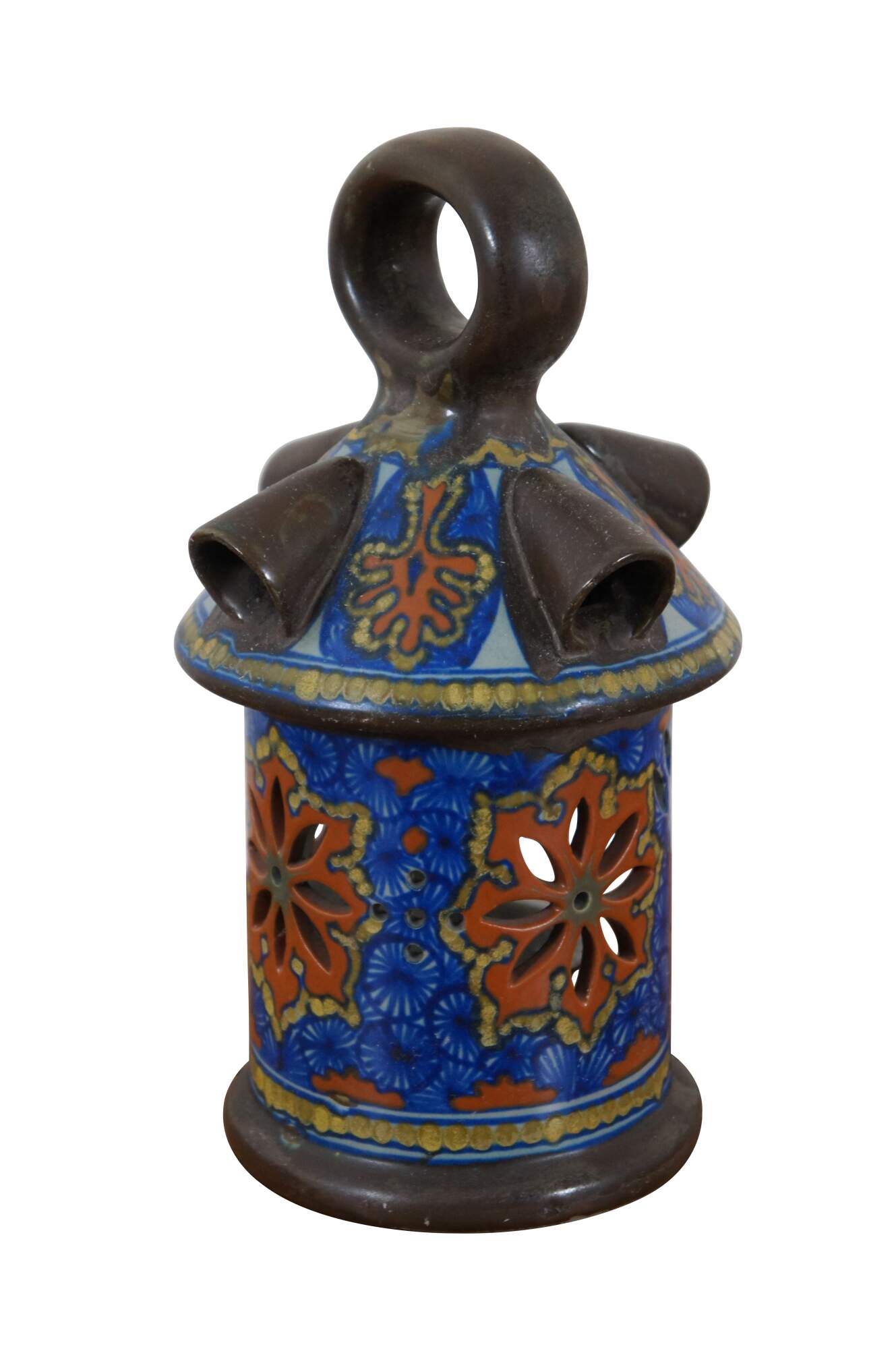 Antique Gouda a Jour Dutch pottery candle lantern, hand painted in brown, blue and orange. Houses a tea light sized votive candle. Made in Holland for Marquise de Sevigne Rouzand.
