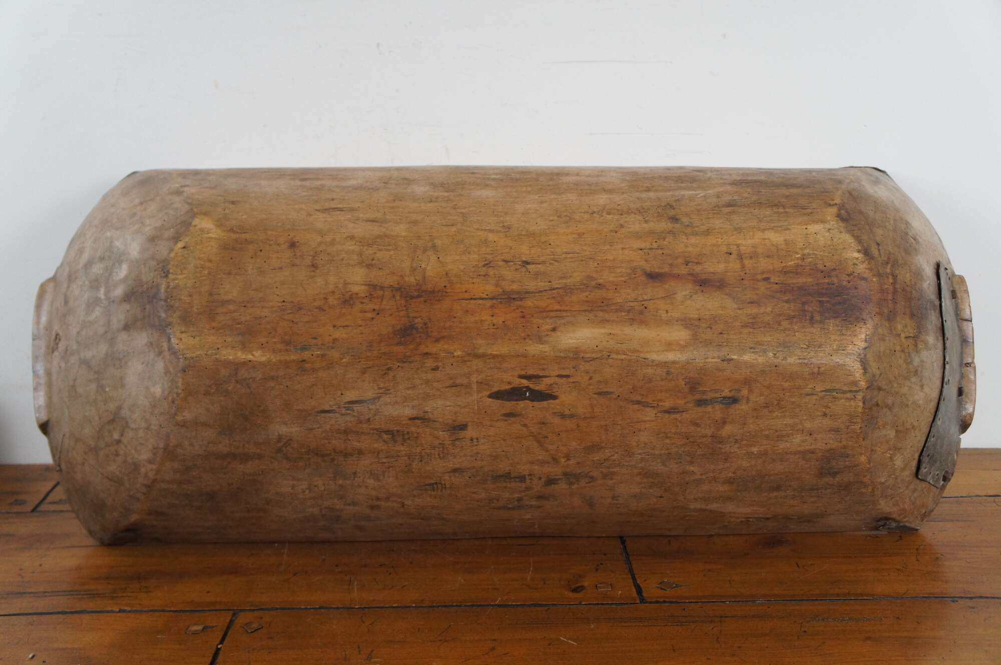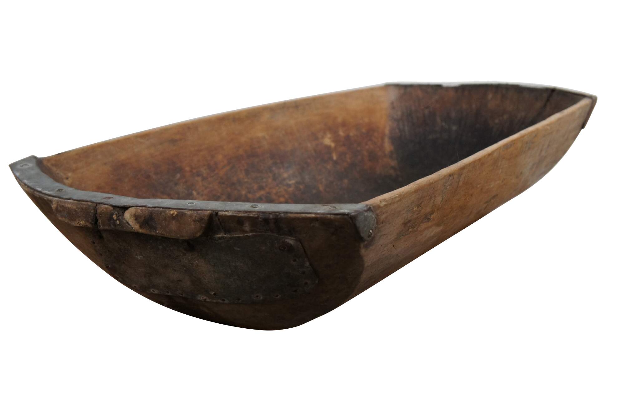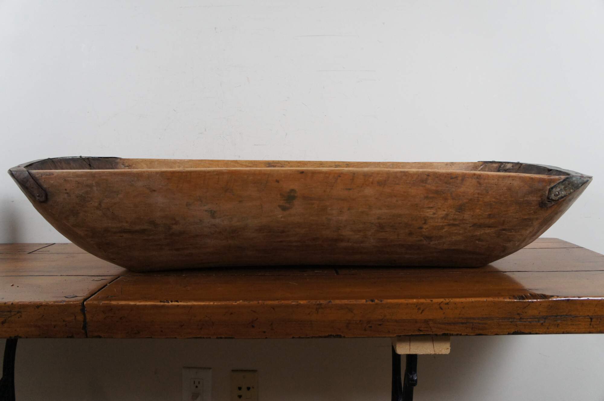 Antique, hand hewn, oversized country dough bowl / trencher featuring a rounded rectagular shape, tapered base, and iron banding / patches on the ends.