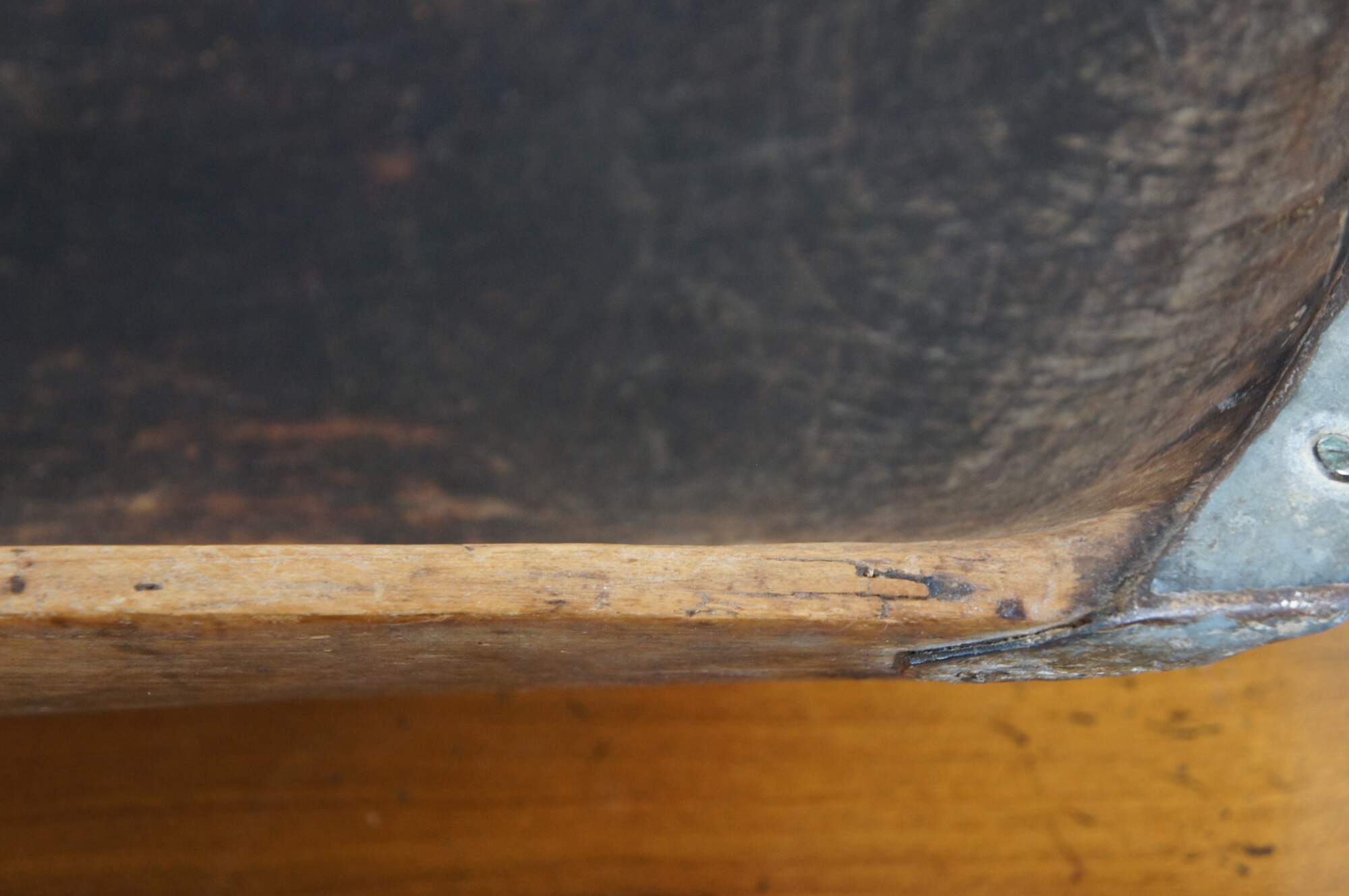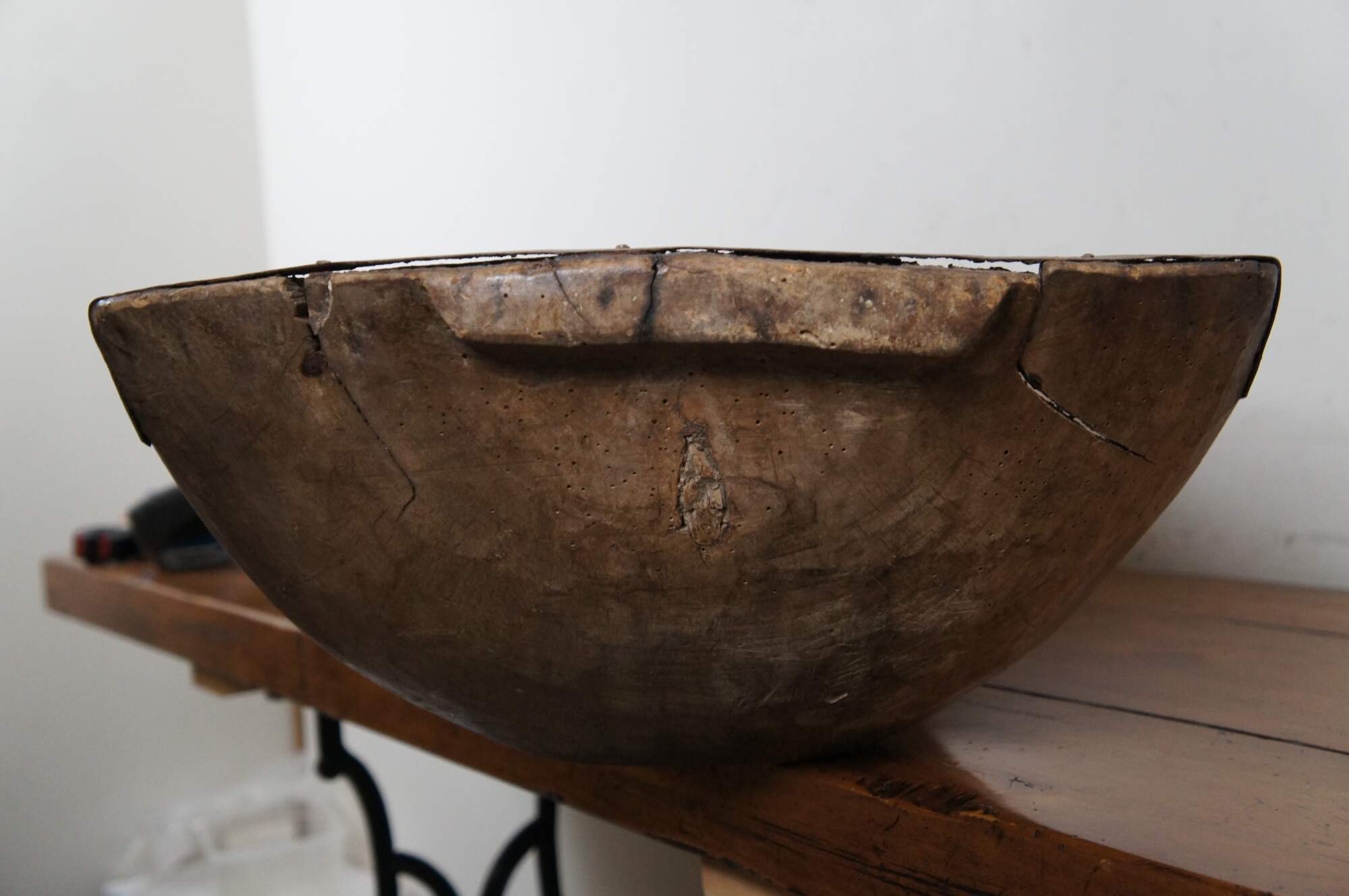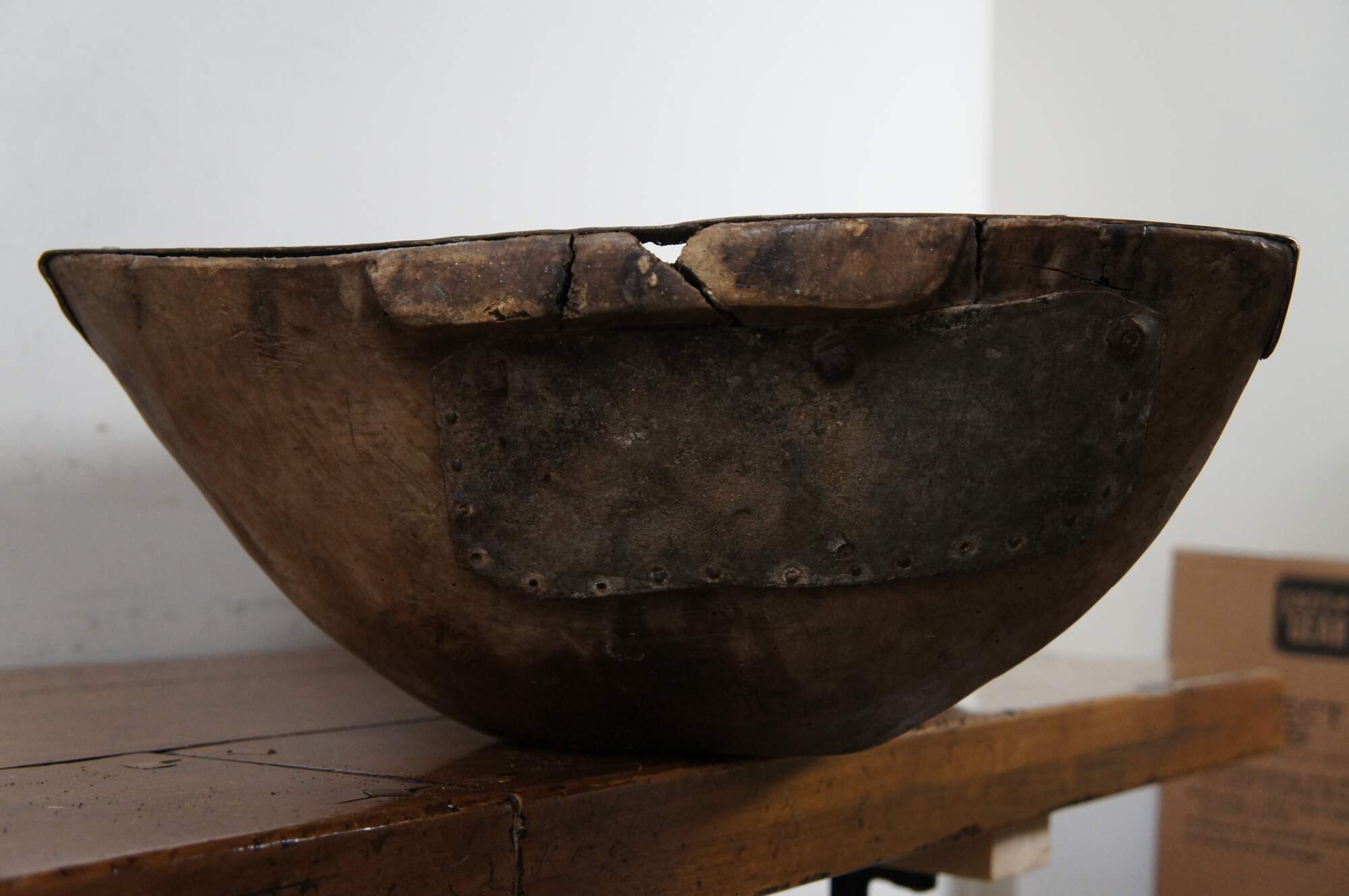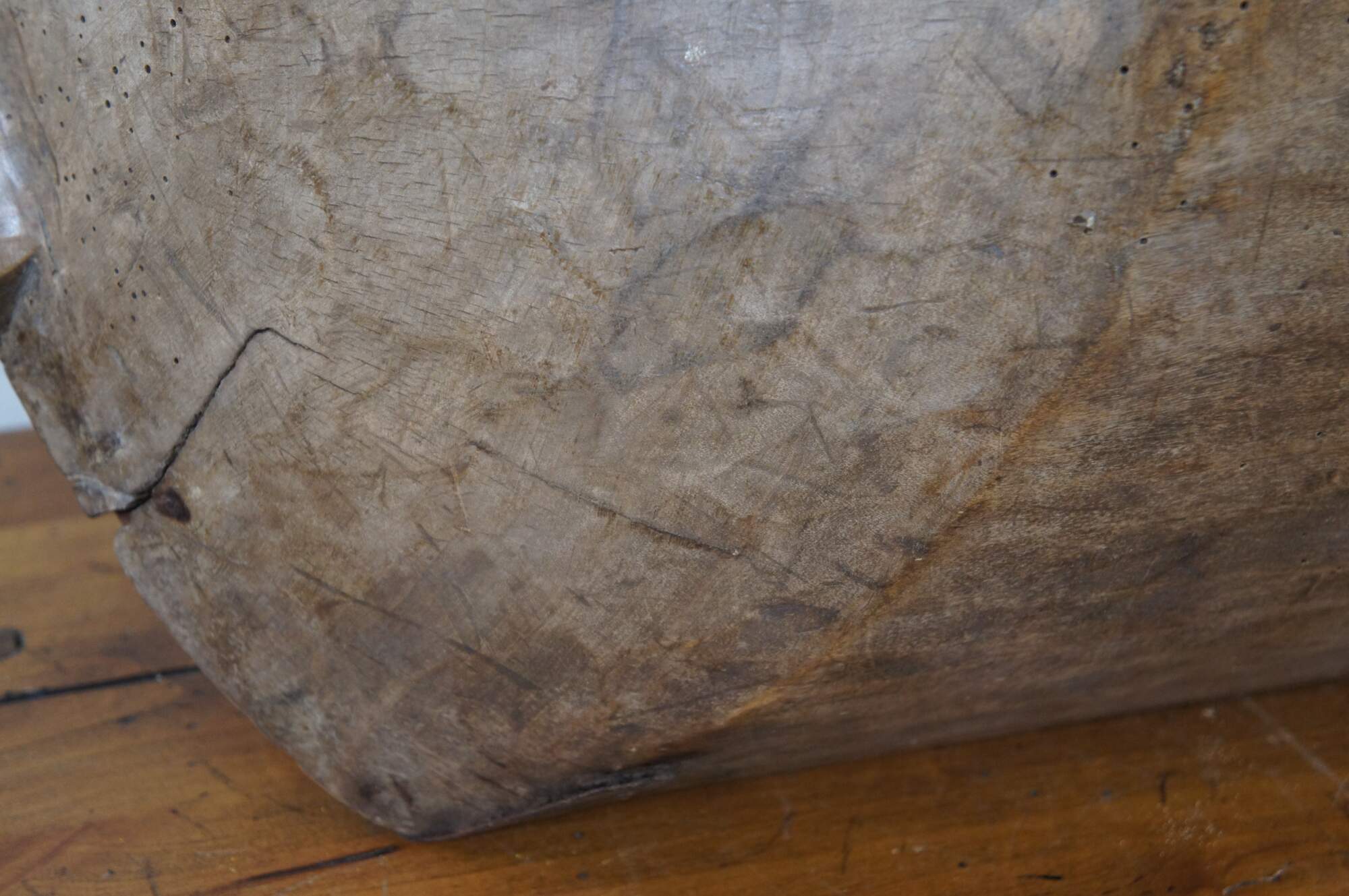 Antique, hand hewn, oversized country dough bowl / trencher featuring a rounded rectagular shape, tapered base, and iron banding / patches on the ends.