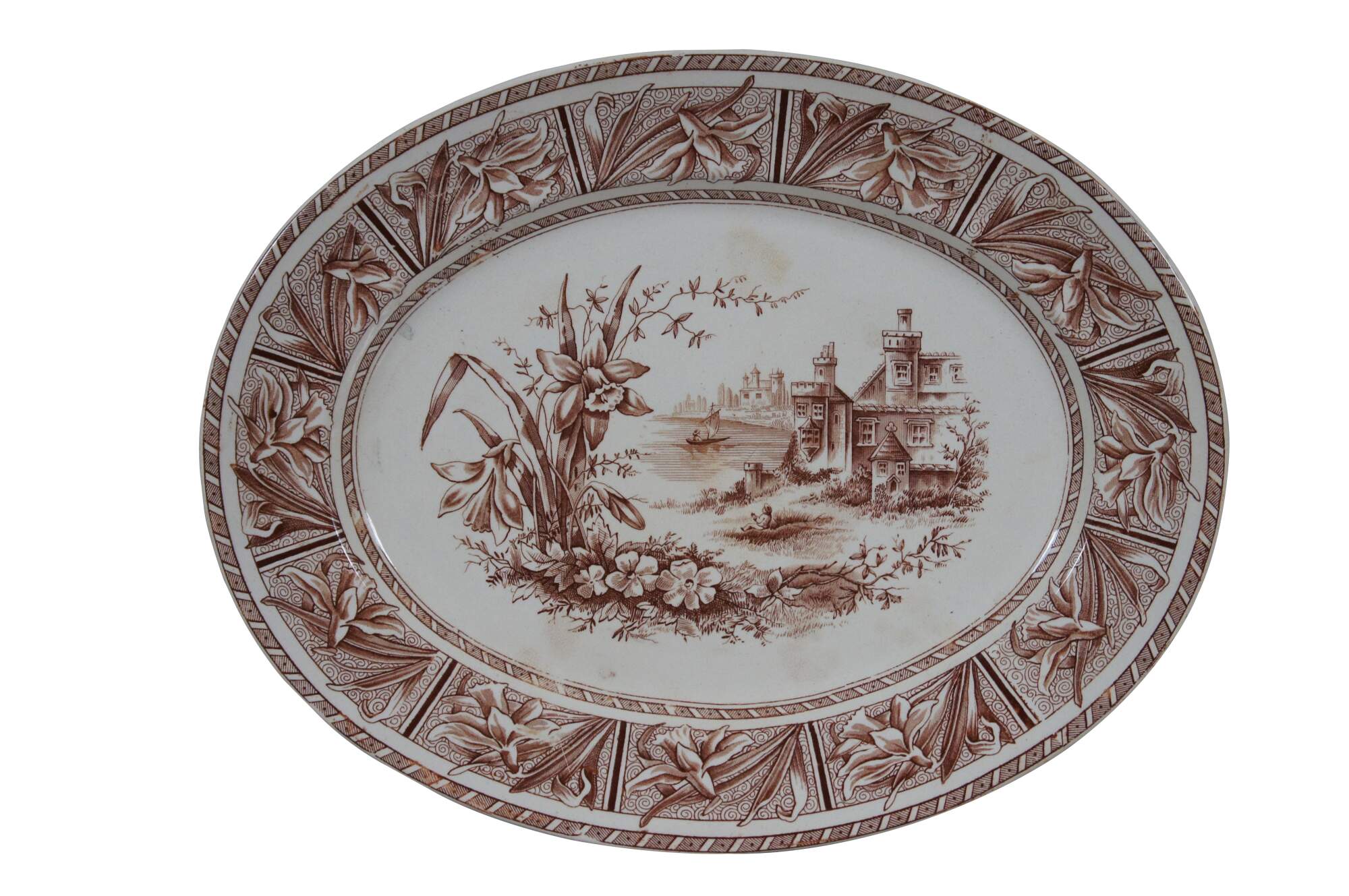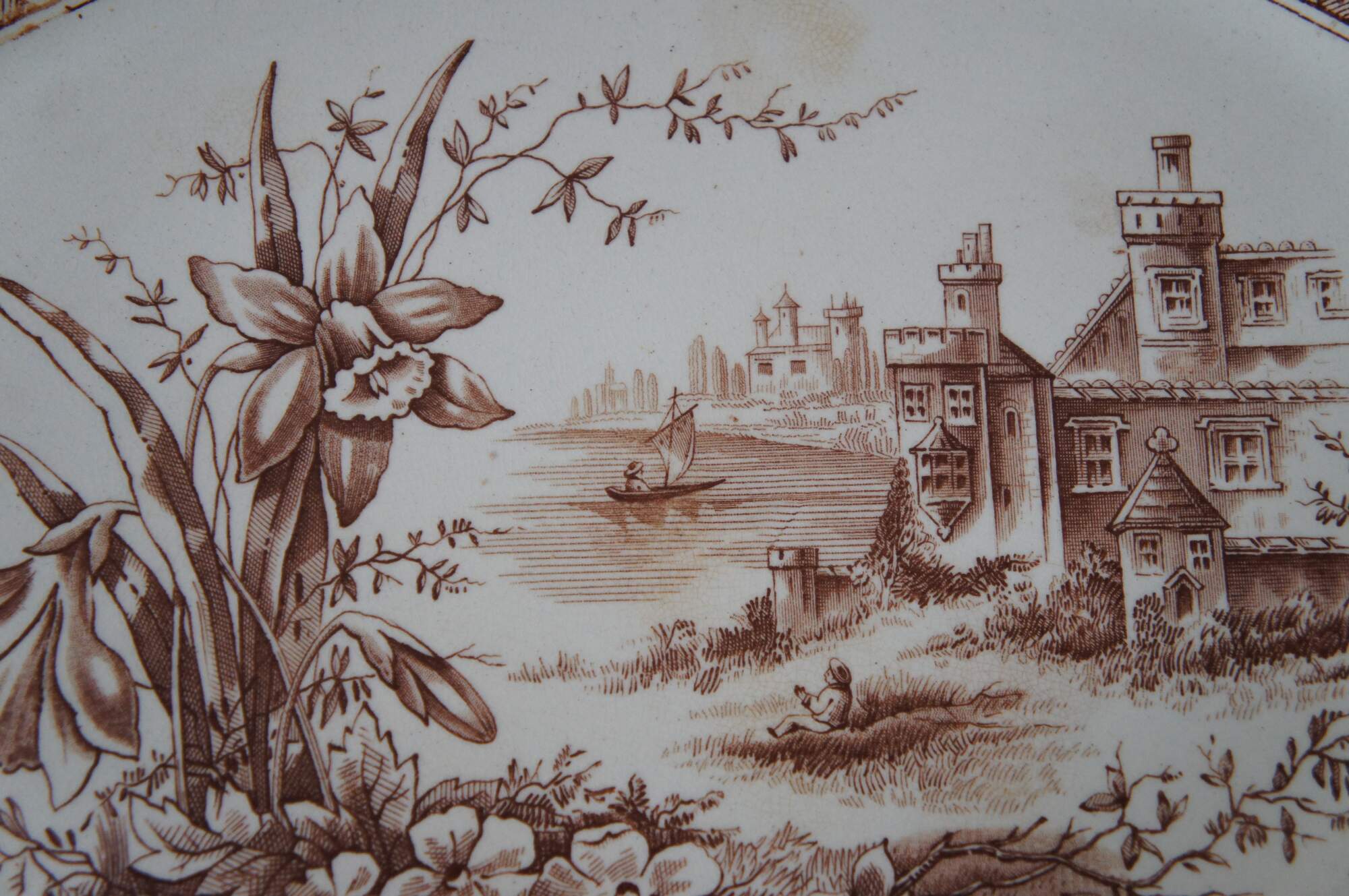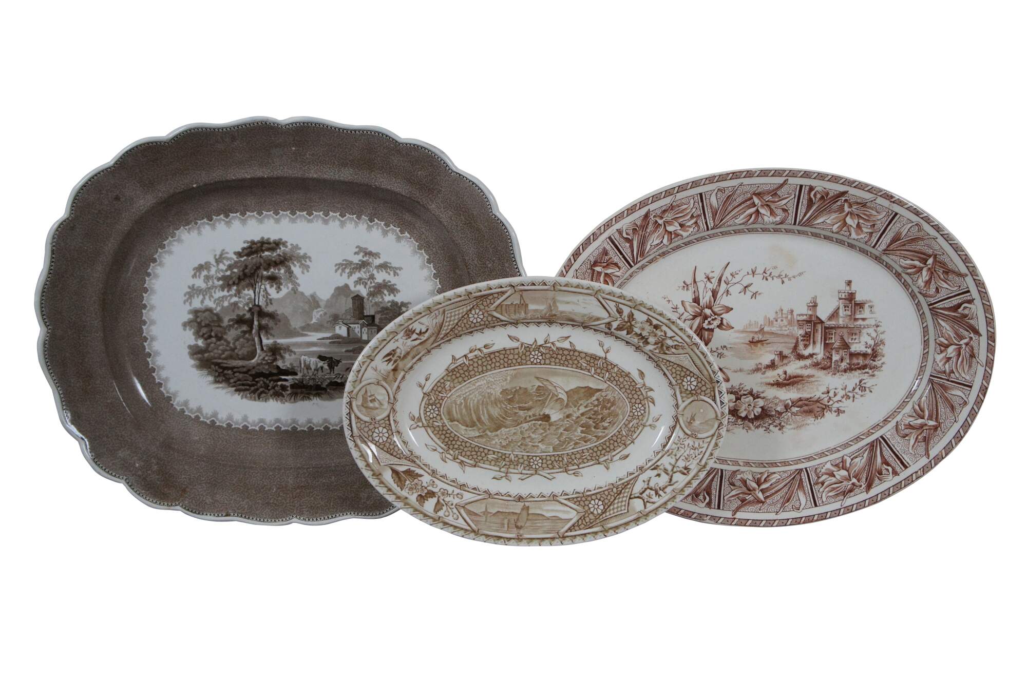 Set of three late 19th century brown transferware serving platters. One scalloped edge, rounded rectangular platter of unknown maker, marked Scroll B, showing am idyllic landscape of cows in a mountain lake surrounded by a patterned border. Oval platter by W.H. Grindley & Co in the Daffodil pattern, design registered 7 January 1877, showing a small country castle by a lake, with daffodils in the foreground and bordering the edge. One small oval platter by G.W. Turner & sons circa 1873-1895 in the Phileau pattern, showing a boat being tossed on the sea, surrounded by a border of Chinoiserie patterns, birds, and flowers.