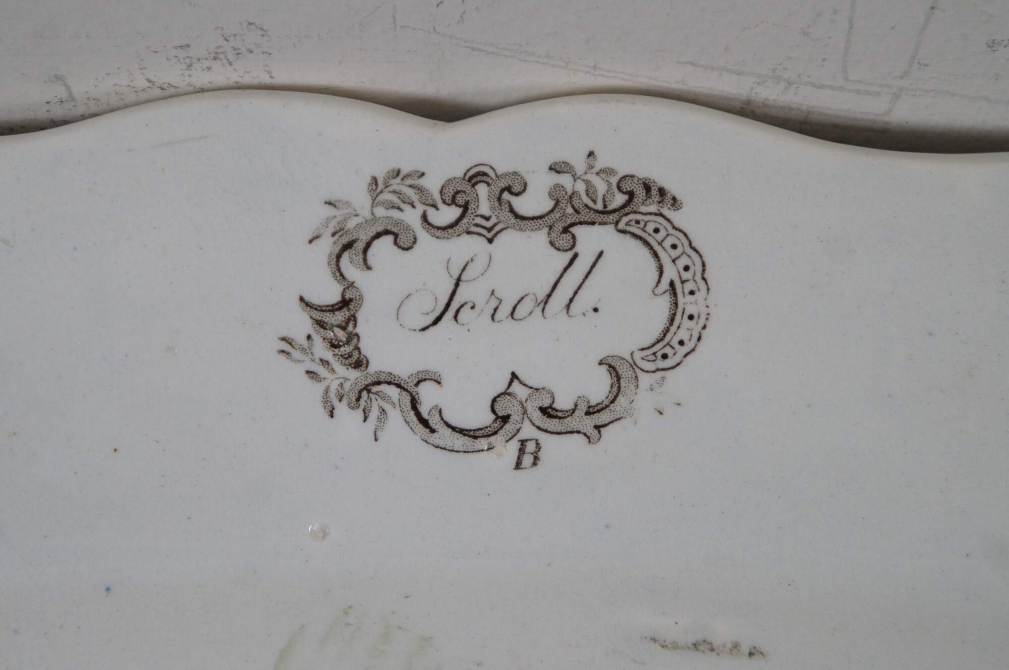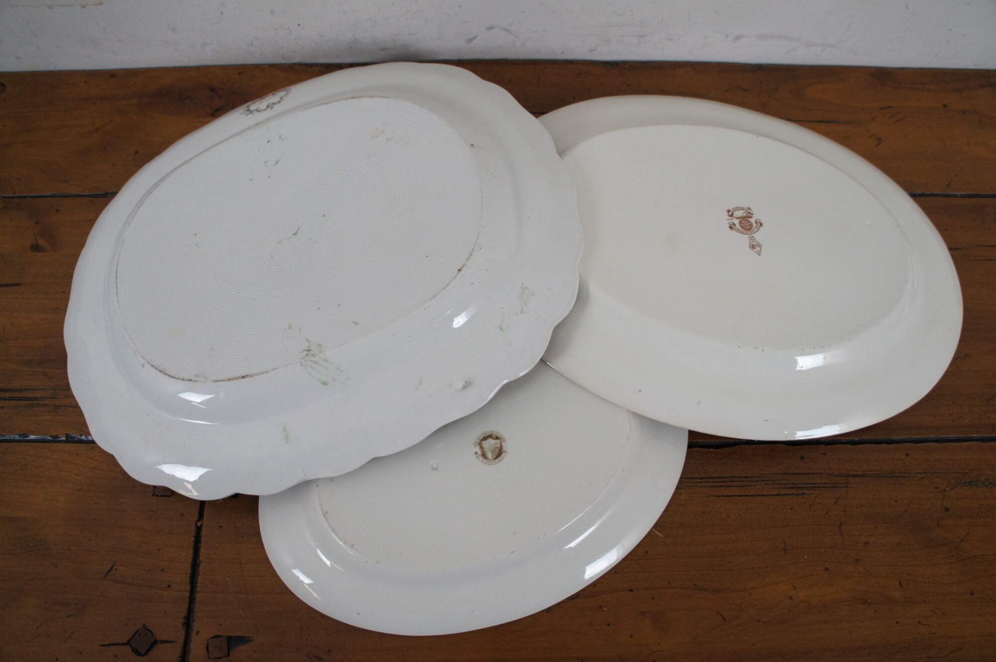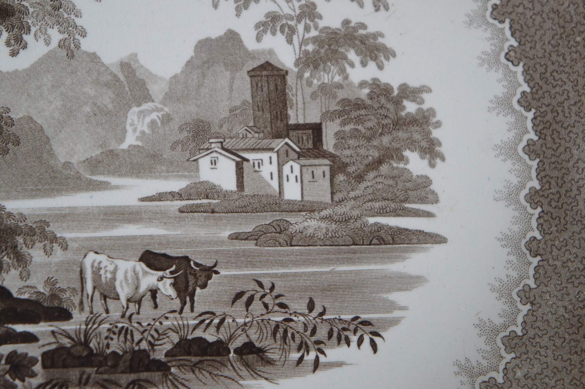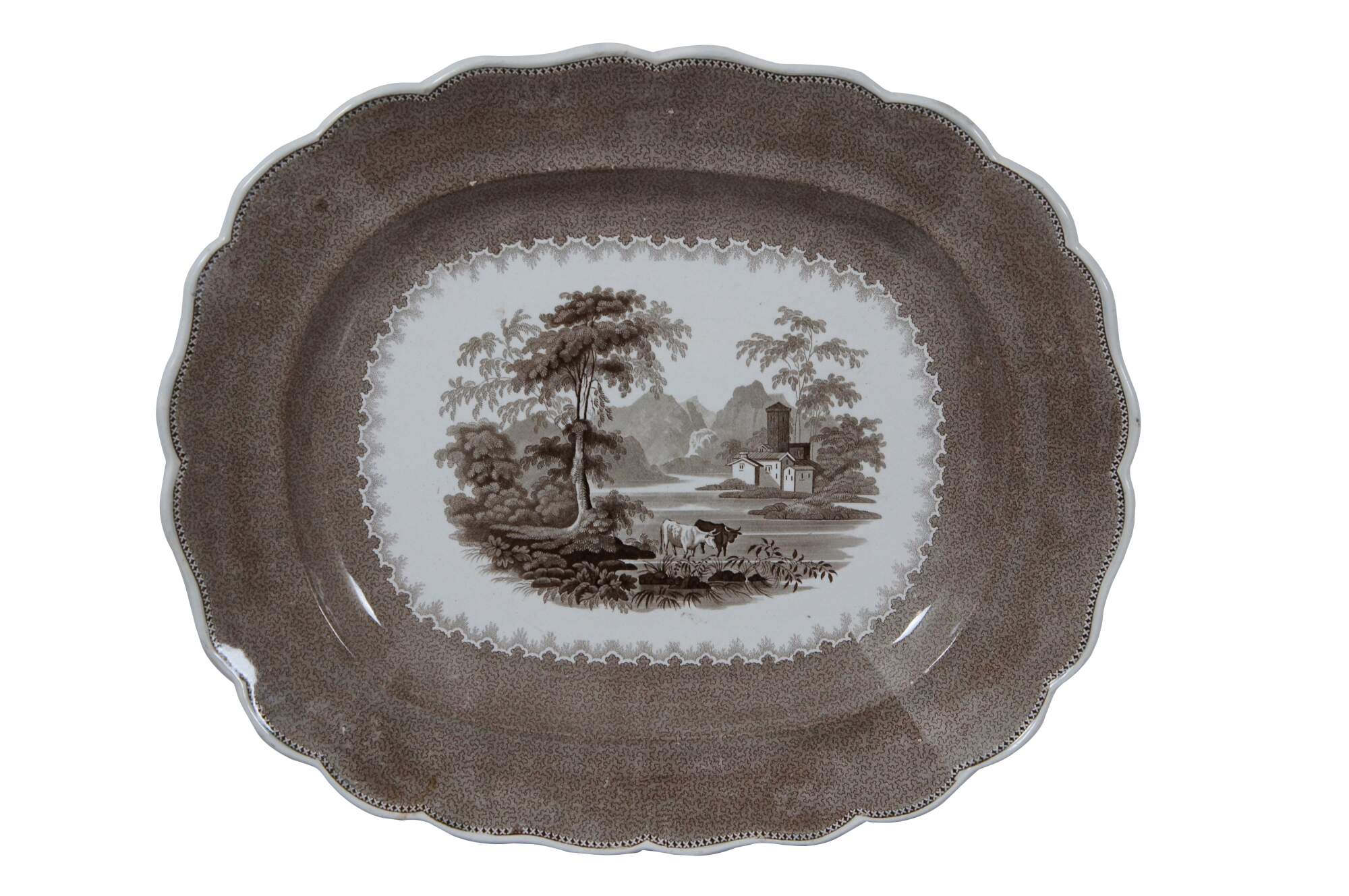 Set of three late 19th century brown transferware serving platters. One scalloped edge, rounded rectangular platter of unknown maker, marked Scroll B, showing am idyllic landscape of cows in a mountain lake surrounded by a patterned border. Oval platter by W.H. Grindley & Co in the Daffodil pattern, design registered 7 January 1877, showing a small country castle by a lake, with daffodils in the foreground and bordering the edge. One small oval platter by G.W. Turner & sons circa 1873-1895 in the Phileau pattern, showing a boat being tossed on the sea, surrounded by a border of Chinoiserie patterns, birds, and flowers.