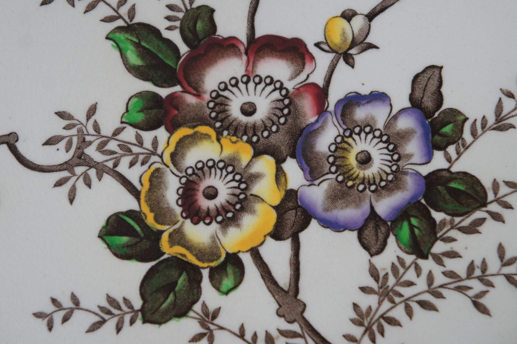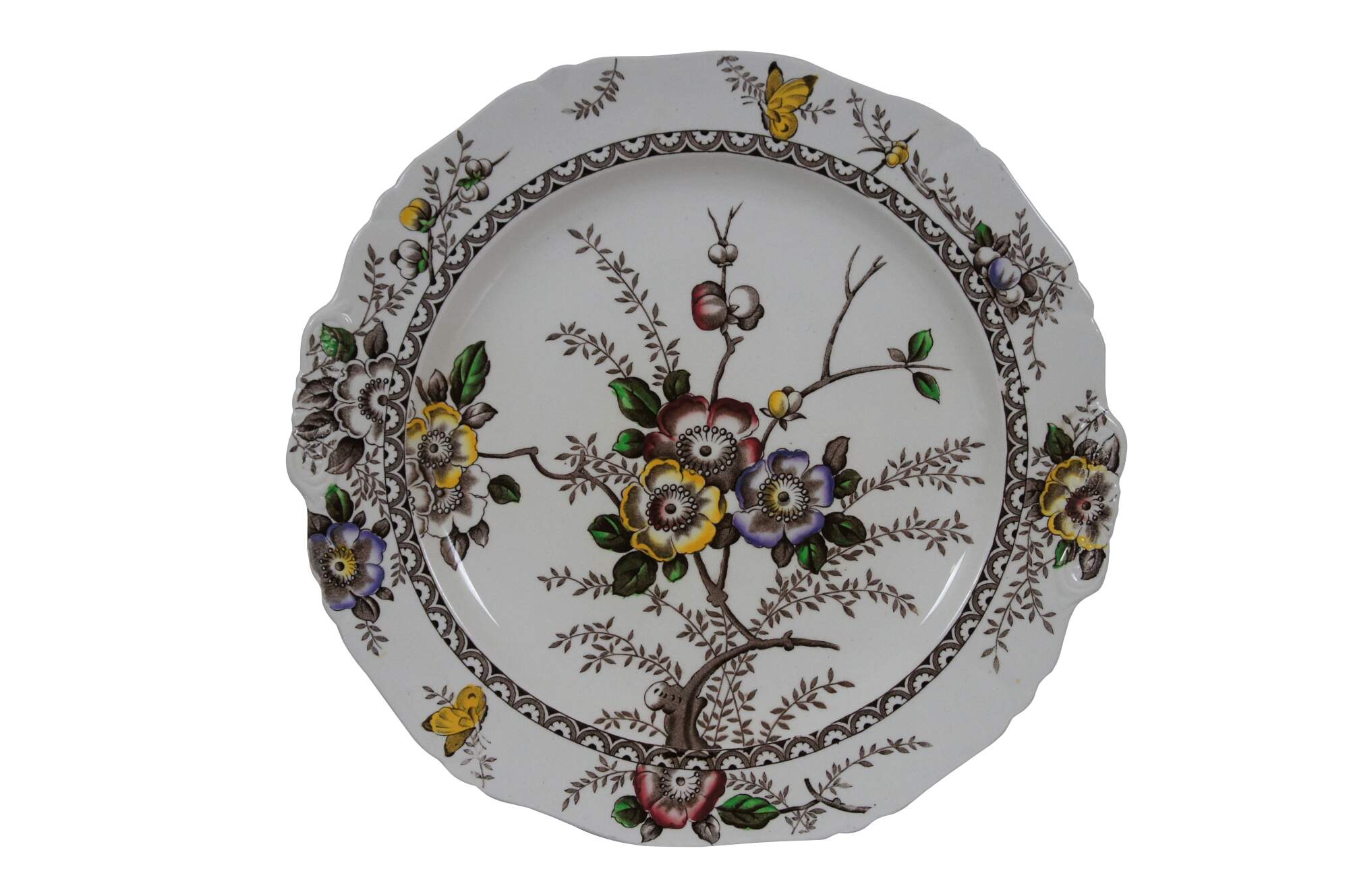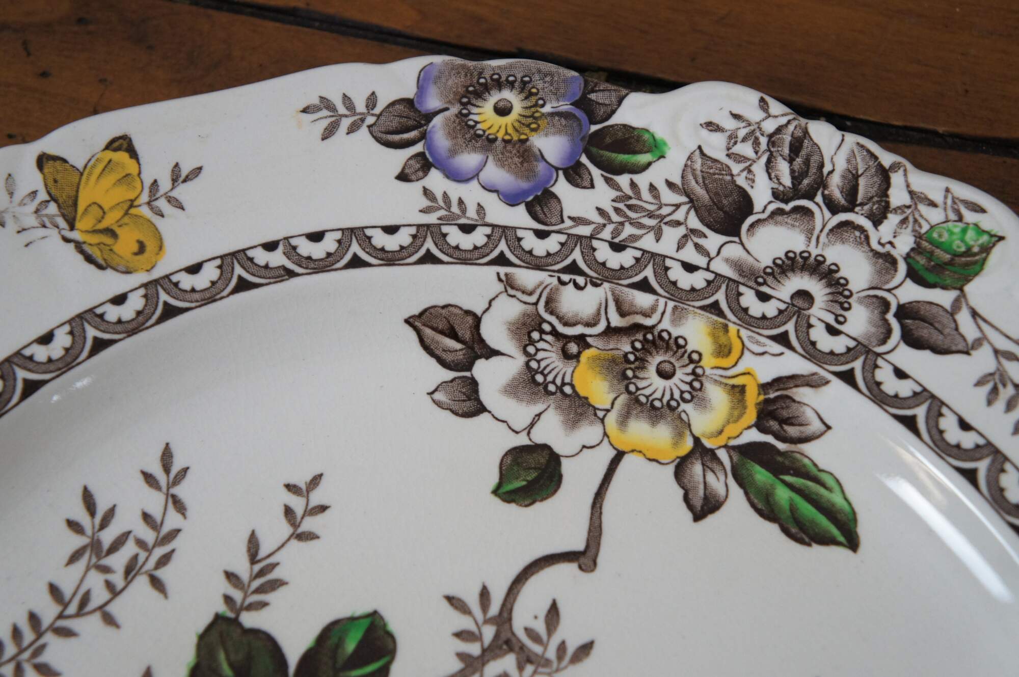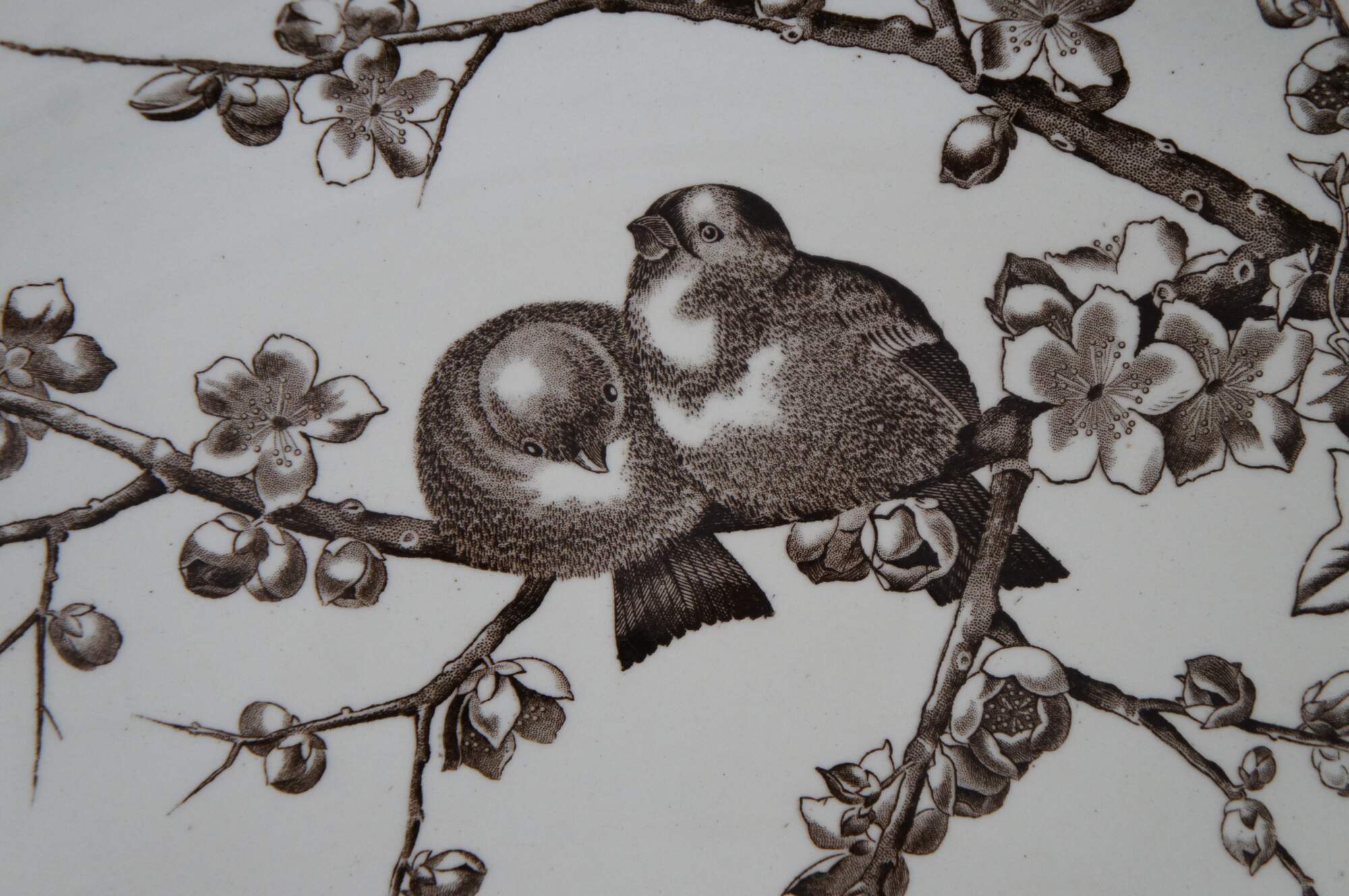 Pair of late 19th century brown transferware ceramic serving platters. One oval platter by George Jones & Sons in the Almonds pattern, showing a pair of birds perched on flowering almond branches. And one round platter by Alfred Meakin in Medway Decor, showing flowering branches and butterflies with multi-colored details.