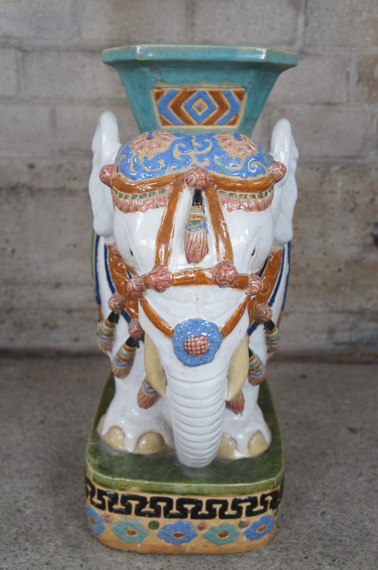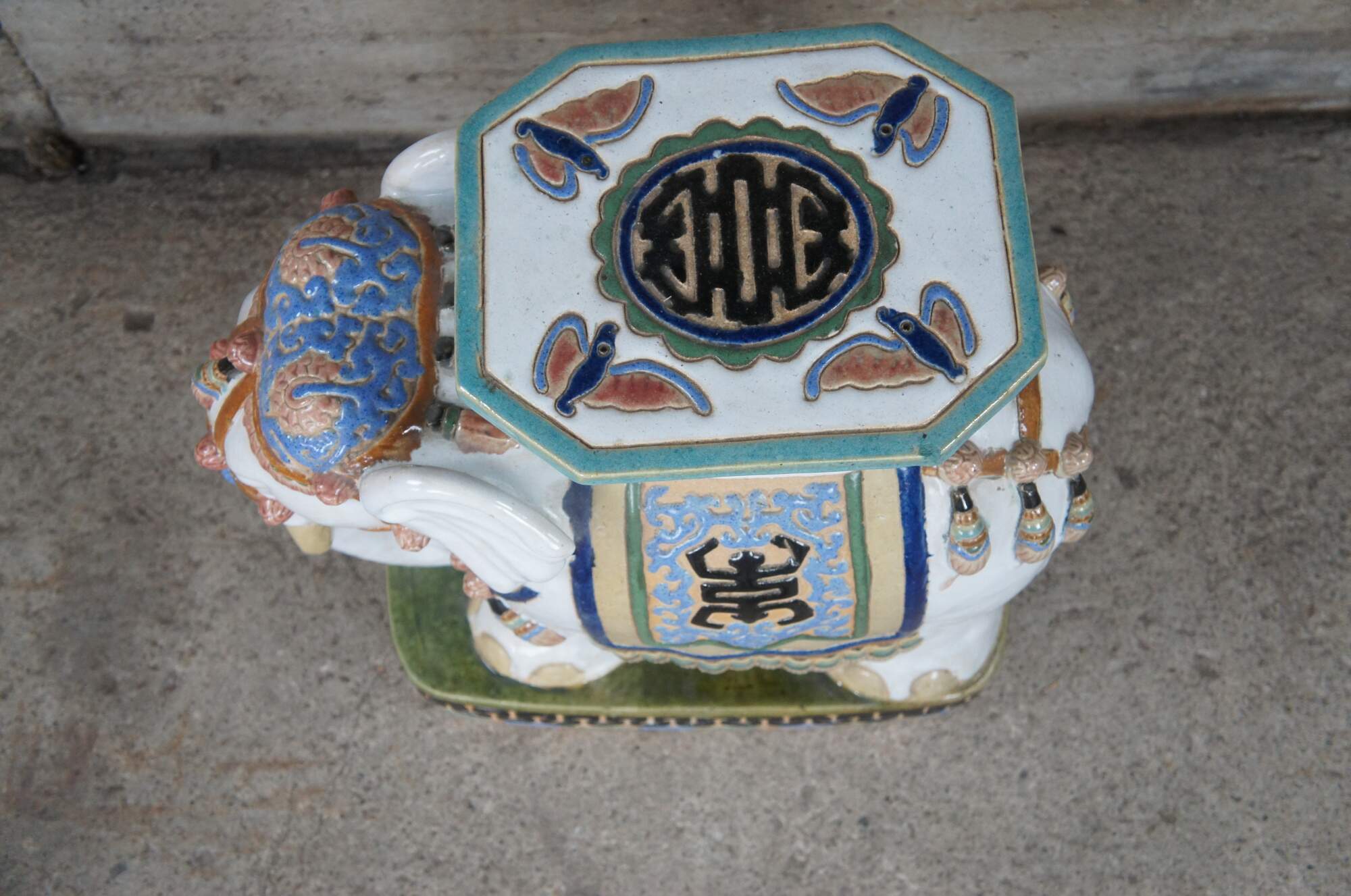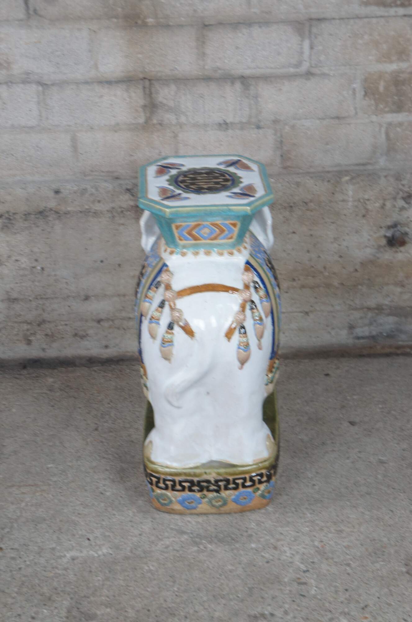 Vintage faience glazed ceramic polychrome elephant garden stool, seat or side table. Circa 1960s.