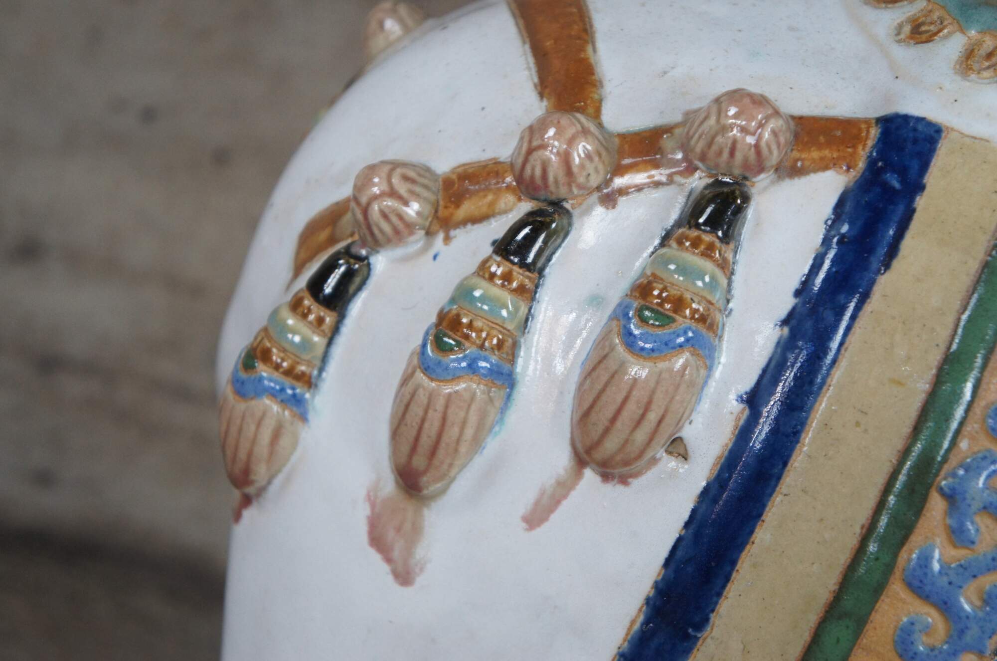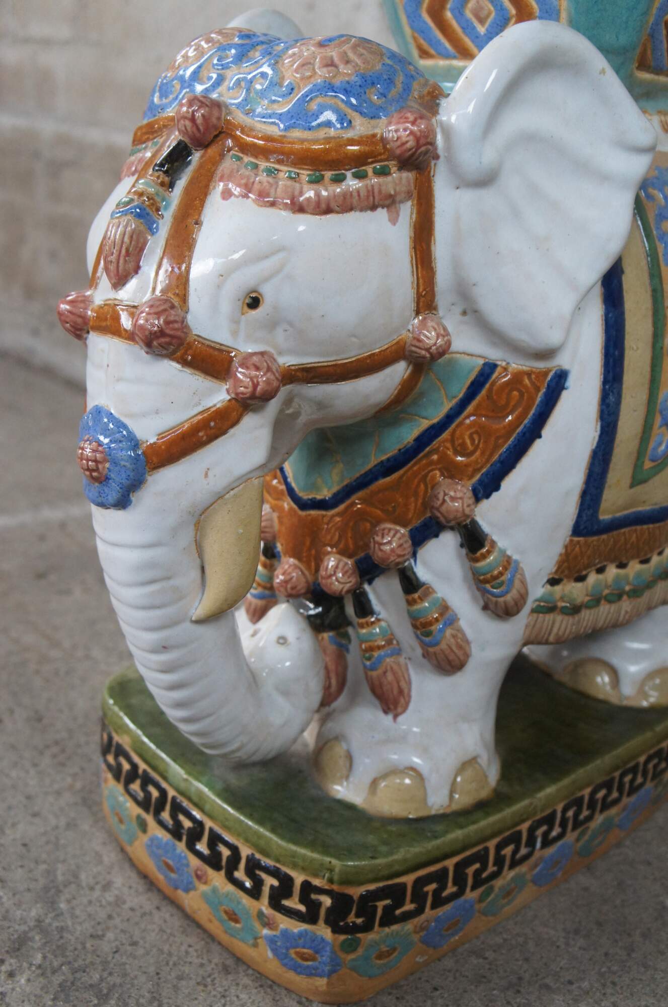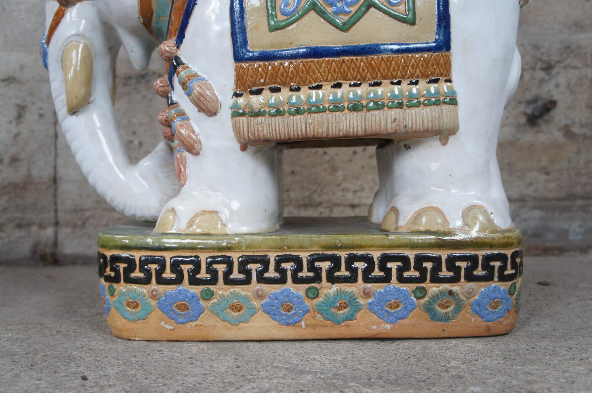 Vintage faience glazed ceramic polychrome elephant garden stool, seat or side table. Circa 1960s.