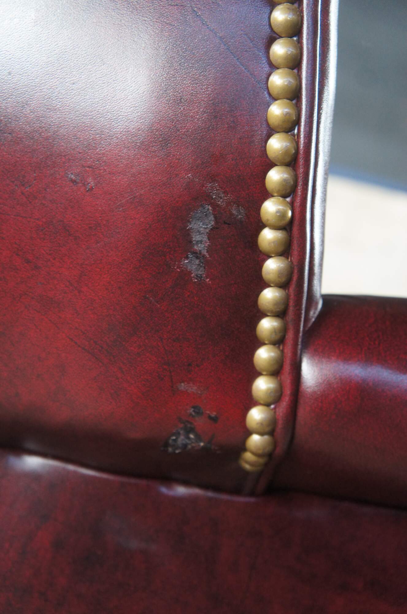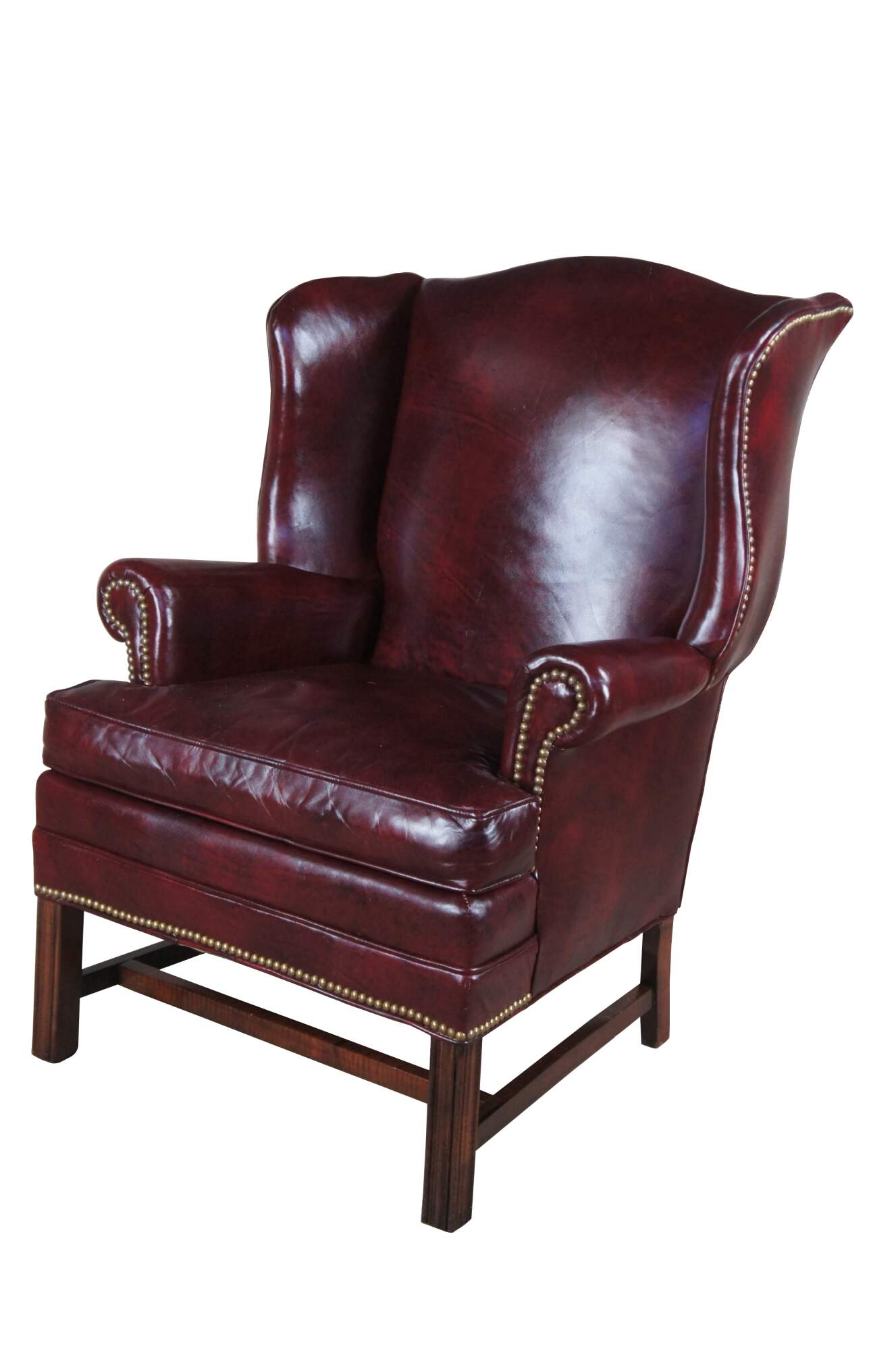 Vintage Bracewell Furniture Co leather wingback armchairs featuring serpentine Chippendale styling with dark red / burgundy leather, nailhead trim, rolled arms and mahogany legs. Conover North Carolina. Lackawanna Leather Co.