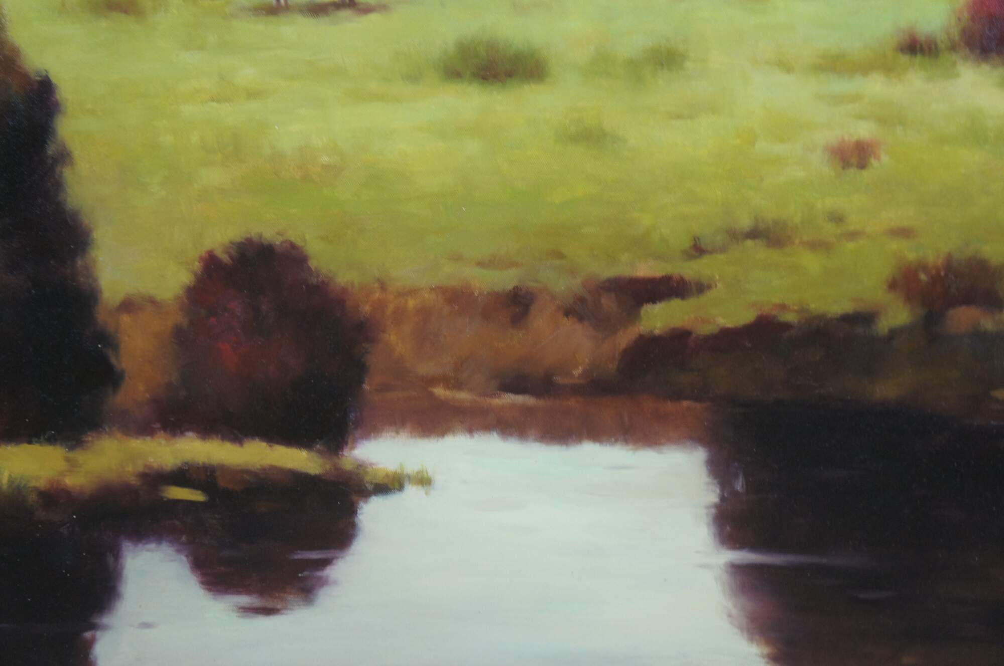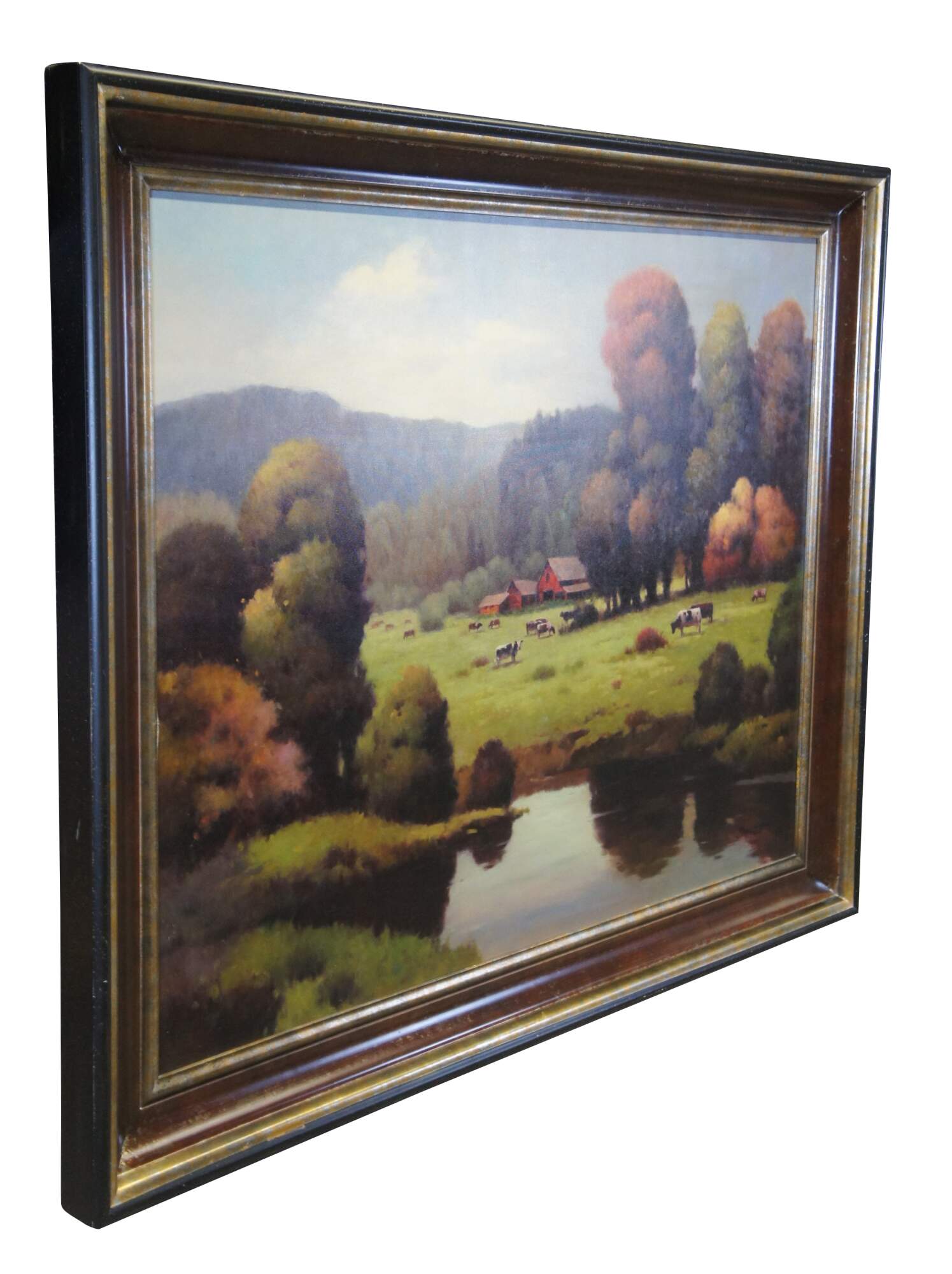 A very large and impressive Autumn landscape oil painting on canvas featuring a densly wooded countryside farm with cows grazing in the fields and red barns / farmhouses. Signed lower right by Bonnatt. From the private collection of Gene Zimmerman, Dayton, Ohio.
