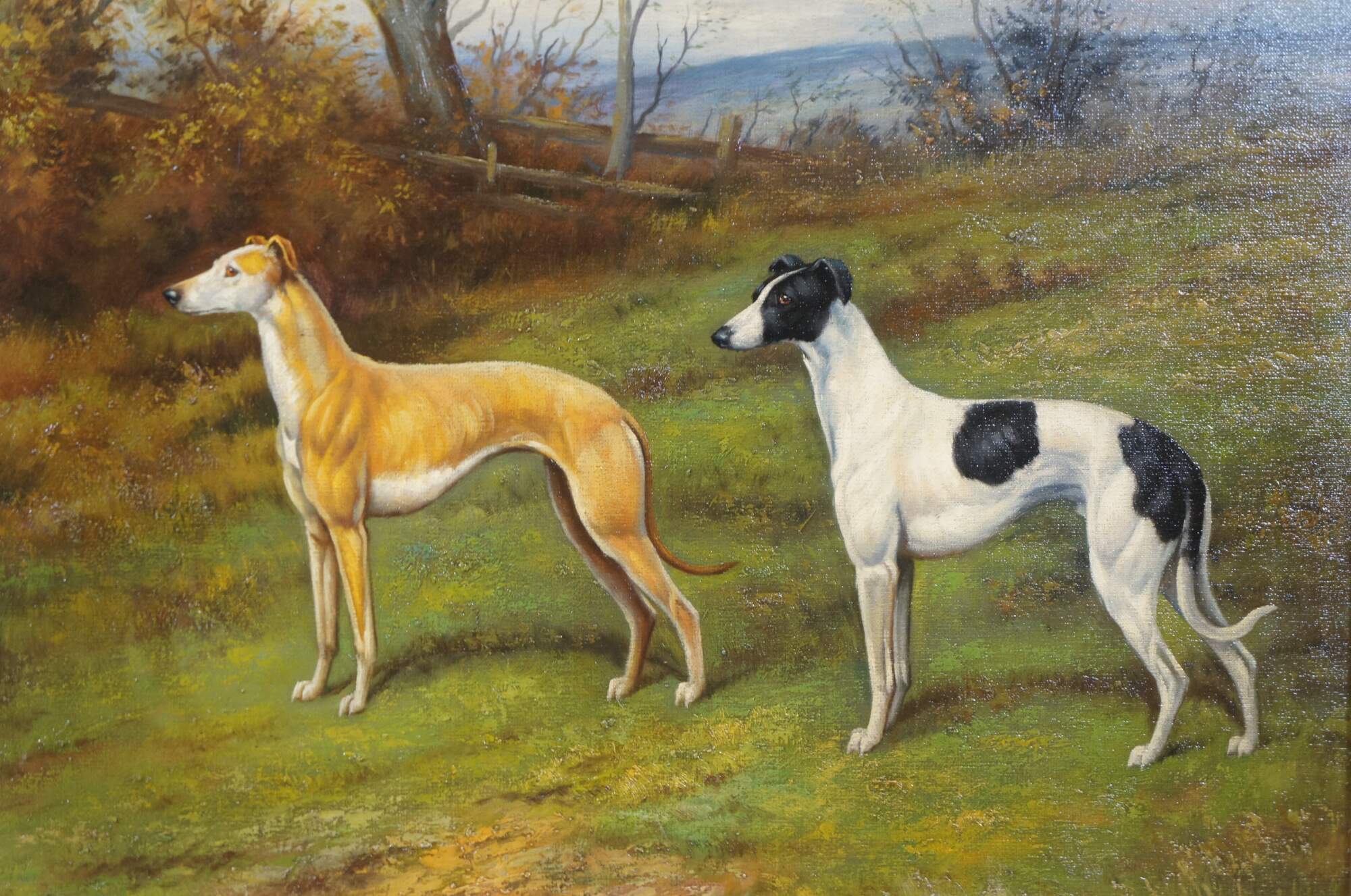Vintage landscape portrait oil painting on canvas featuring a pair of Greyhound / Whippet dogs standing in the field with view of the countryside. Signed lower left Bob. Framed in ebonized, burled gold frame.