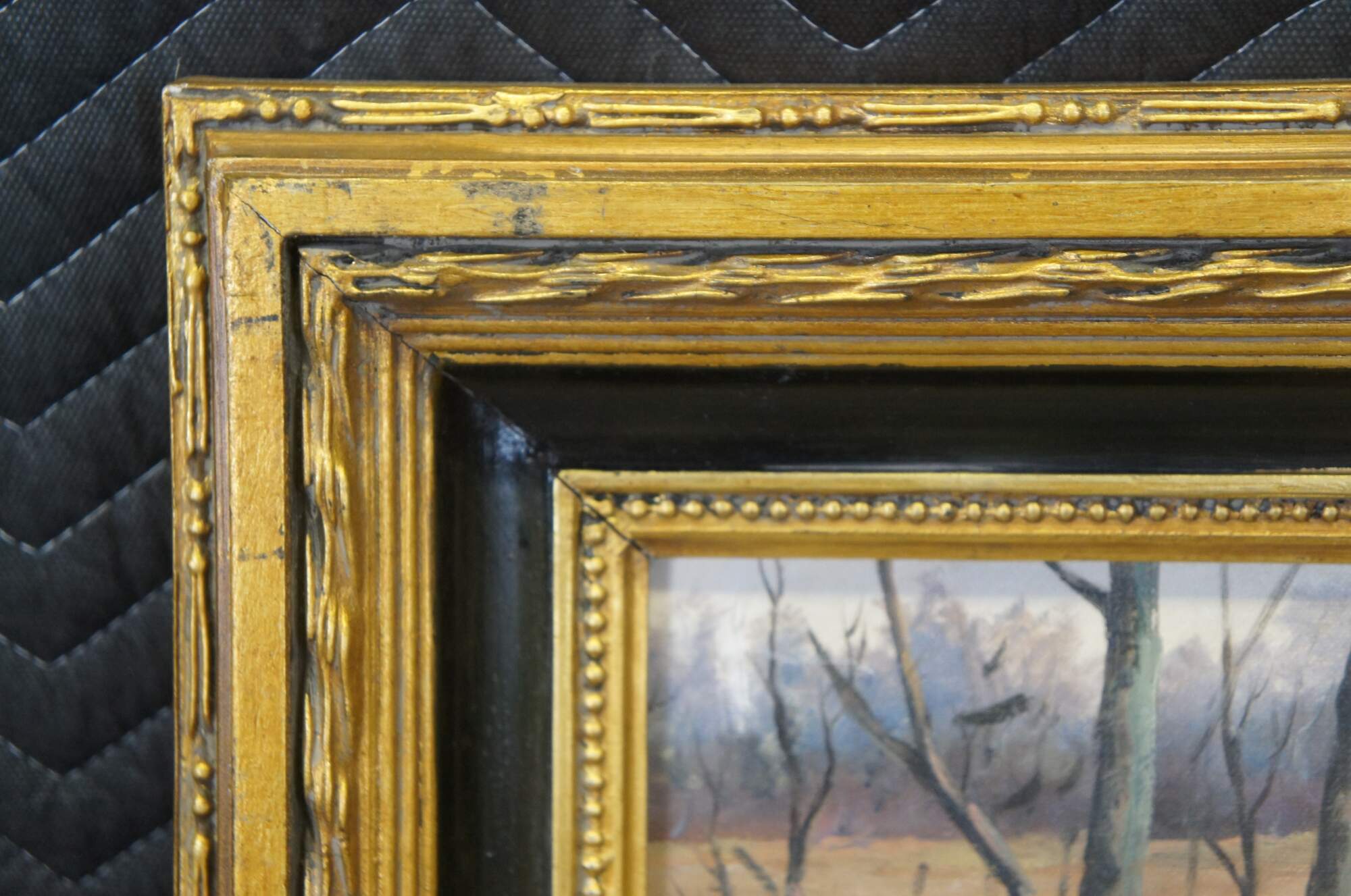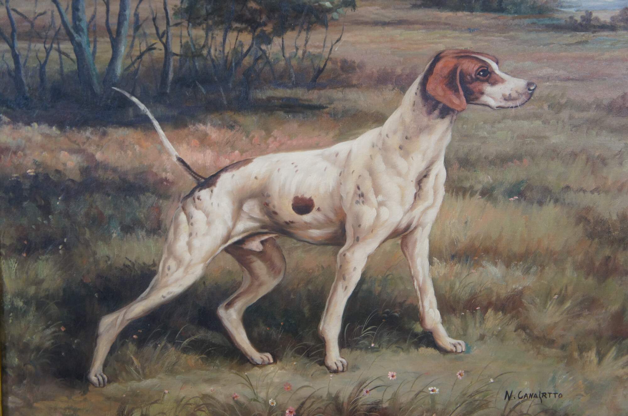 Vintage oil painting on canvas featuring a portrait of a pointing hunting dog / foxhound in the field / countryside. Signed by artist lower right. Framed in ebonized gold frame.