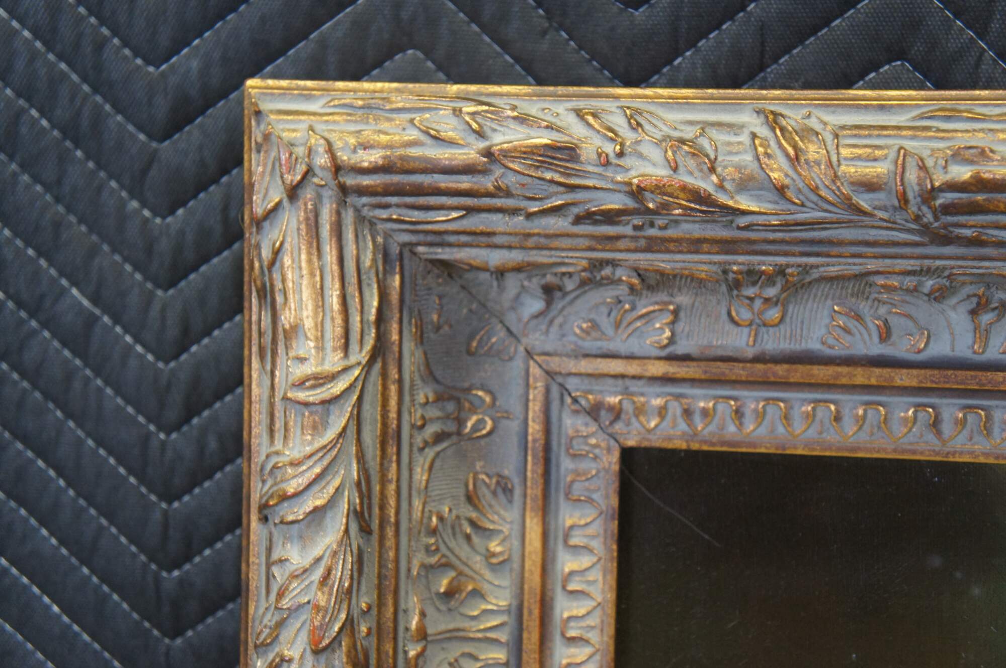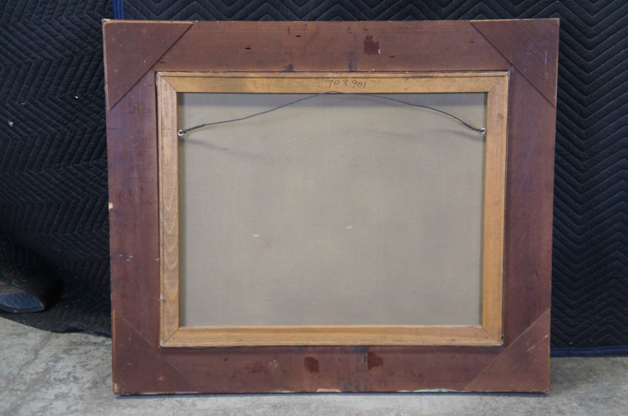 Vintage Bluhm still life oil painting on canvas featuring a bunny / rabbit next to a spread of lettuce, pears, peaches, gords / pumpkin, wine and grapevines on an old farmhouse table. Signed lower right. Framed in gold frame with leaves and floral motif.