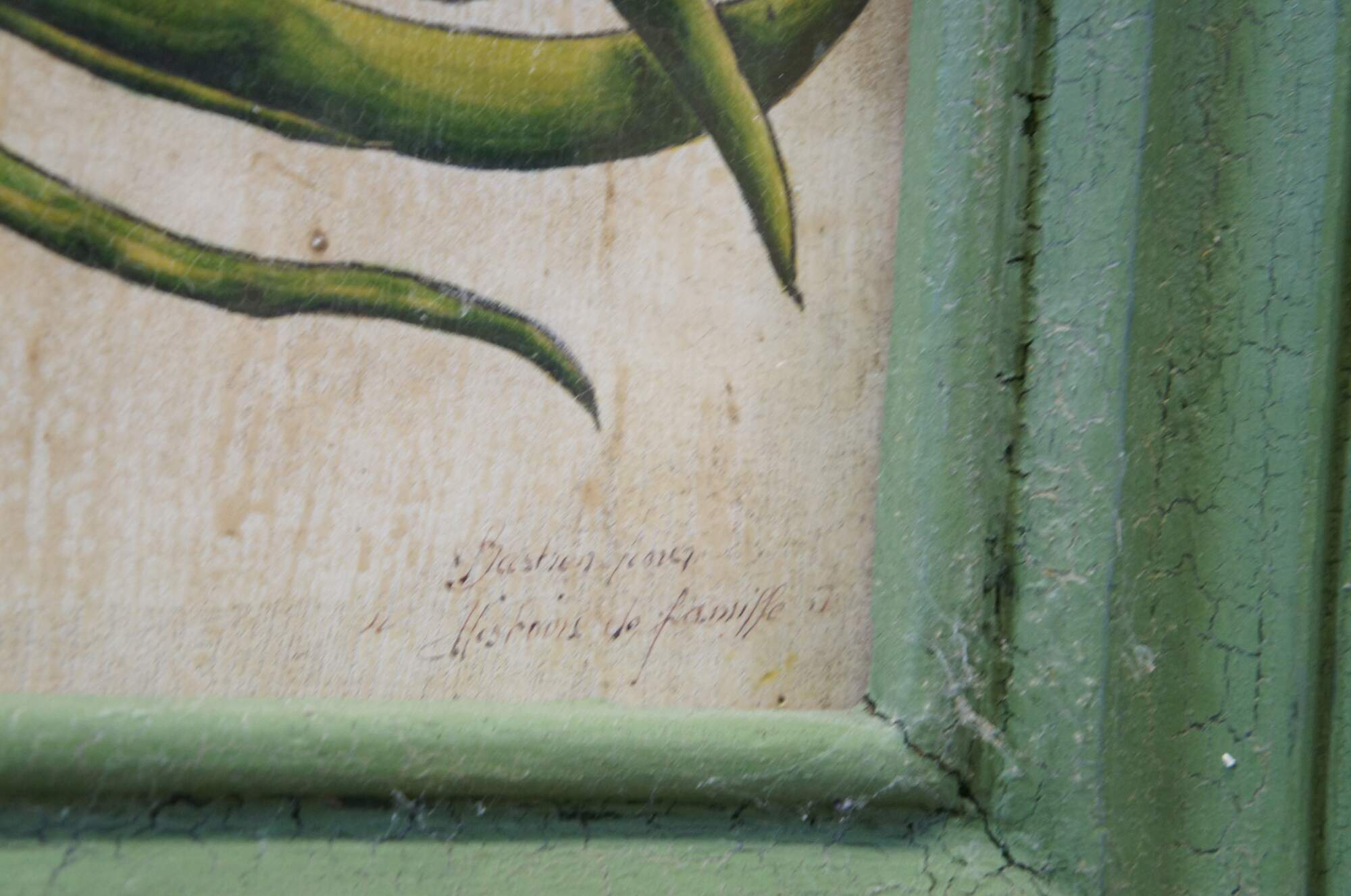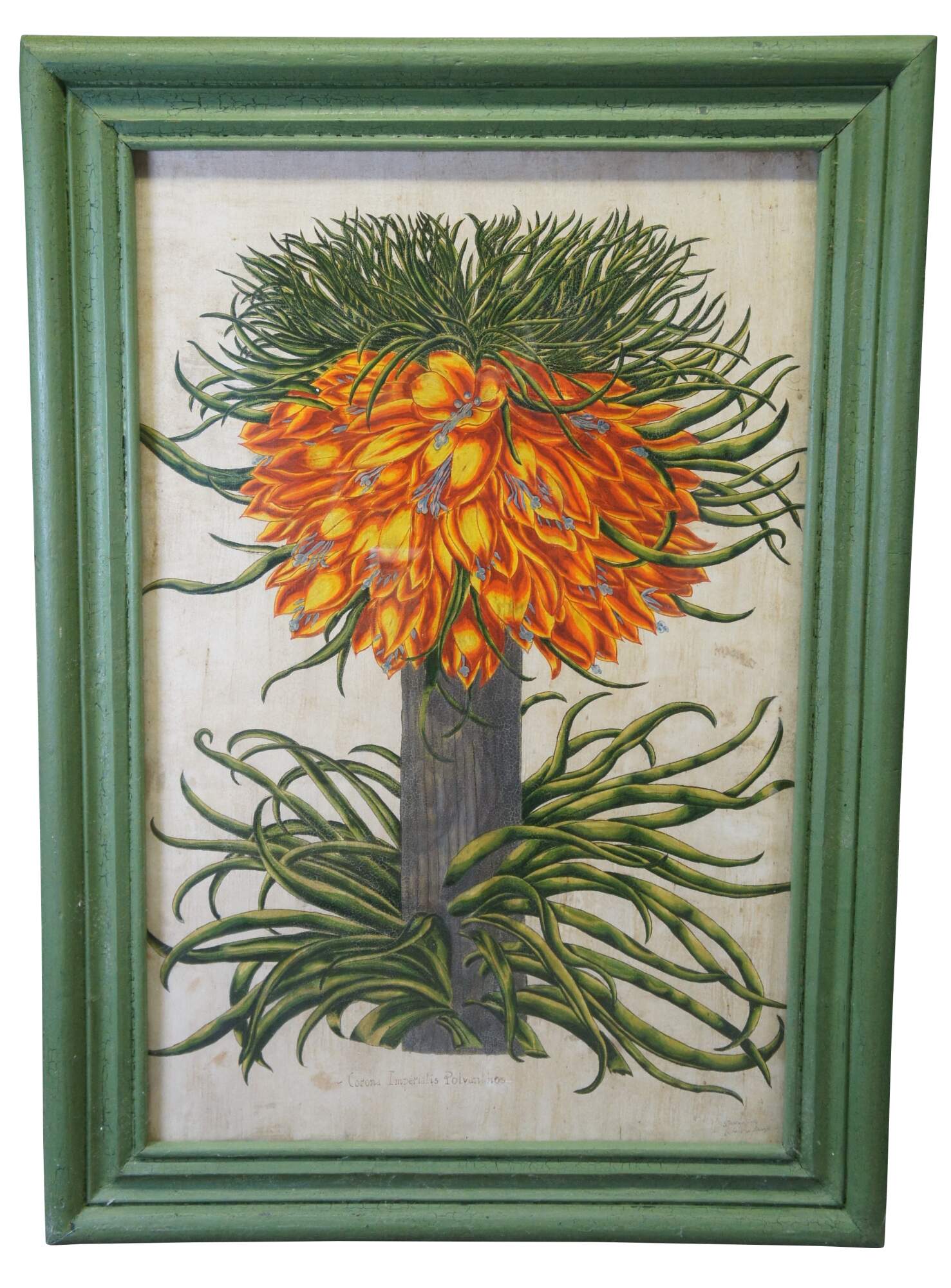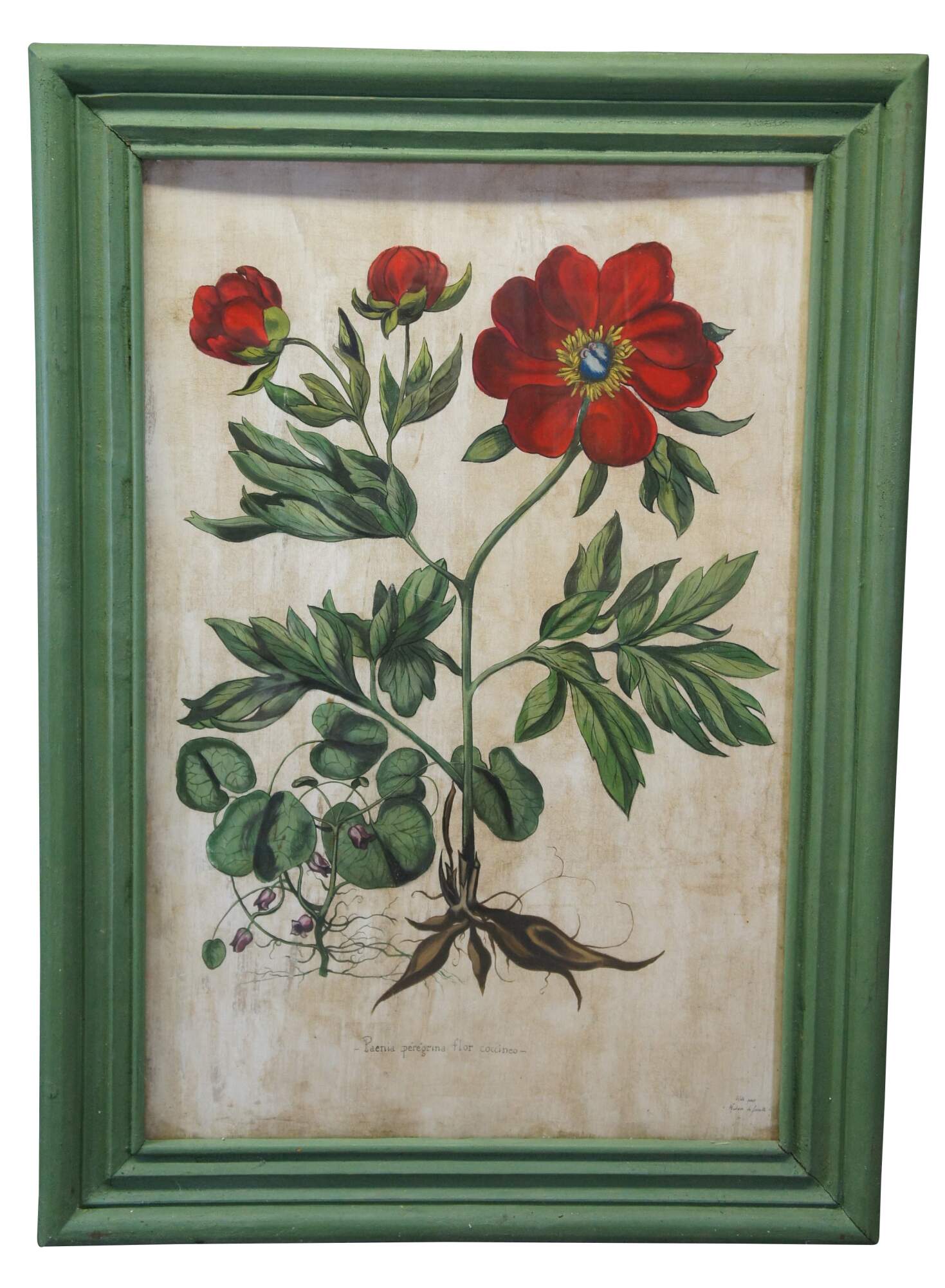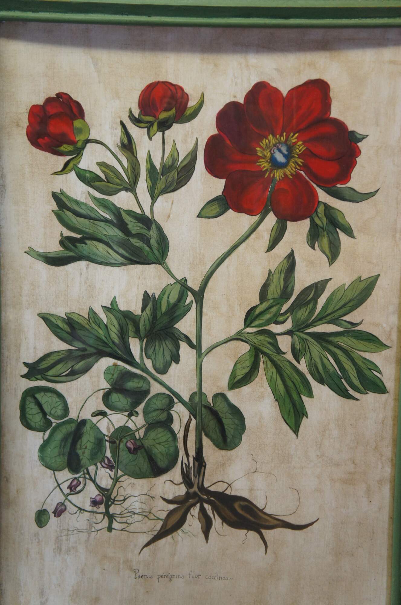 A pair of impressive vibrant hand painted botanical still life florals, featuring Paenia peregrina flor coccineo and Corona imperialis polyanthos. Painted on a thin board, framed behind glass in green crackle painted frame. Purchased from an Antique shop in France in the 1990s.