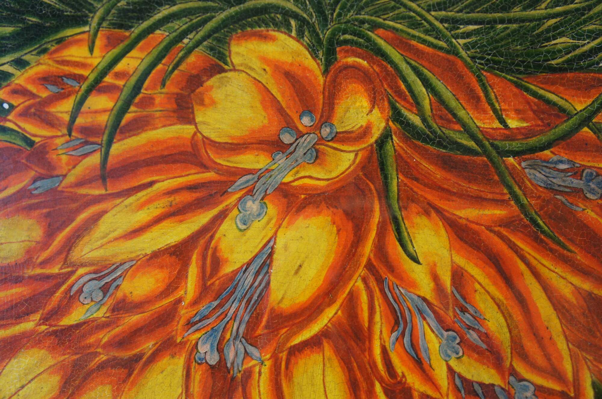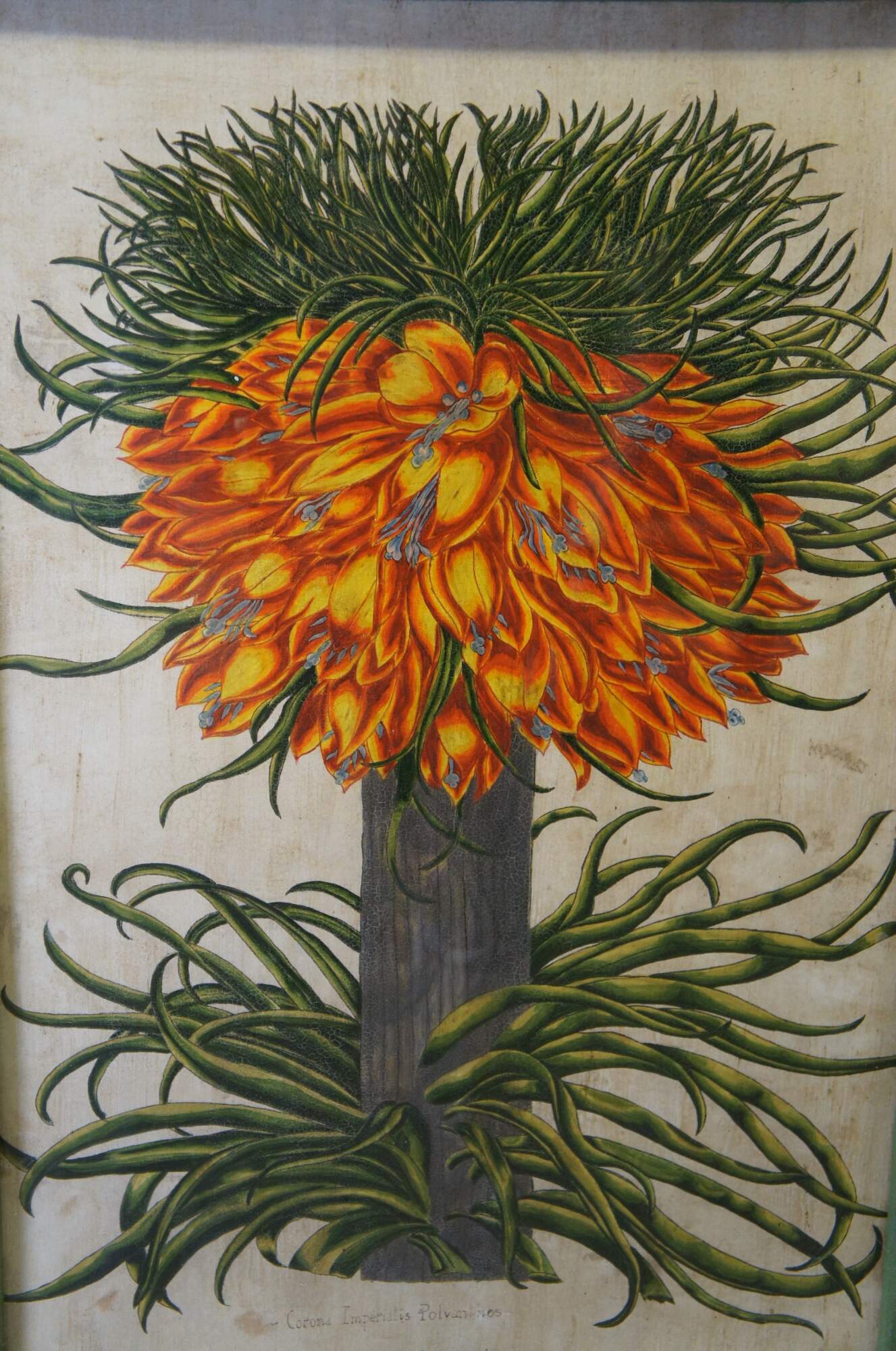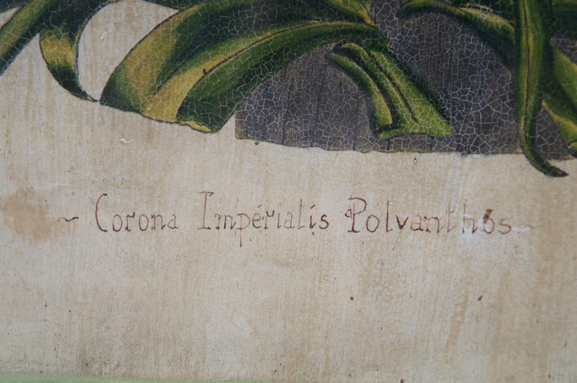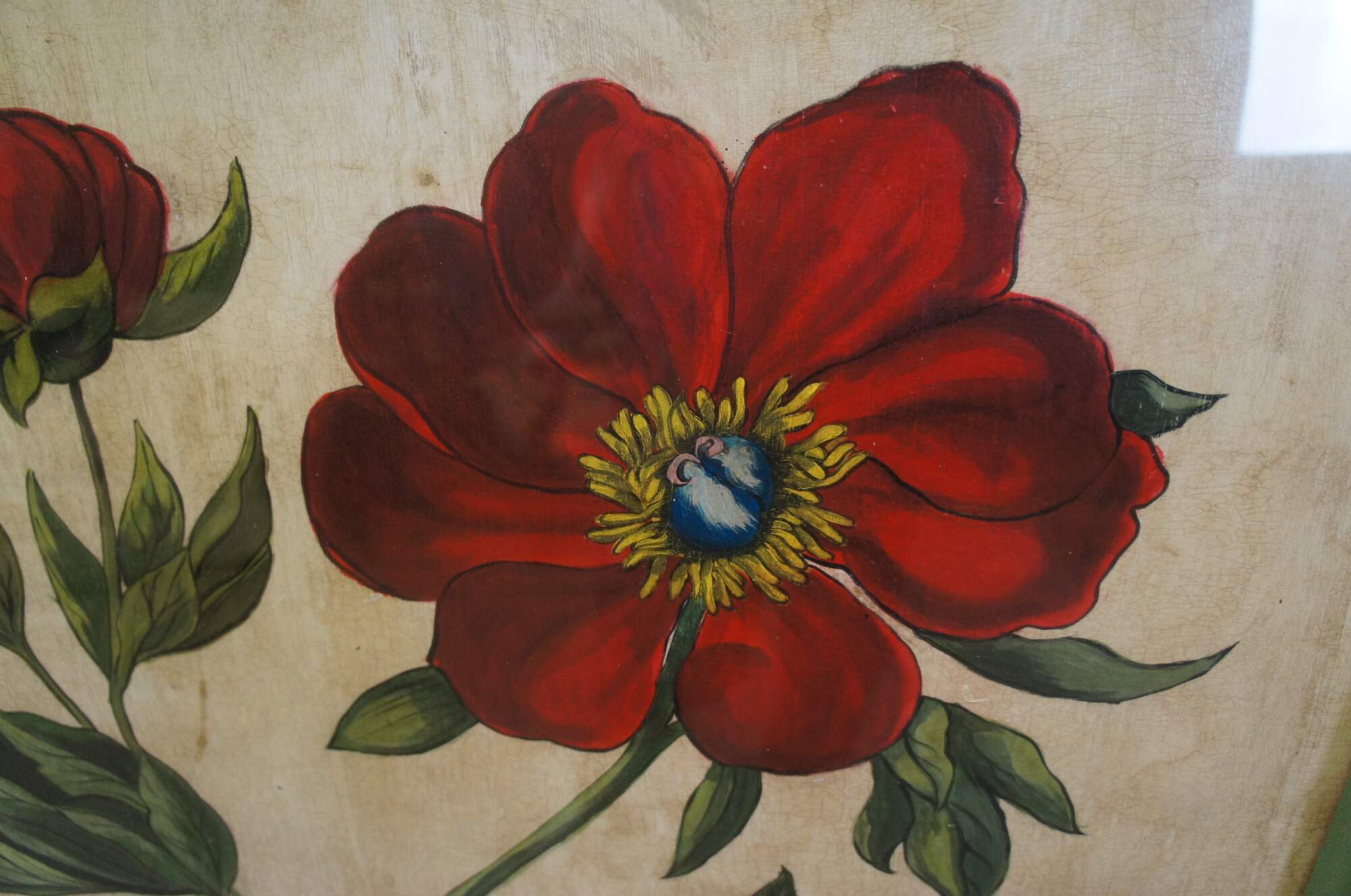 A pair of impressive vibrant hand painted botanical still life florals, featuring Paenia peregrina flor coccineo and Corona imperialis polyanthos. Painted on a thin board, framed behind glass in green crackle painted frame. Purchased from an Antique shop in France in the 1990s.