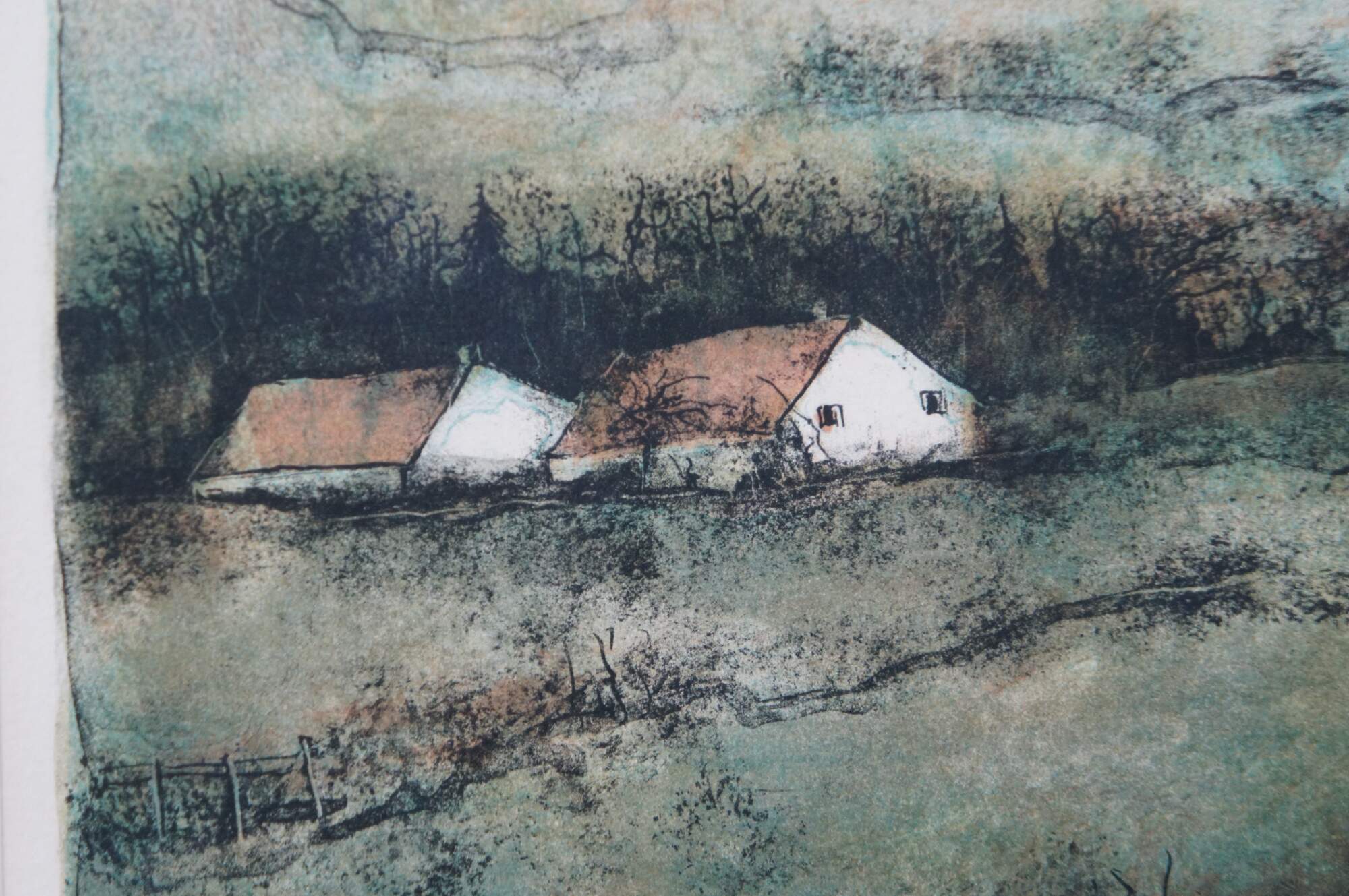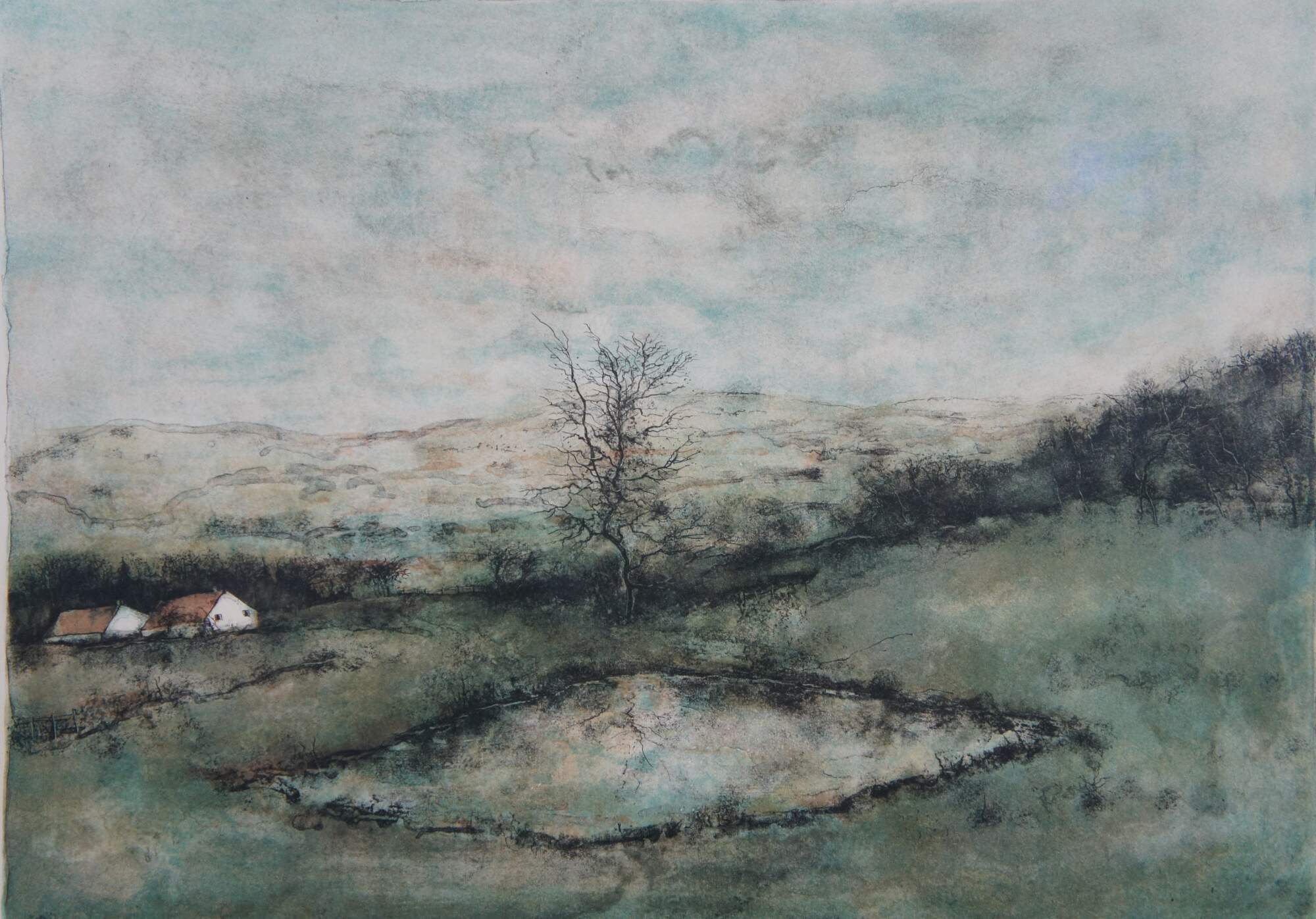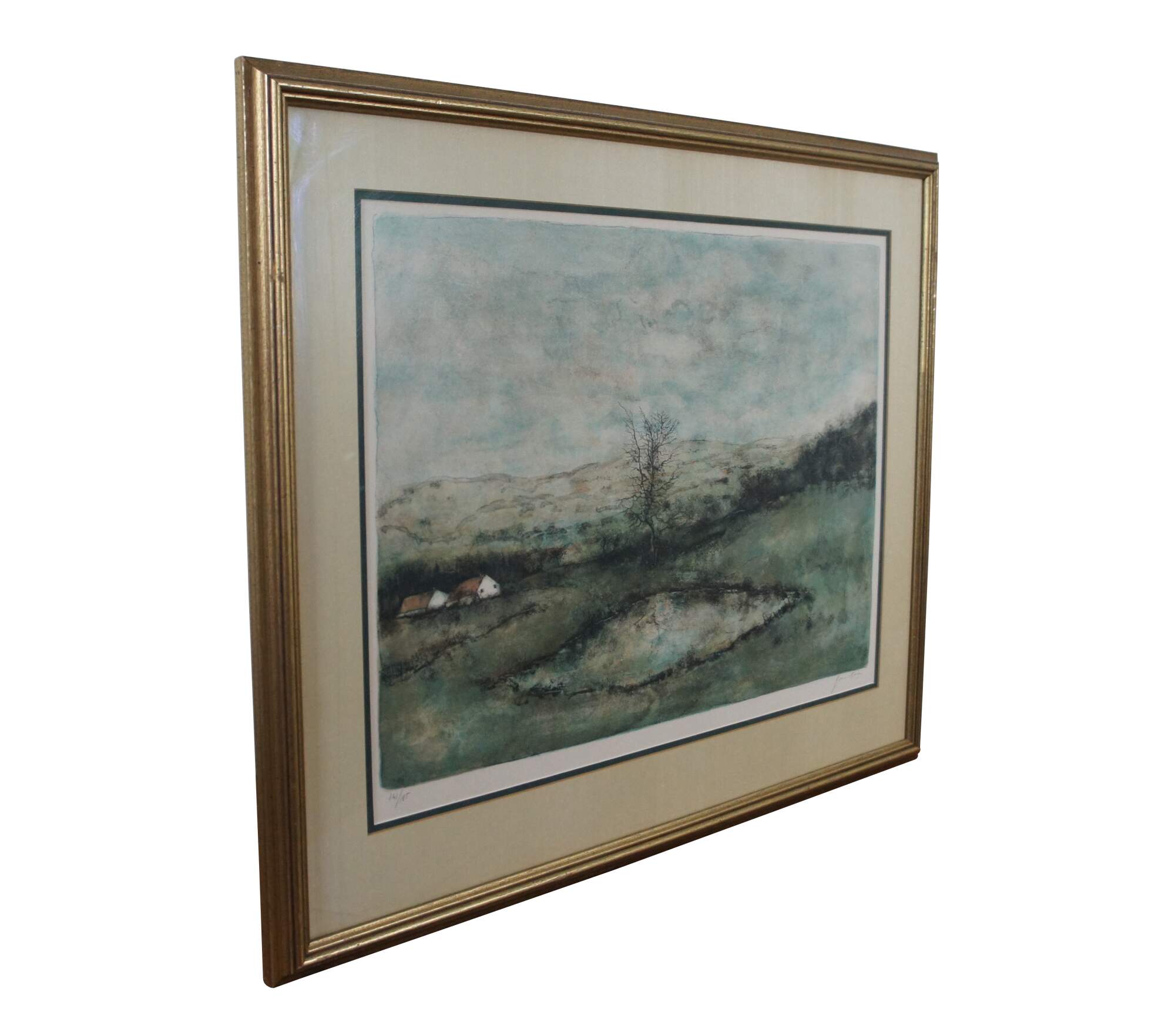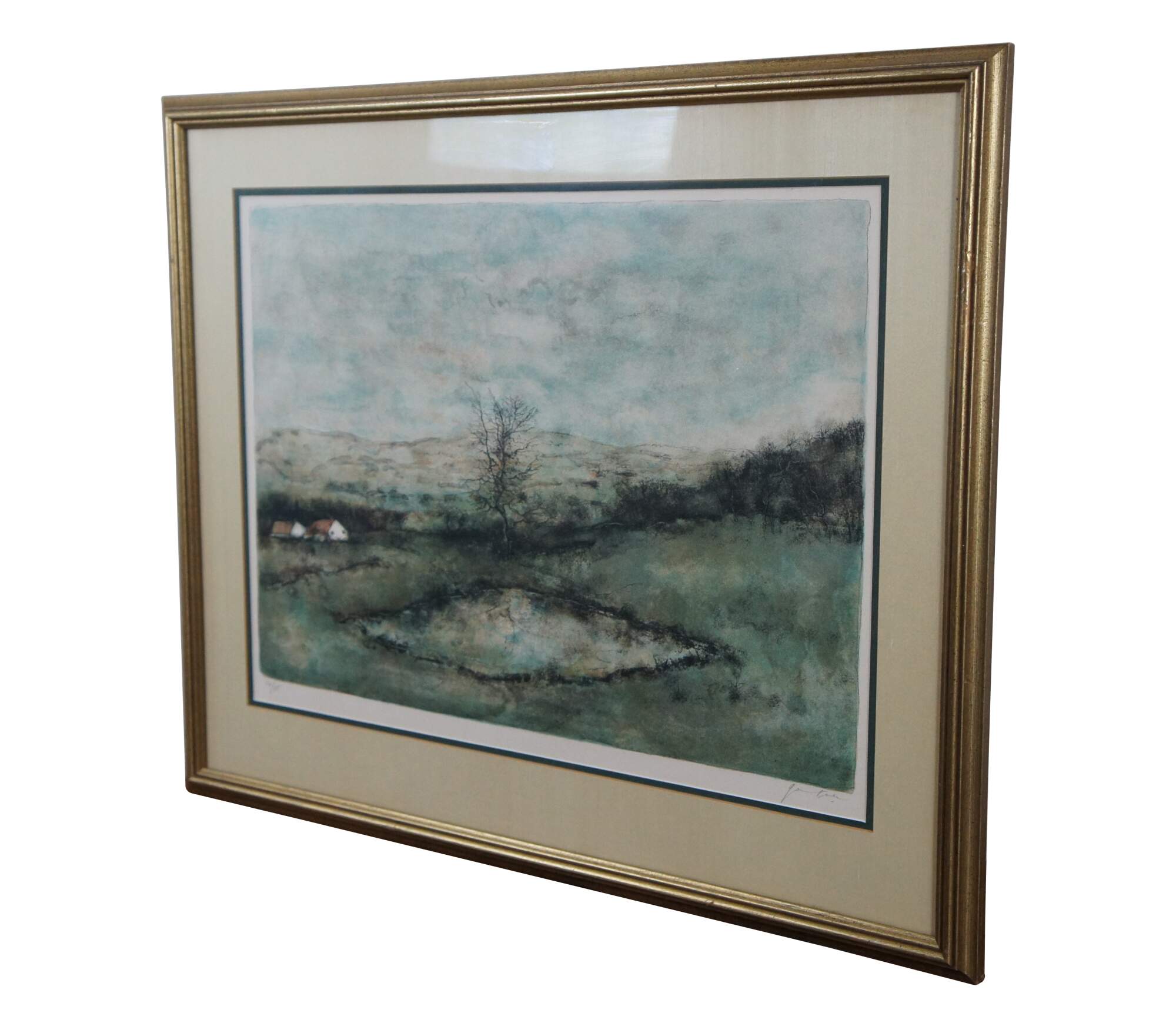 Vintage lithograph print on arches paper titled "Reflets" by Bernard Gantner, circa 1975, showing a country farmhouse landscape of a tree and pond, with cottages and hills in the background. Pencil signed and numbered 141/185. Framed in a gilt beveled frame.