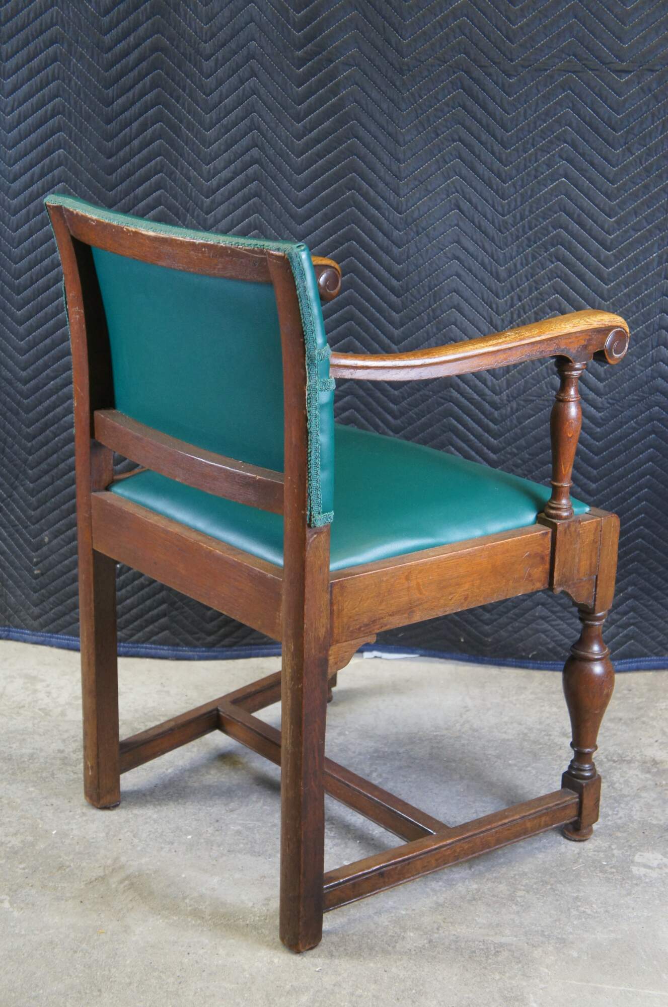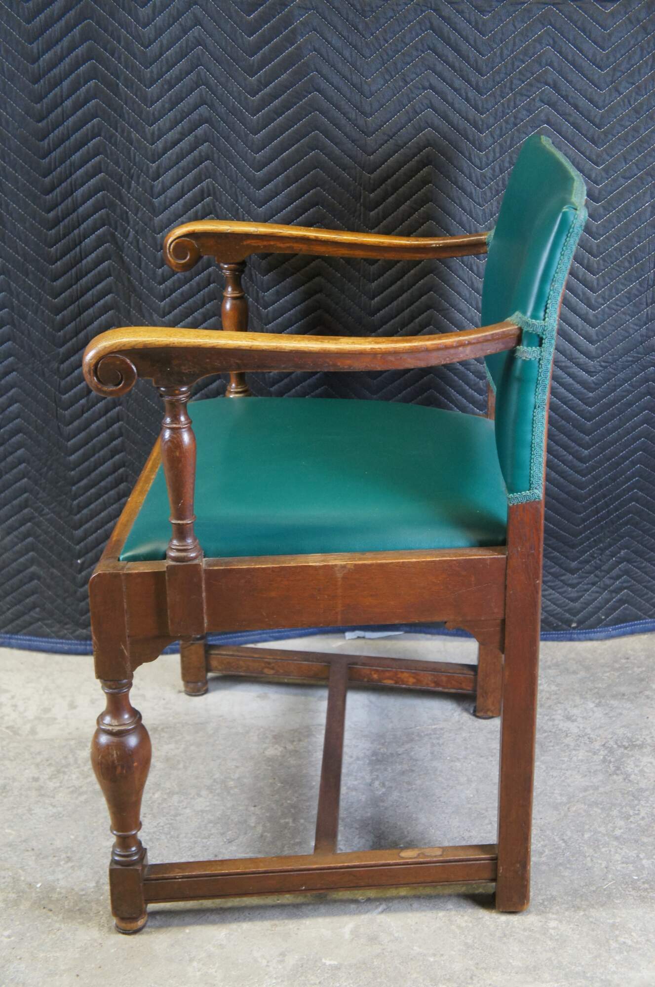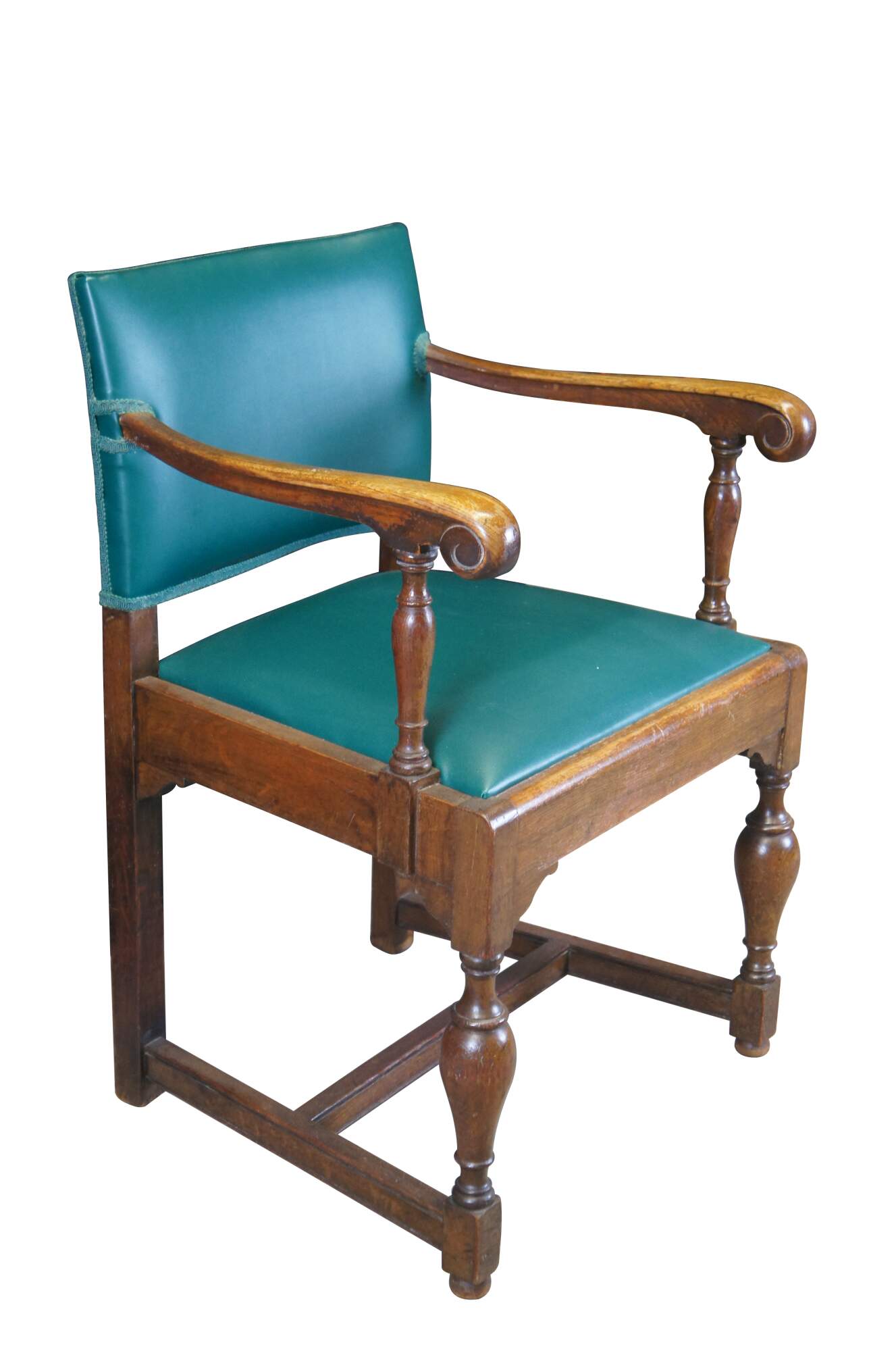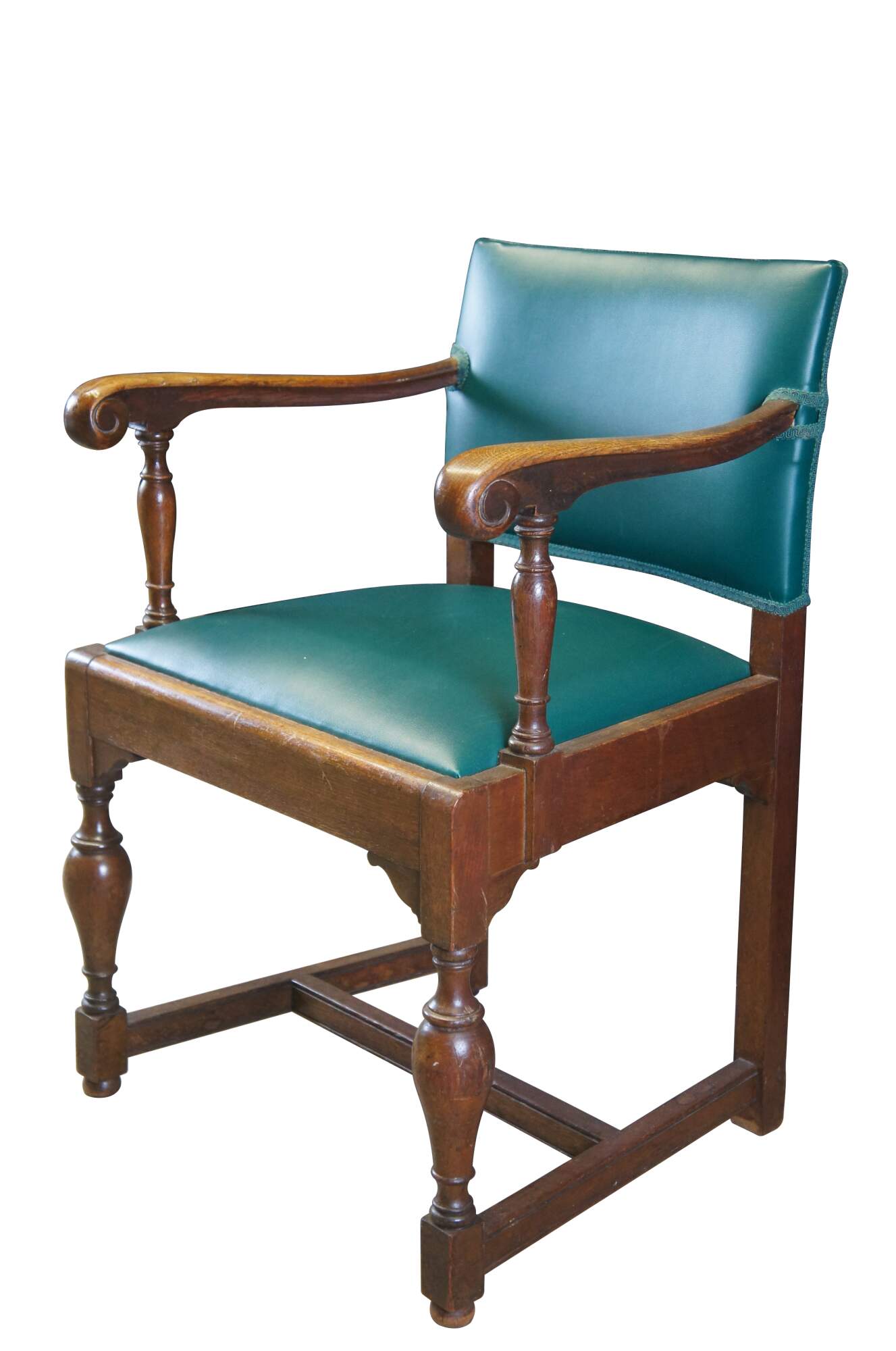 Antique Spanish Revival elbow armchair. Made of quartersawn oak featuring vinyl upholstery with turned supports and H stretcher.