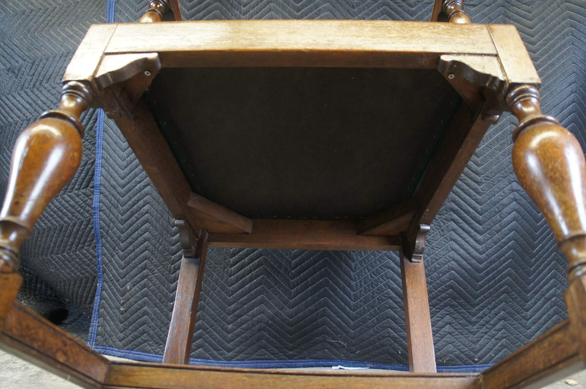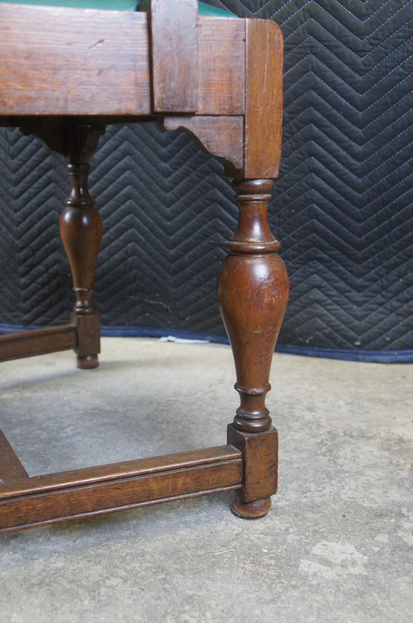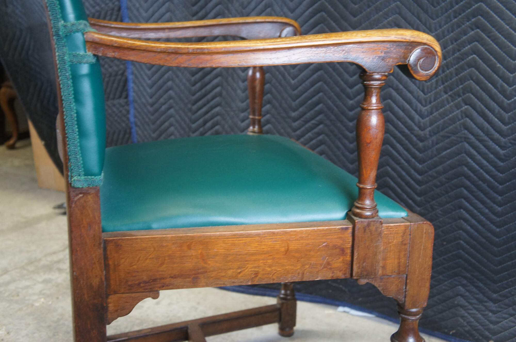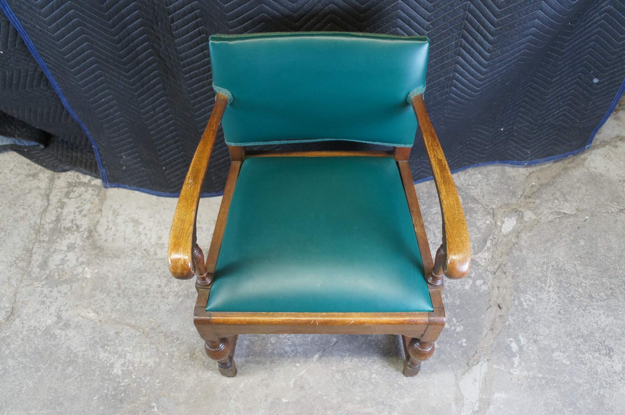 Antique Spanish Revival elbow armchair. Made of quartersawn oak featuring vinyl upholstery with turned supports and H stretcher.