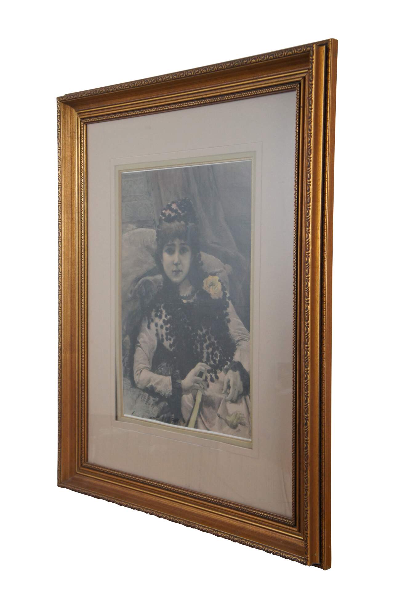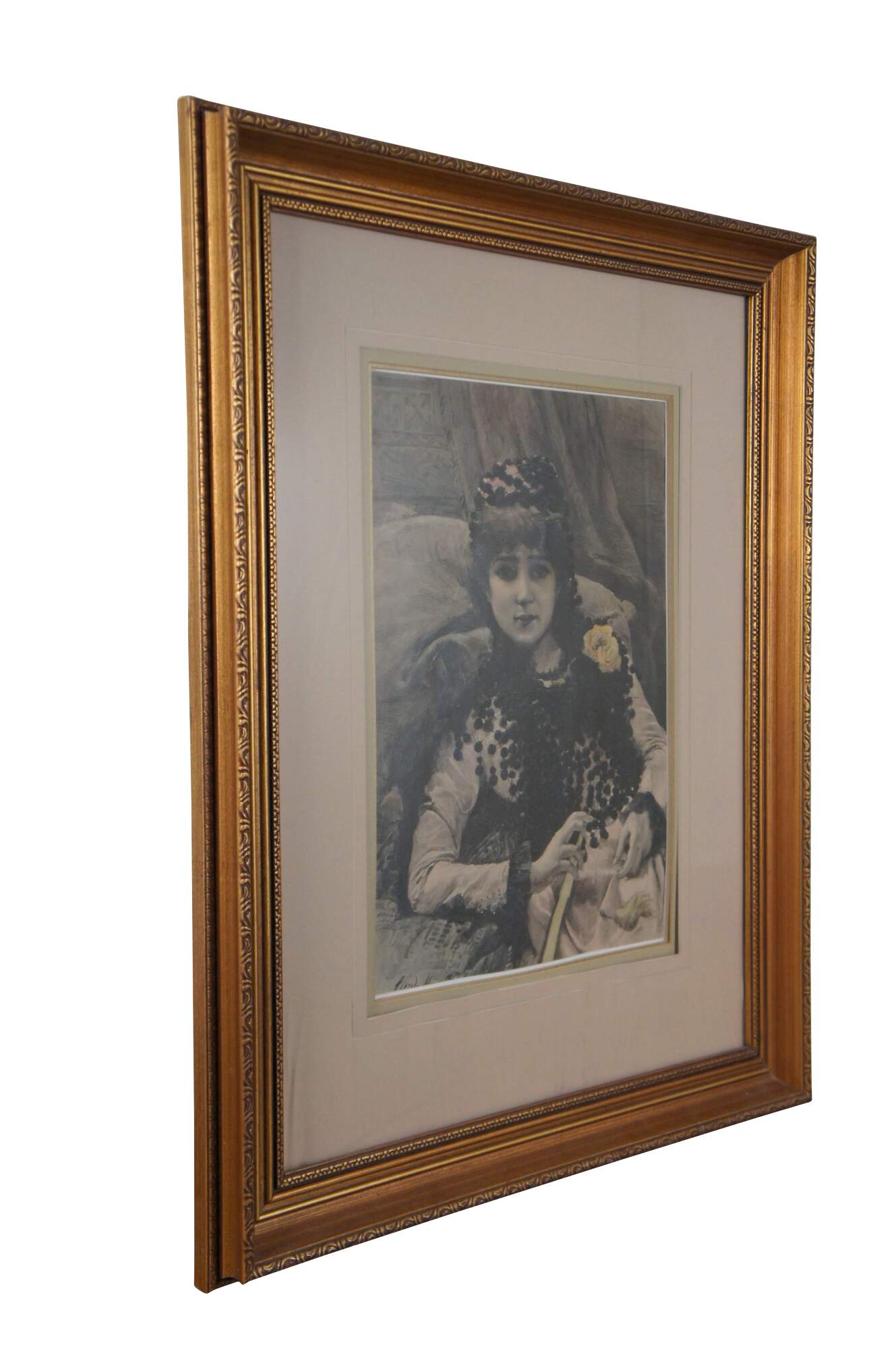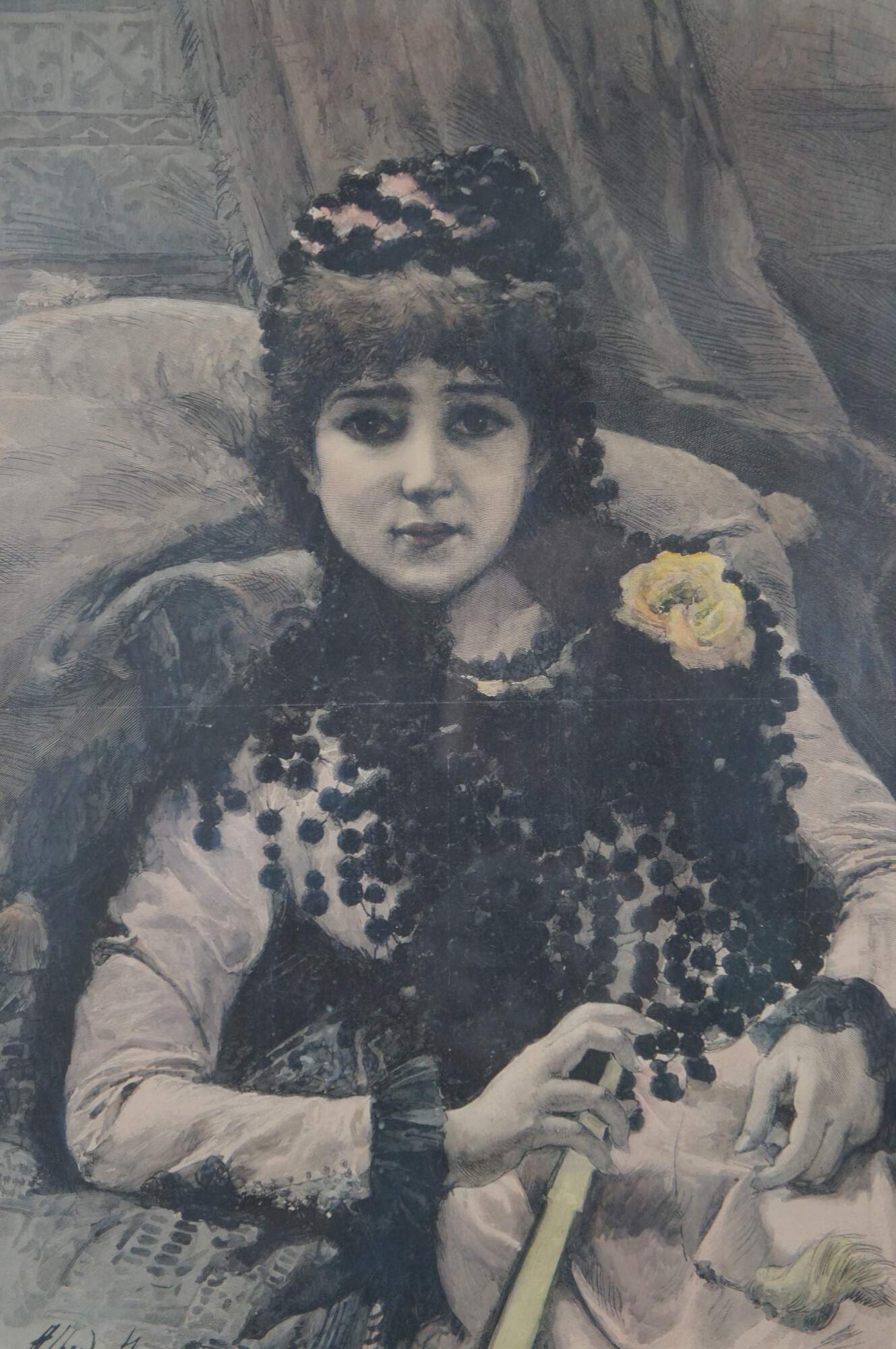 Late 19th century hand colored engraving depicting "Esperando el Carruaje" (Waiting for the Carriage) by Alfredo Perea, showing a woman in a black pom pom shawl, reclining on pillows, a double page extracted from the Januray 30, 1886 edition of La Ilustracion Espanola y Americana. Framed in a beveled giltwood frame with carved accents.
