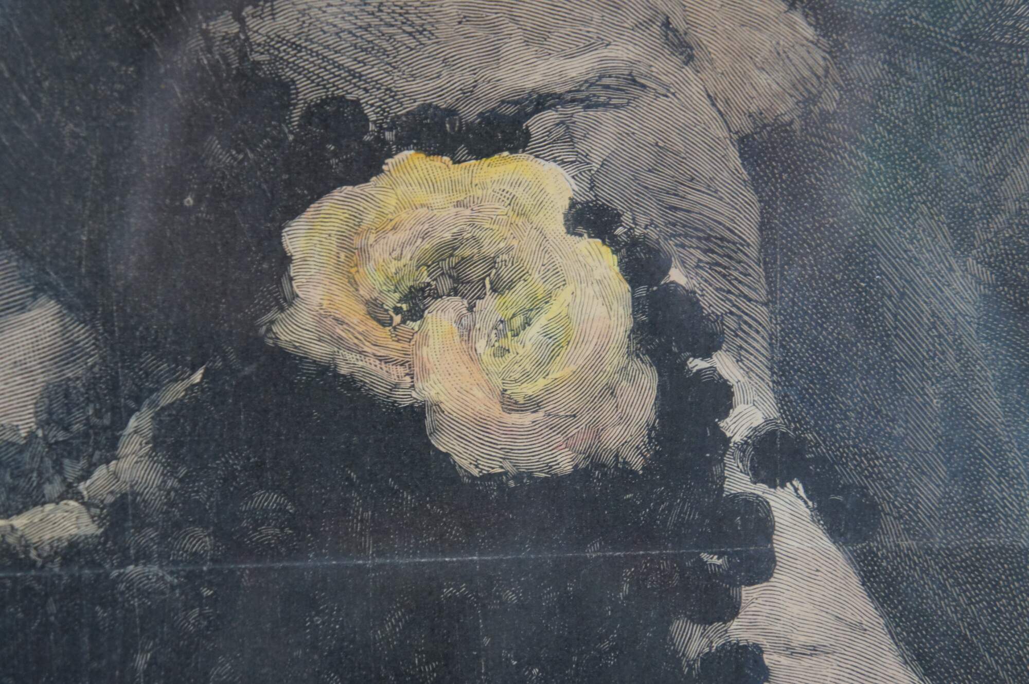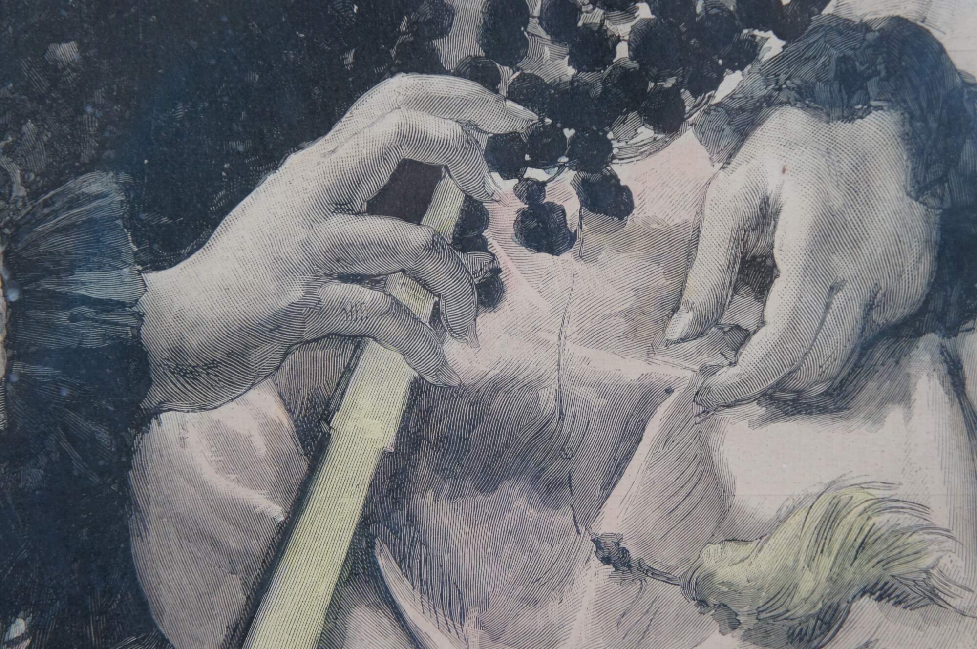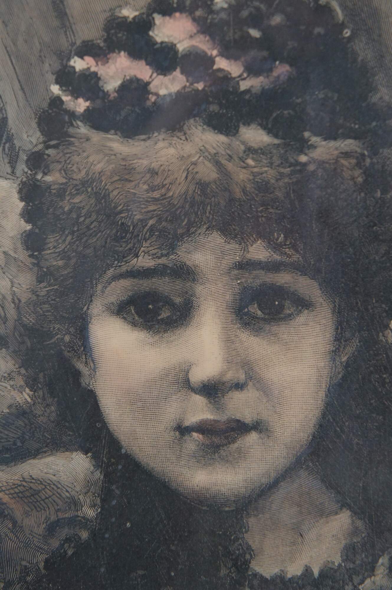 Late 19th century hand colored engraving depicting "Esperando el Carruaje" (Waiting for the Carriage) by Alfredo Perea, showing a woman in a black pom pom shawl, reclining on pillows, a double page extracted from the Januray 30, 1886 edition of La Ilustracion Espanola y Americana. Framed in a beveled giltwood frame with carved accents.