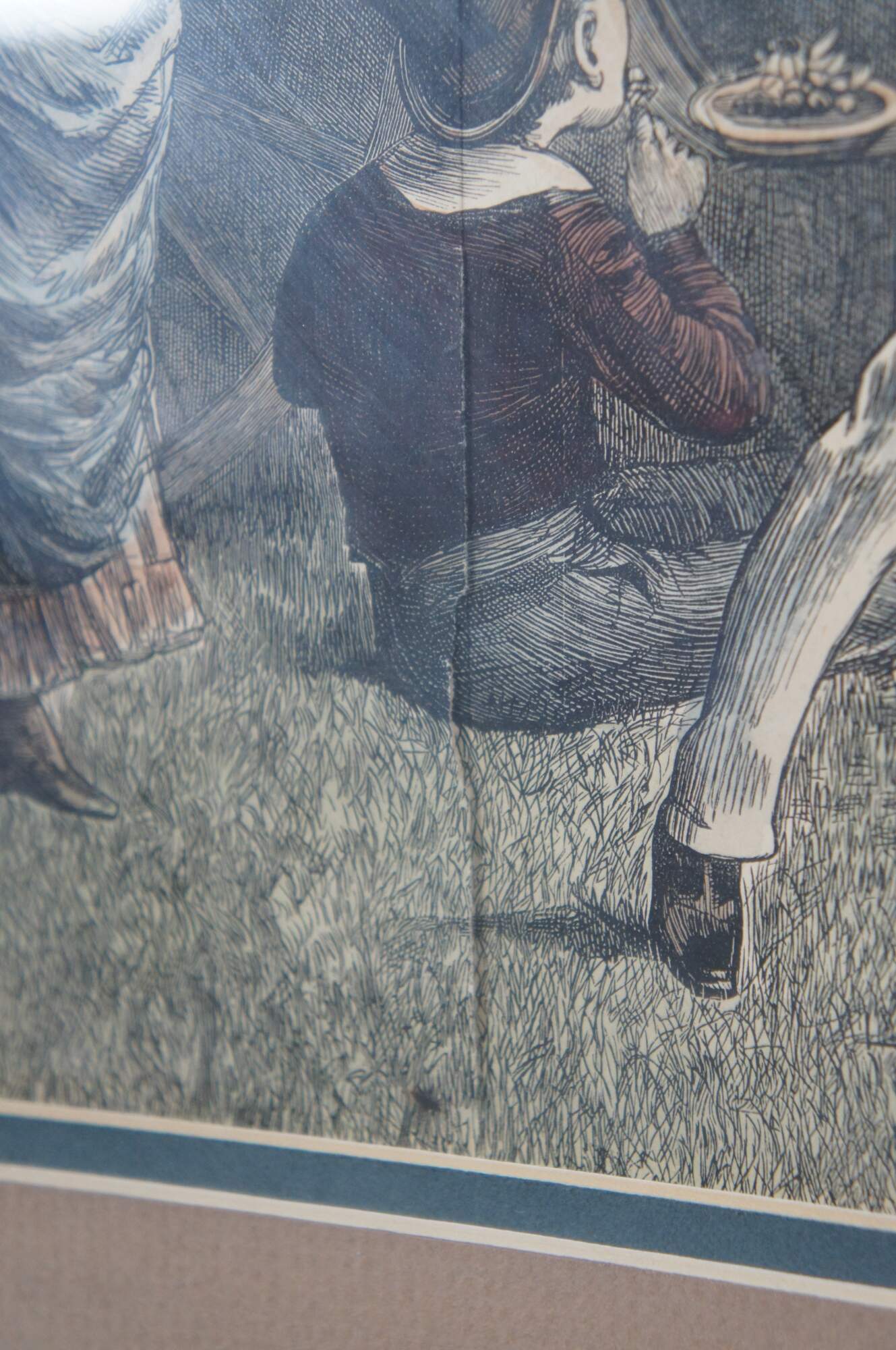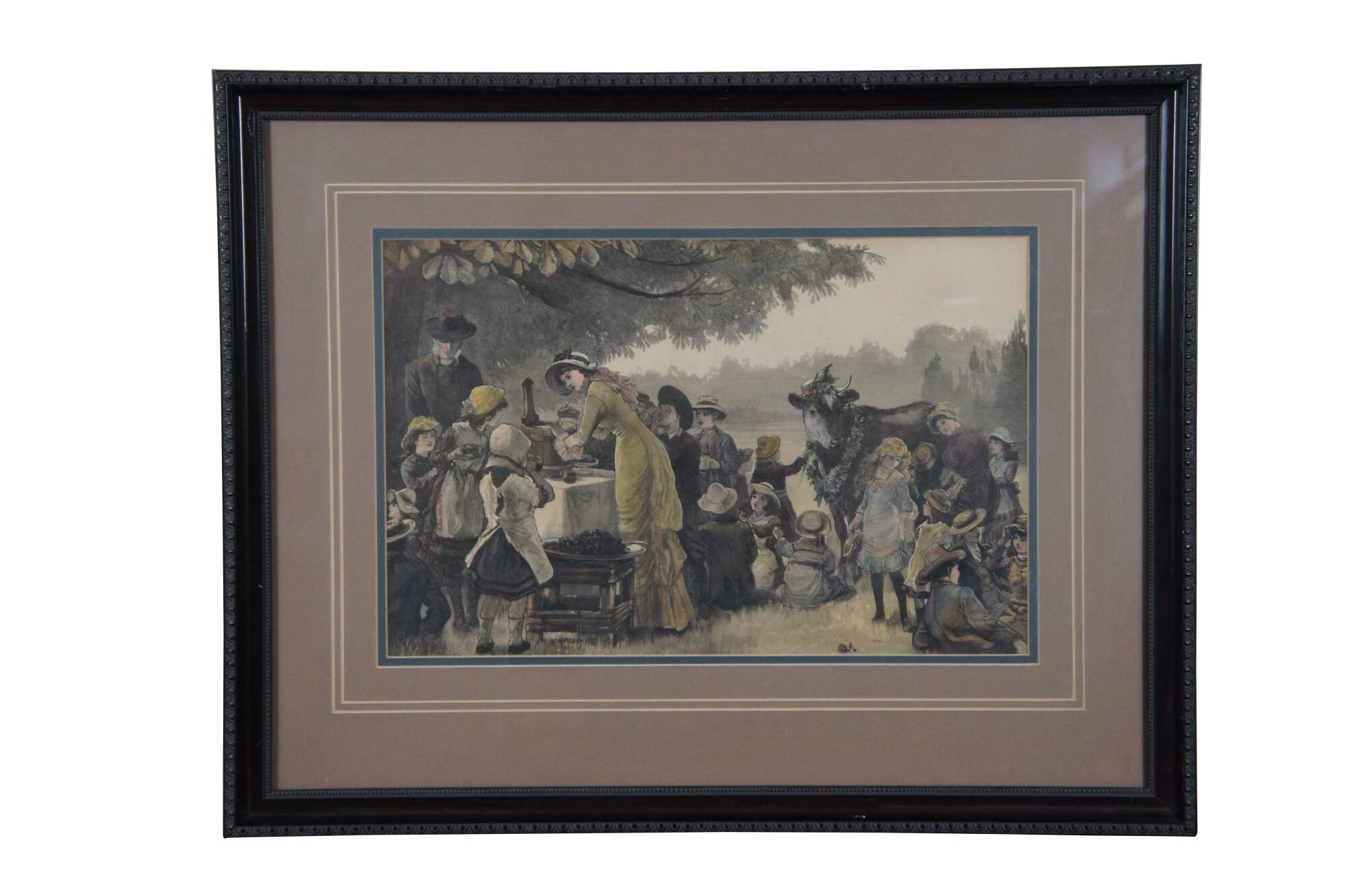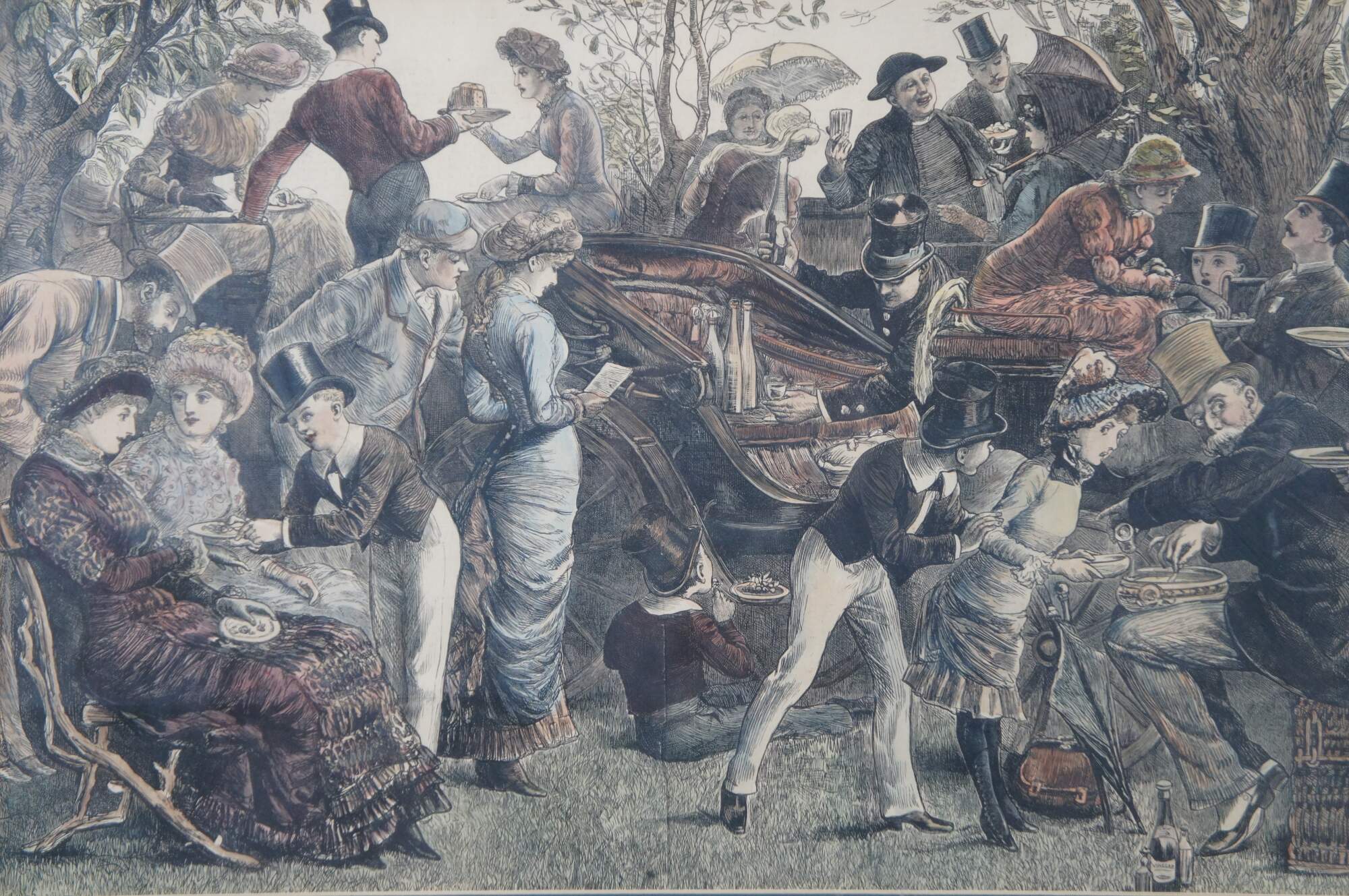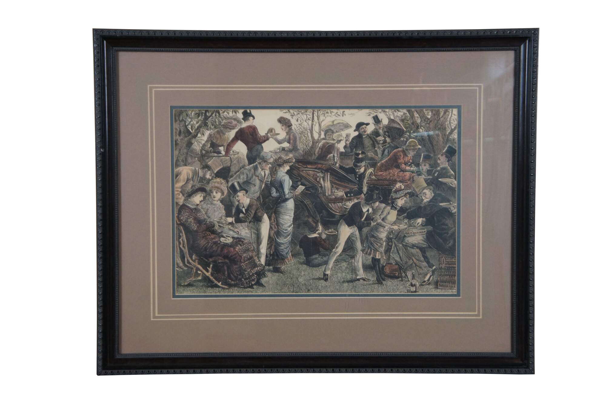 Pair of late 19th century hand colored engravings depicting "At the Eaton and Harrow Cricket Match" by Harry Furniss, a double page extracted from the Illustrated London News, 16 July 1881, showing throng of cricket fans picnicking out of a carriage. And "A Day in Arcadia" by William Heysham Overend" also a double page extracted from the Illustrated London News, 13 August 1881, showing a country picnic including many children and a cow. Framed in dark wood beveled frames with beaded and arched carved accents.