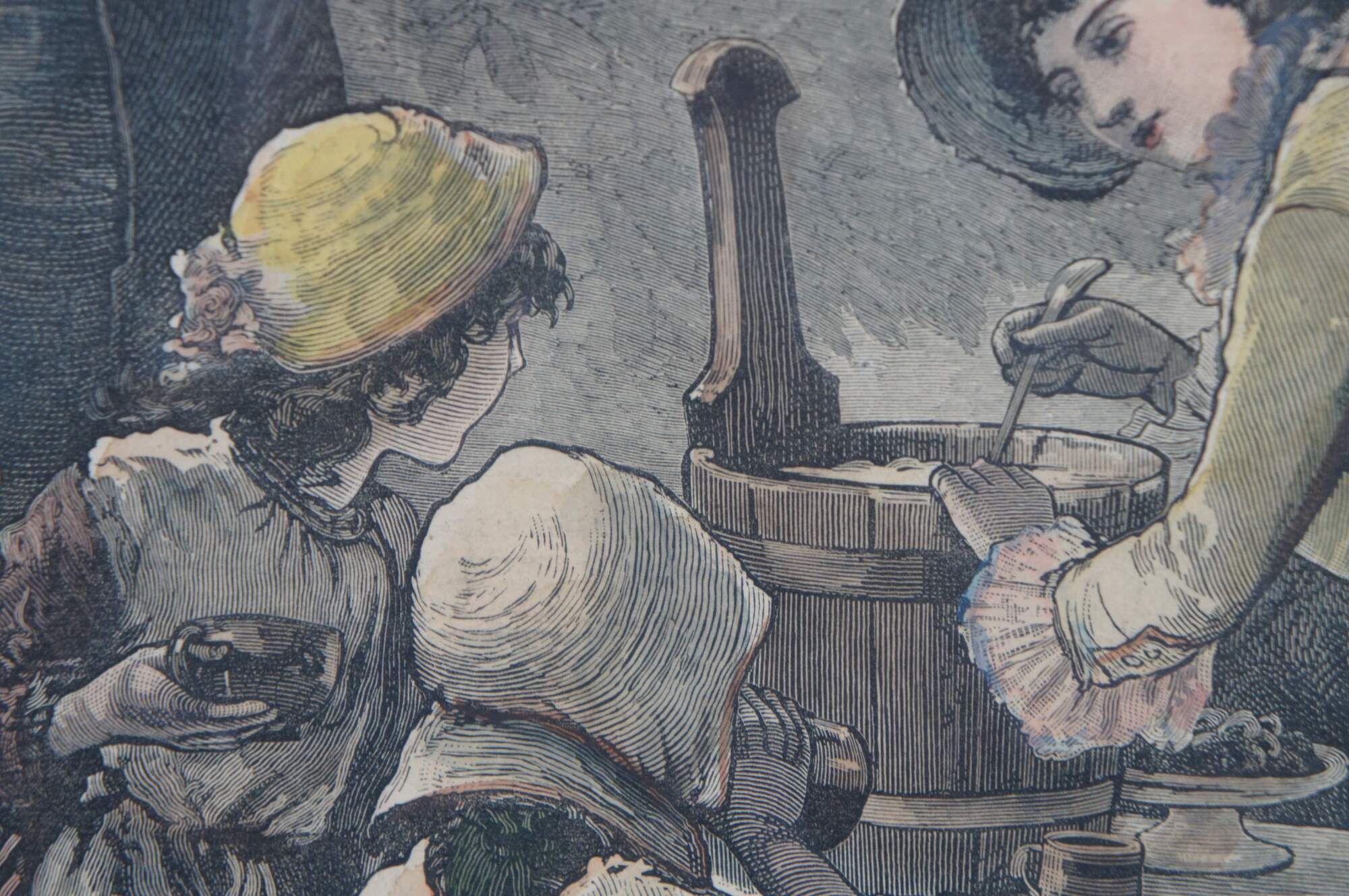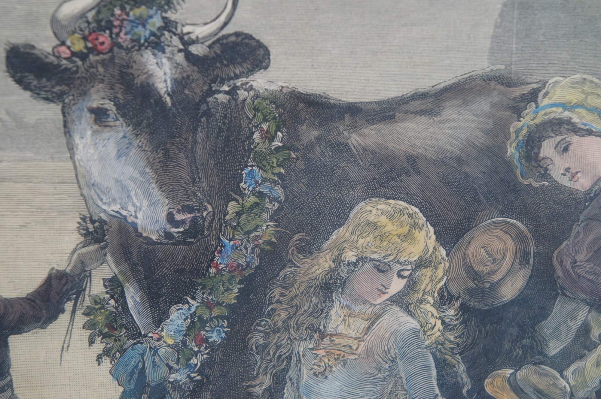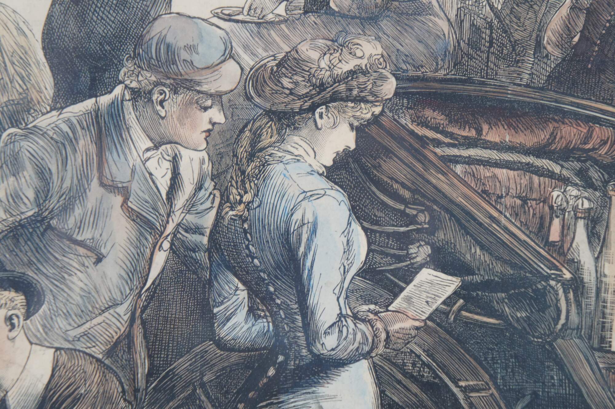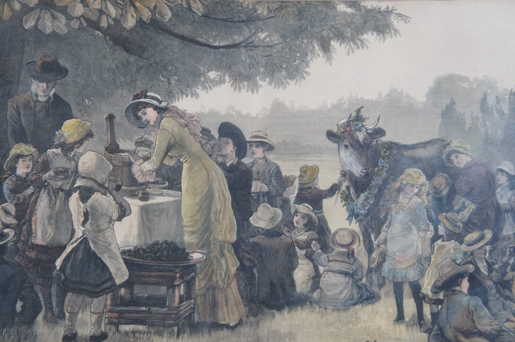 Pair of late 19th century hand colored engravings depicting "At the Eaton and Harrow Cricket Match" by Harry Furniss, a double page extracted from the Illustrated London News, 16 July 1881, showing throng of cricket fans picnicking out of a carriage. And "A Day in Arcadia" by William Heysham Overend" also a double page extracted from the Illustrated London News, 13 August 1881, showing a country picnic including many children and a cow. Framed in dark wood beveled frames with beaded and arched carved accents.