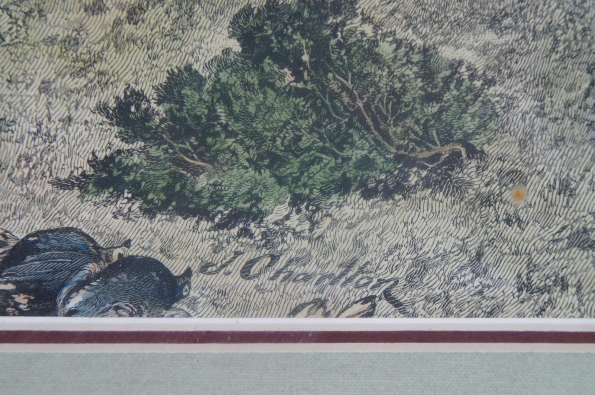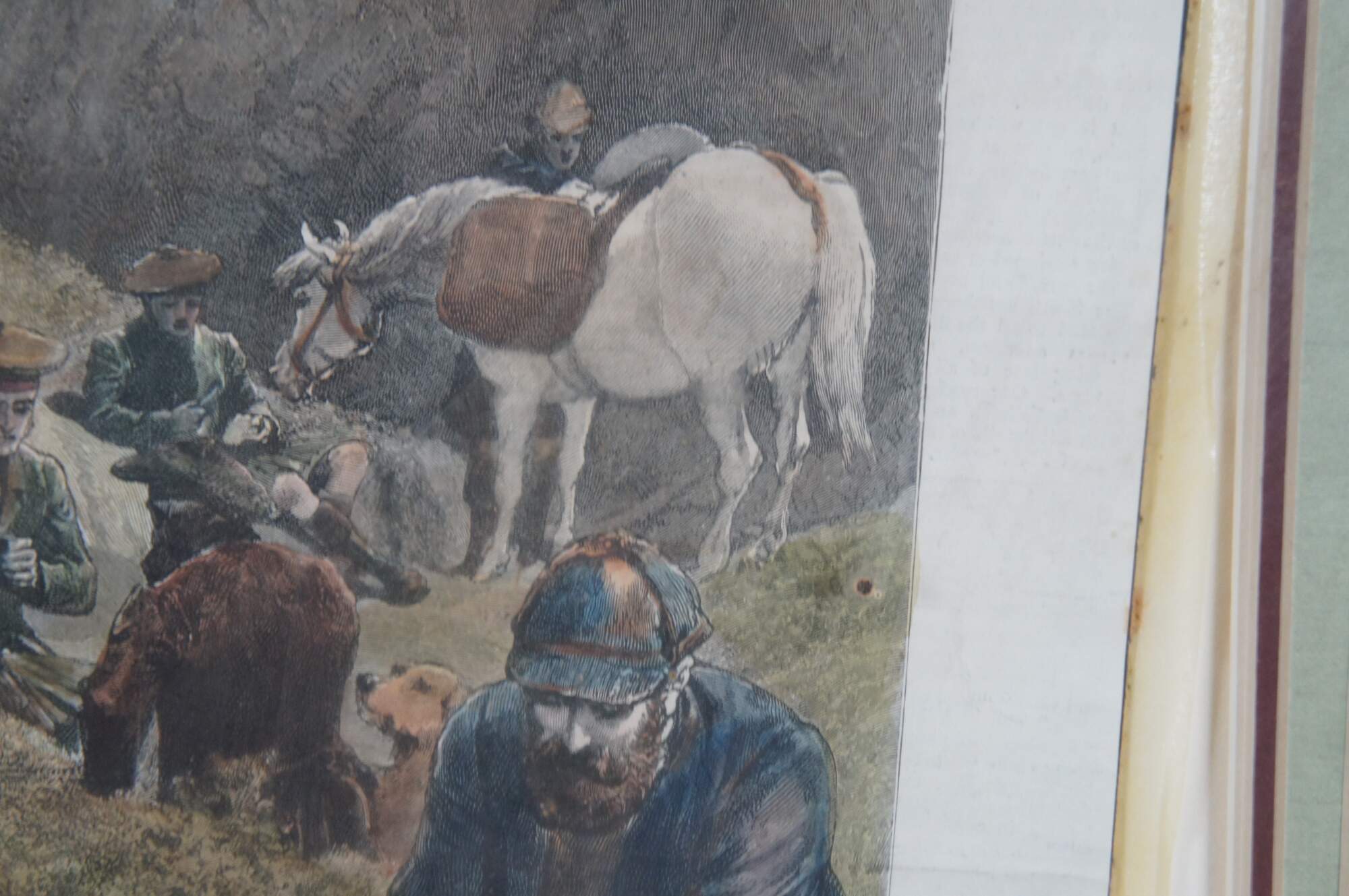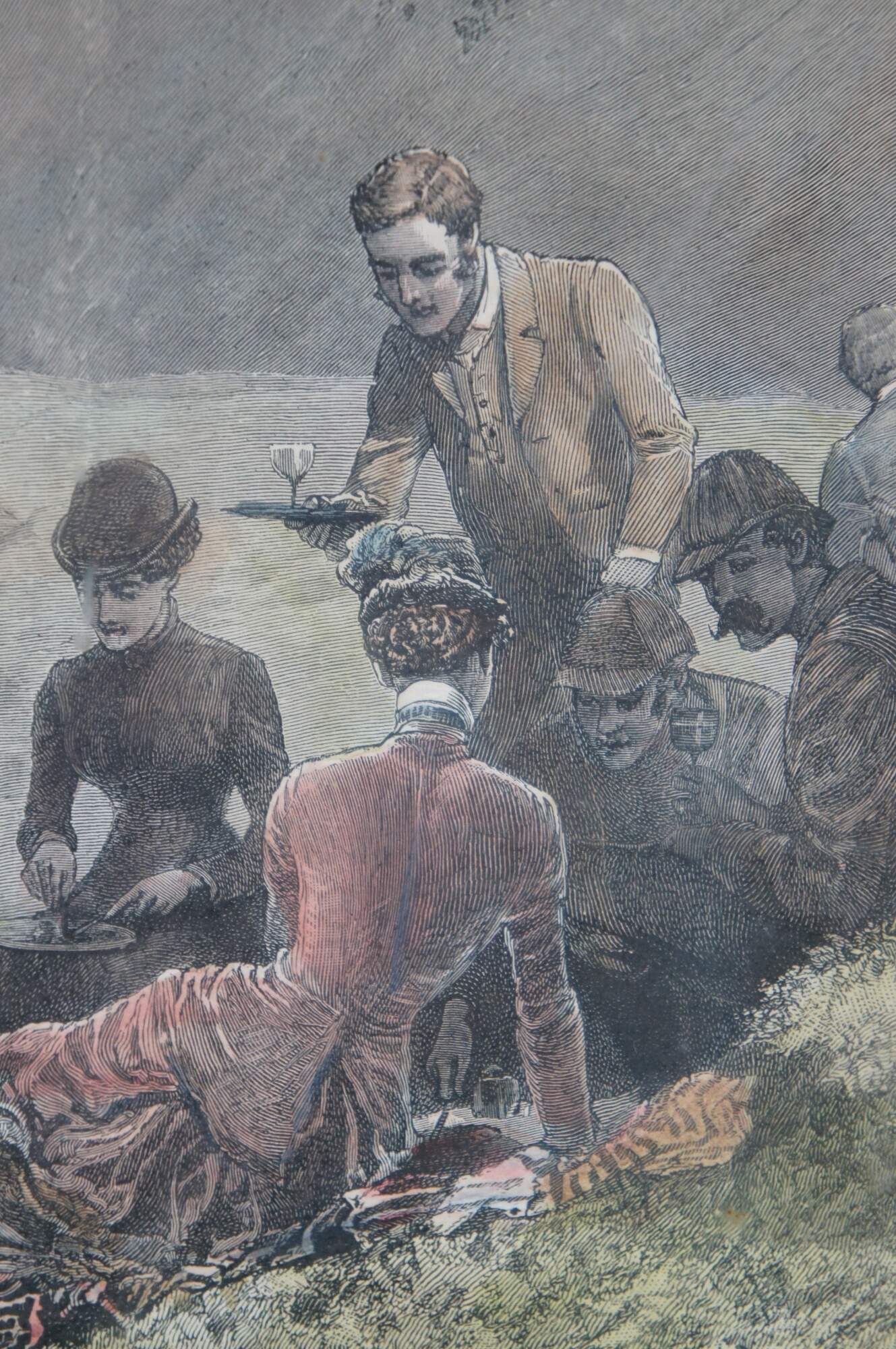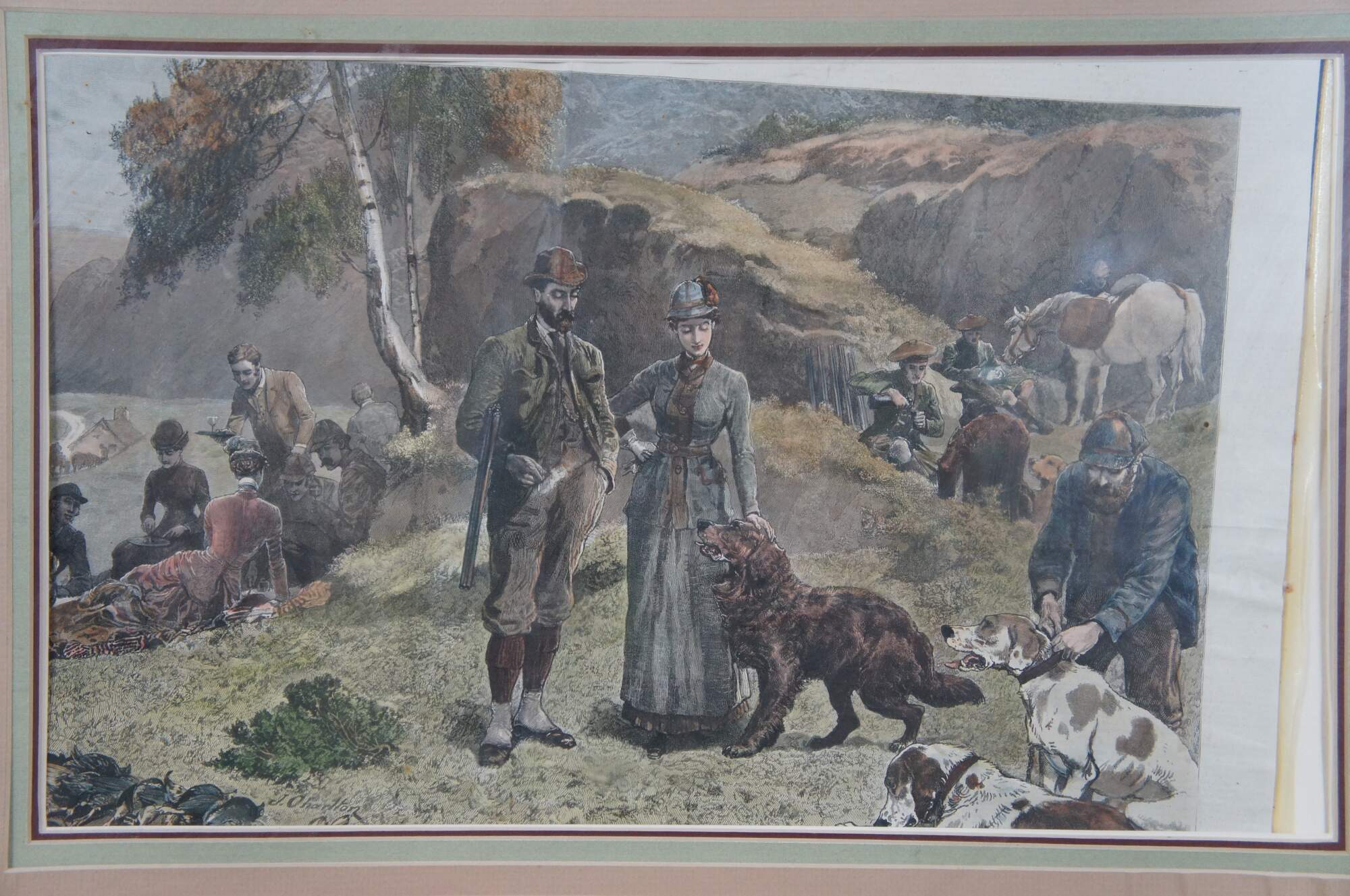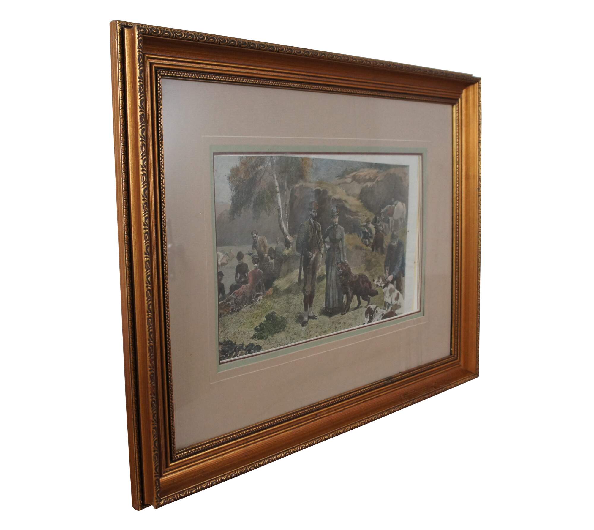 Late 19th century hand colored engraving depicting "The Twelfth of August - Luncheon on the Moors" by John Charlton, circa 1876, showing a hunting party and dogs enjoying a day in the hills. Framed in a beveled giltwood frame with carved accents.