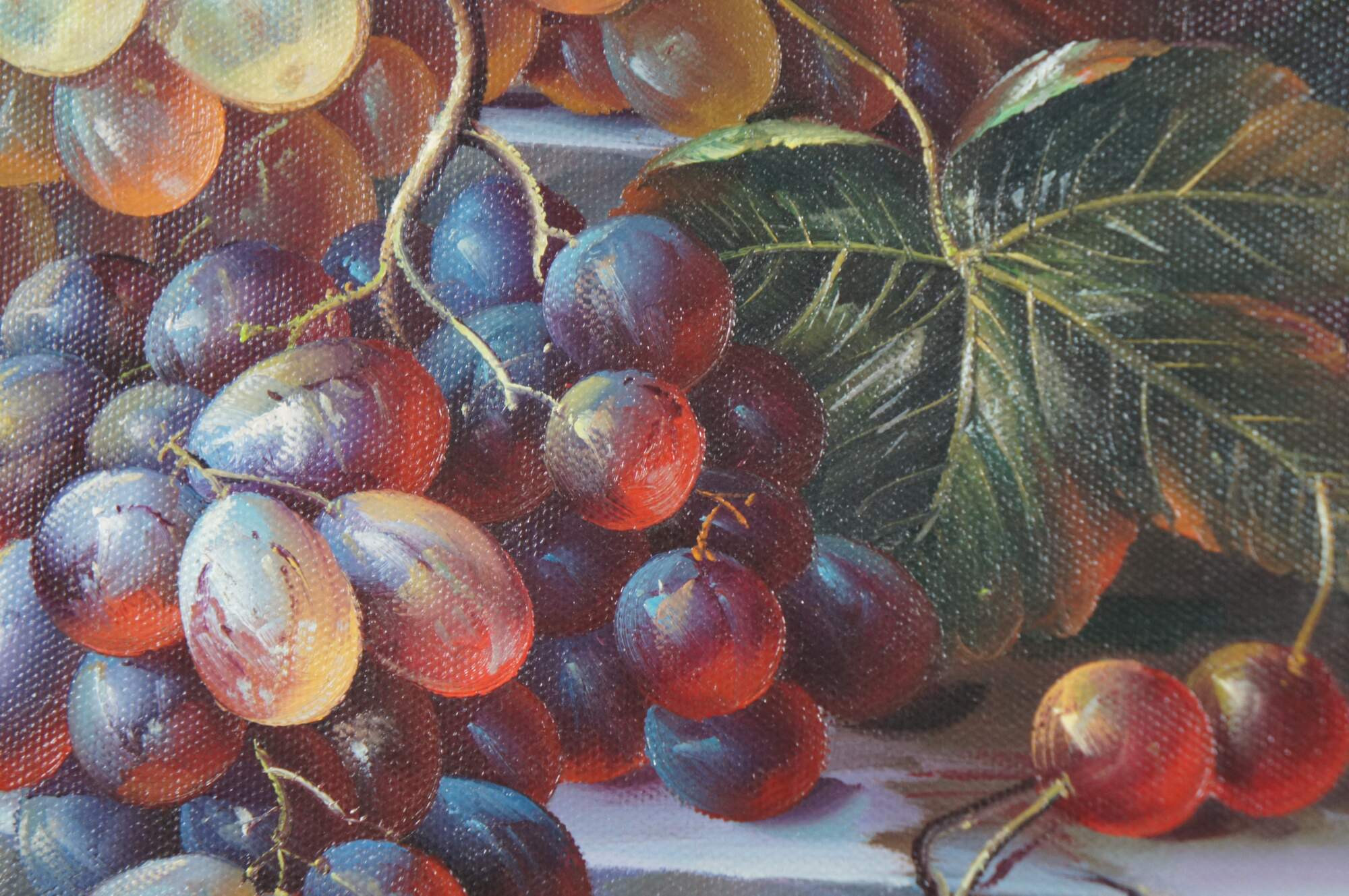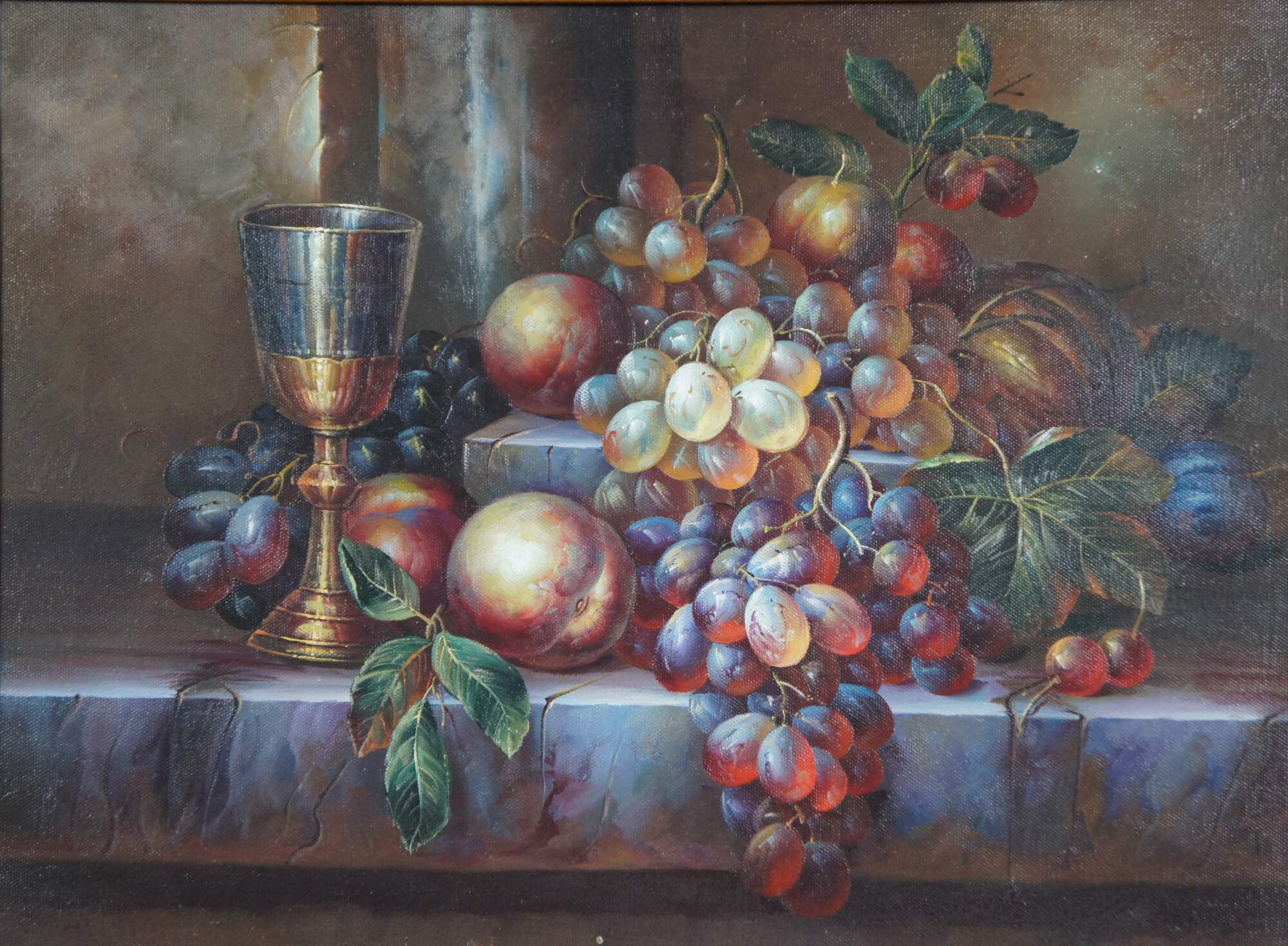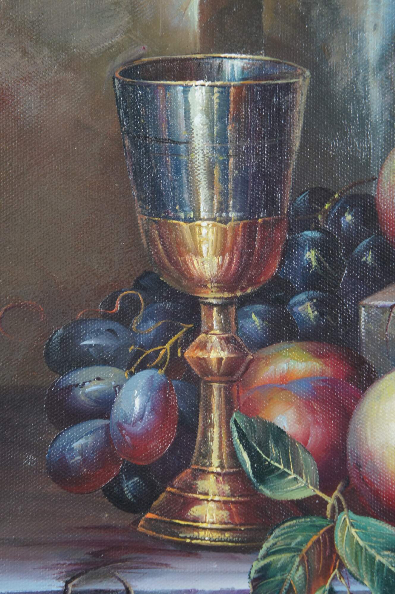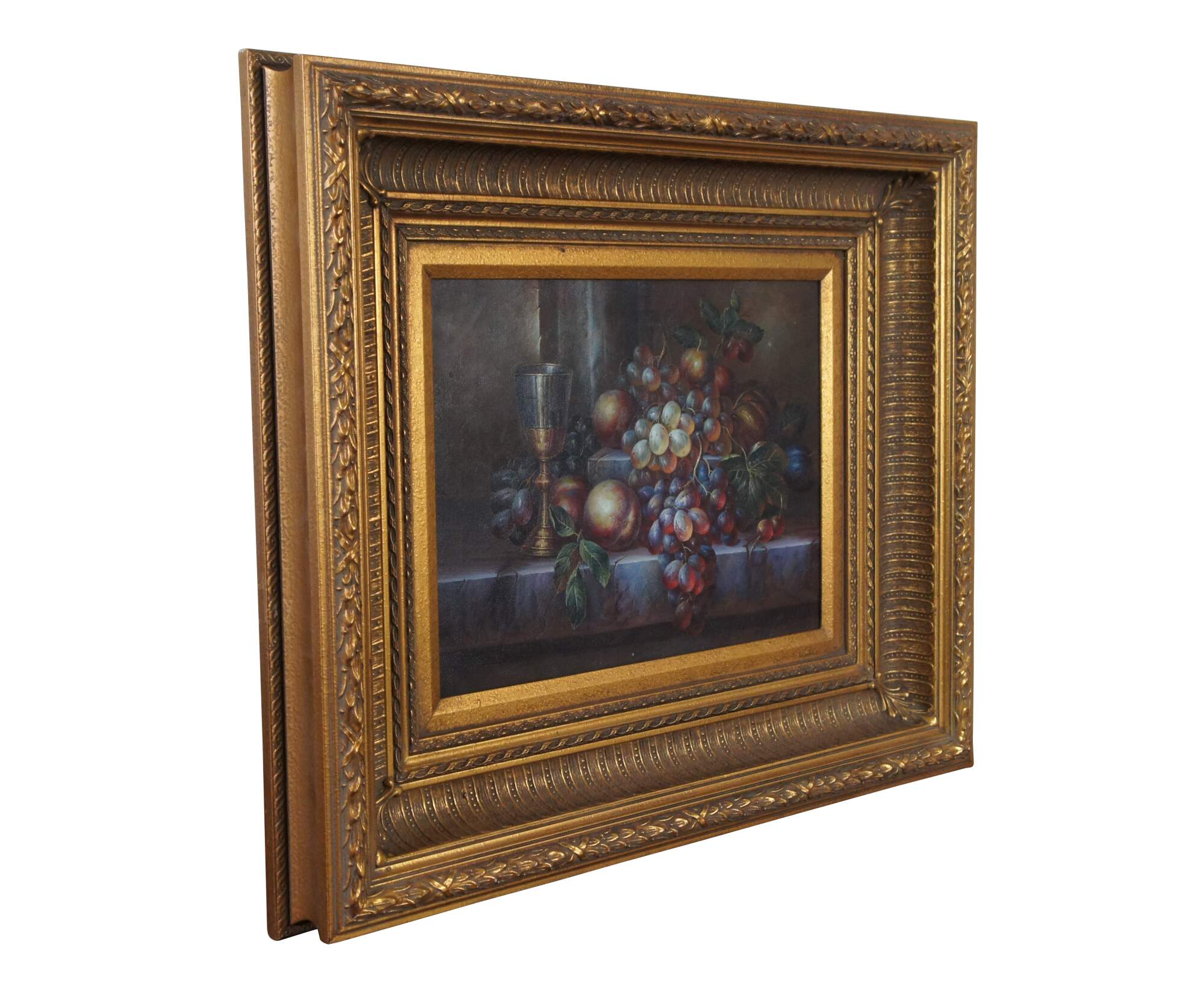 Late 20th century hand painted still life oil painting on canvas showing a pile of peaches and grapes with a wine goblet on a stone table. Framed in a carved and beveled giltwood frame.