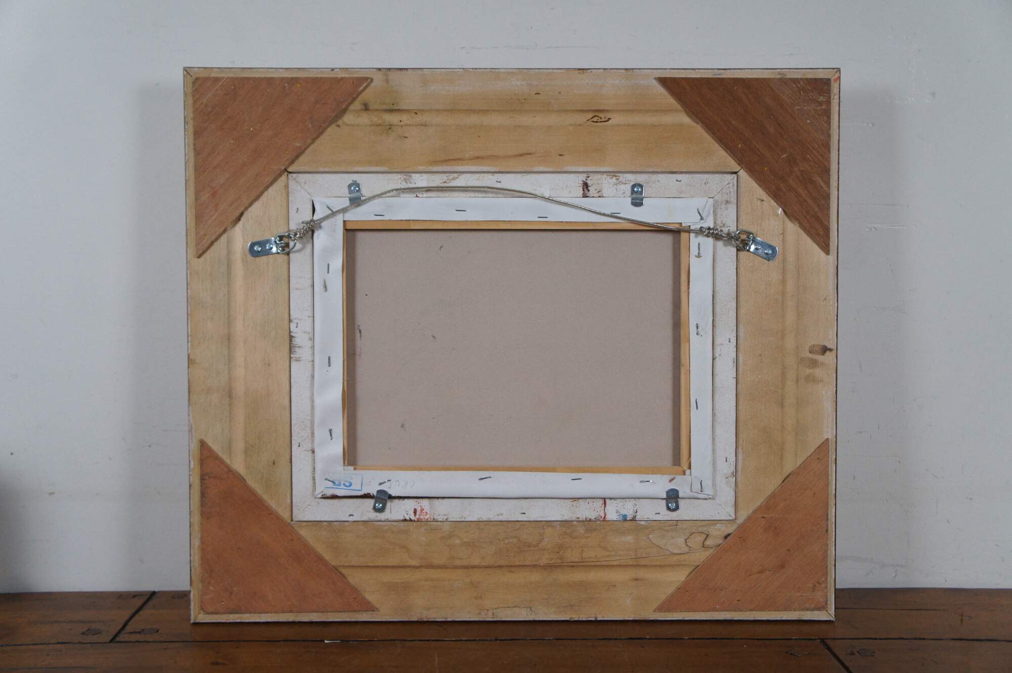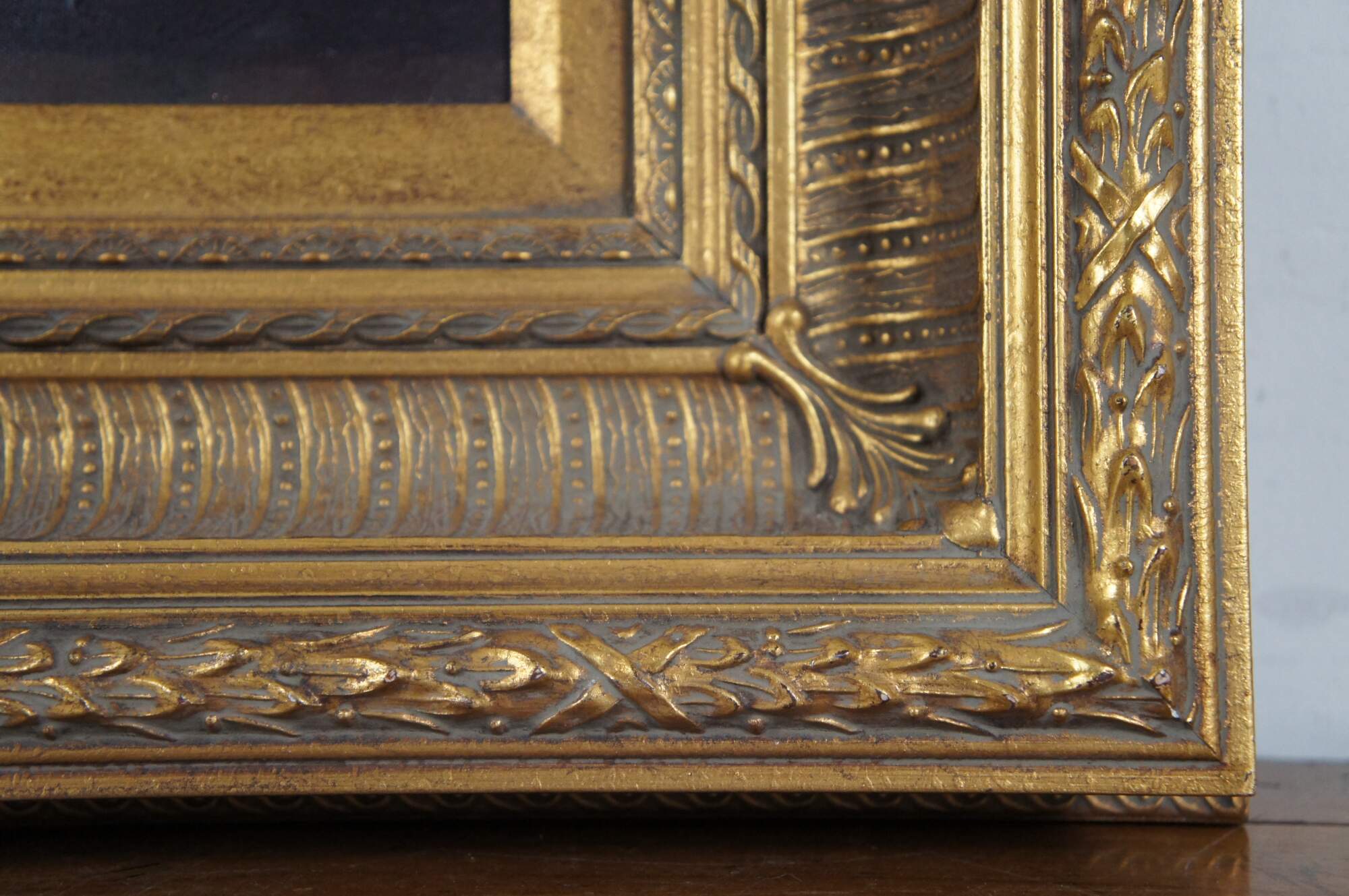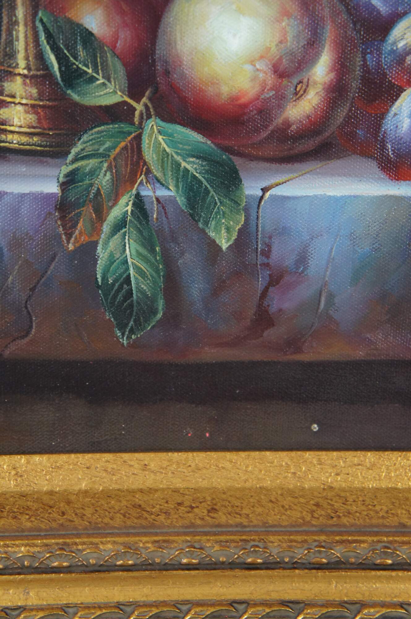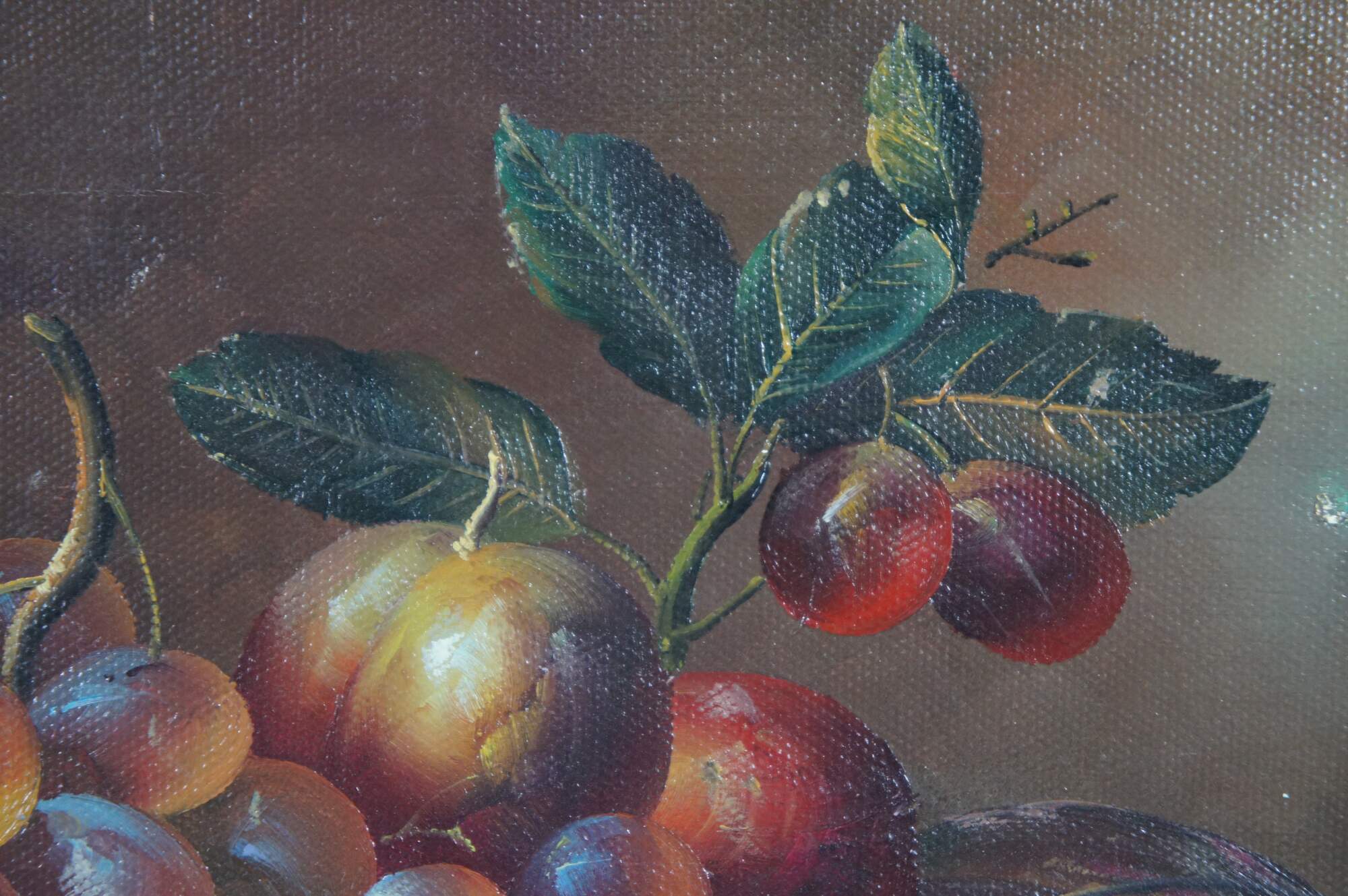 Late 20th century hand painted still life oil painting on canvas showing a pile of peaches and grapes with a wine goblet on a stone table. Framed in a carved and beveled giltwood frame.