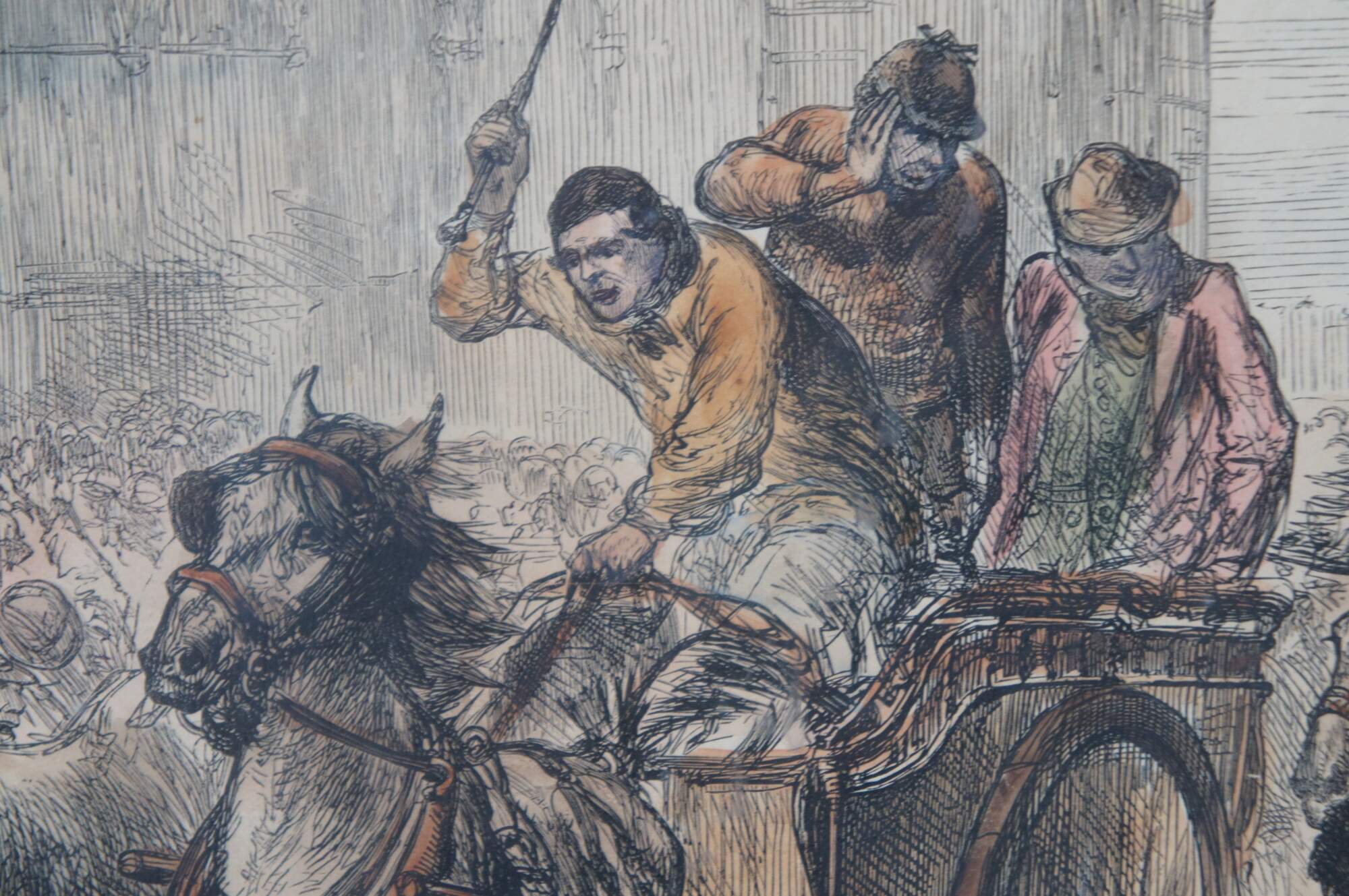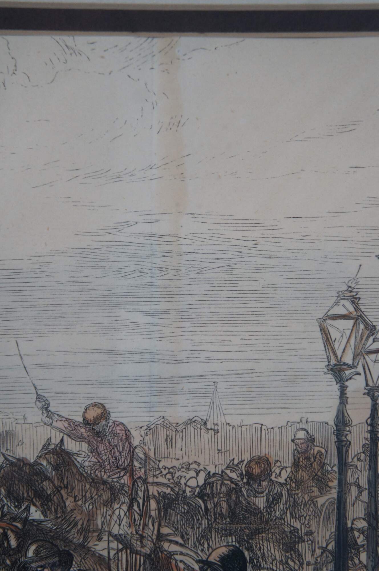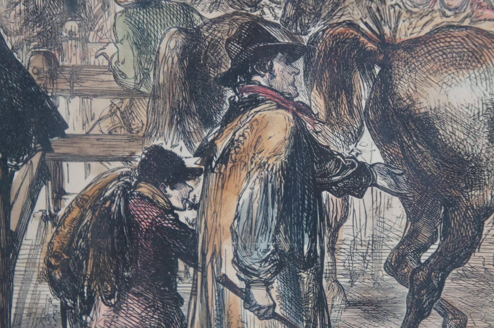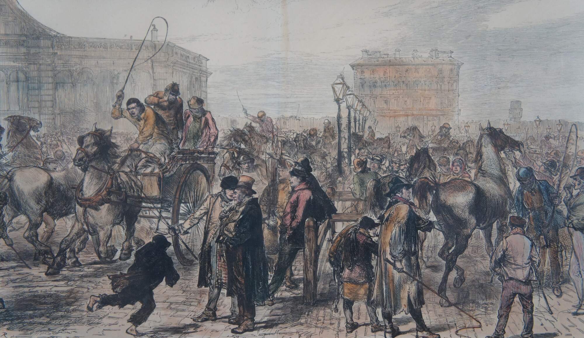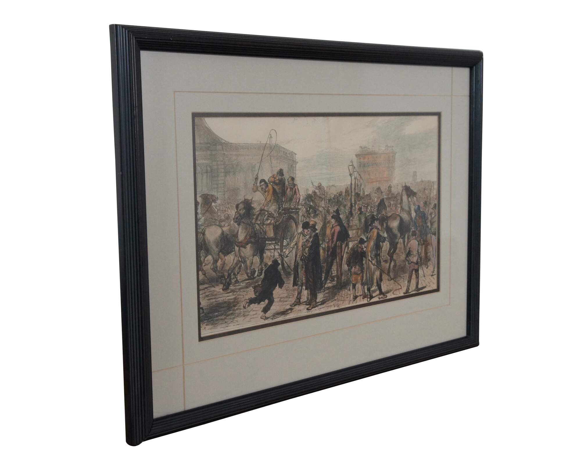 Late 19th century hand colored woodcut engraving depicting "The Horse Market at Islington" by a Charles Robinson (1870-1937), extracted from the Illustrated London News, 5 September 1874, showing a bustling street scene with men and horses. Neatly framed with cut mat in a wood frame with glass covering.