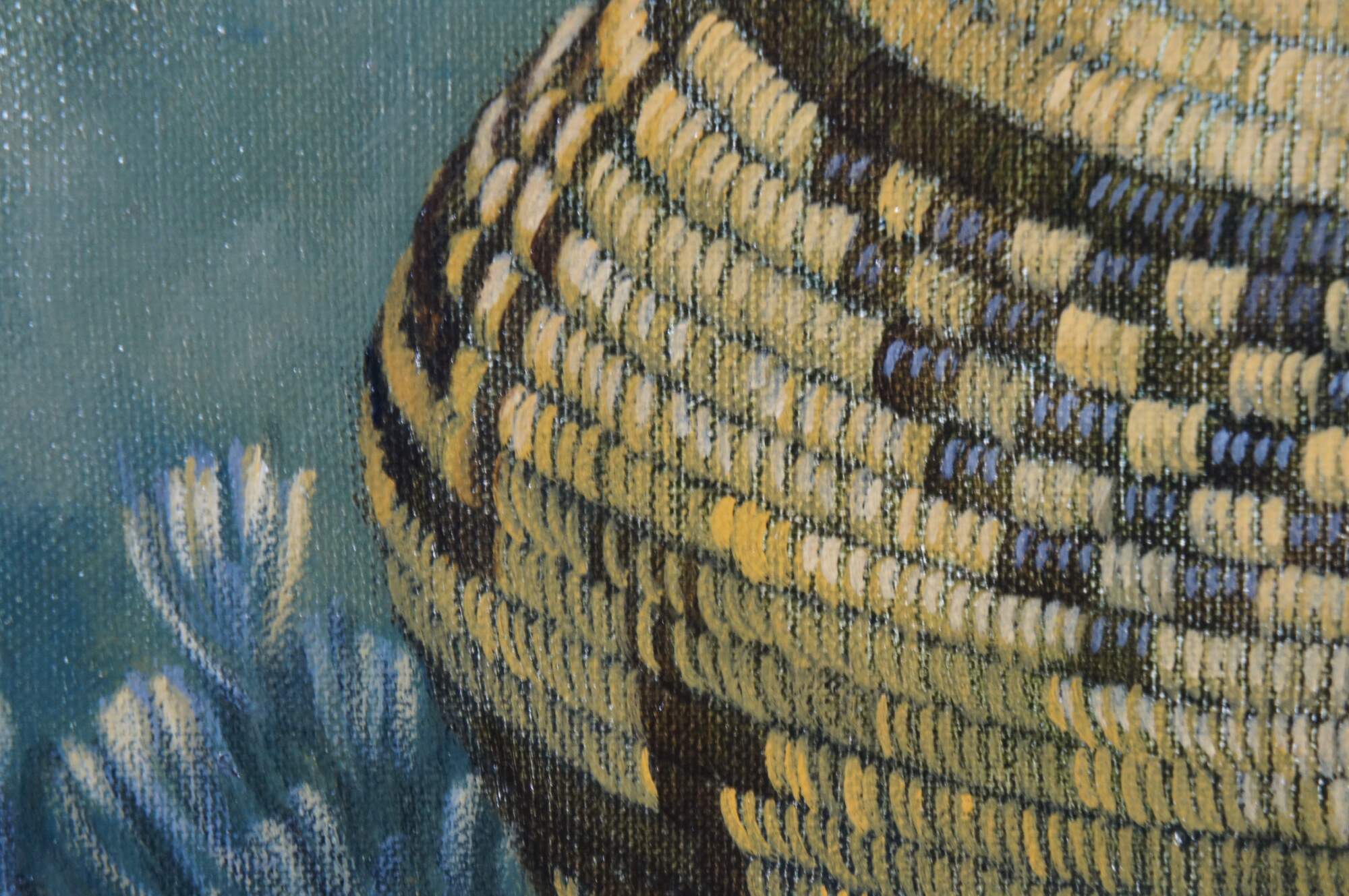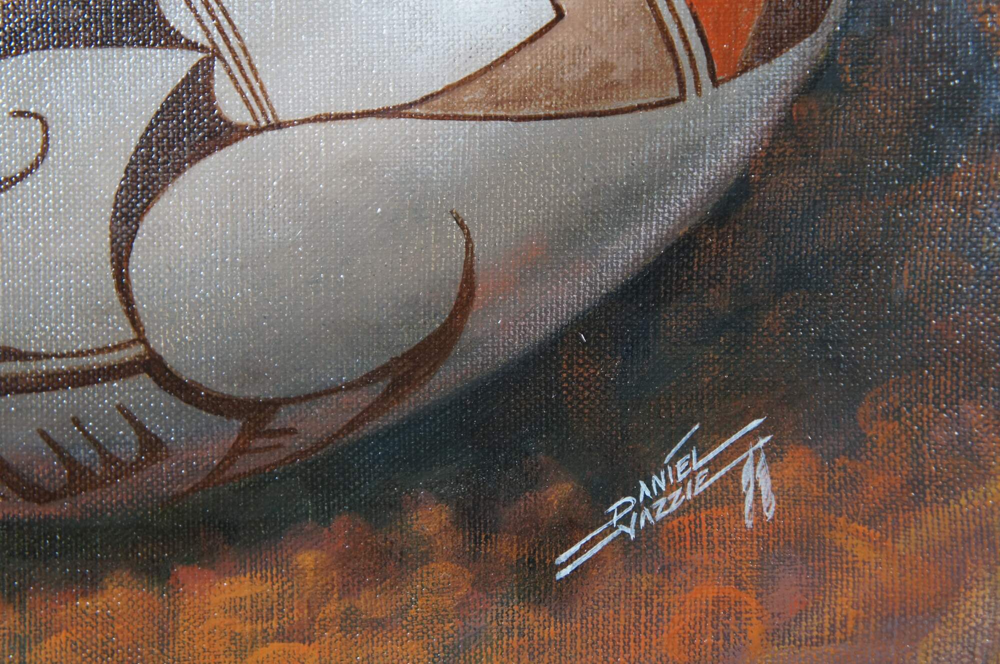 Pair of vibrant oil on canvas still life paintings by Daniel Yazzie, showing tableaus of southwestern / Native American baskets, pottery and corn. Signed in lower right. Framed in light wood frames with raised bevel.