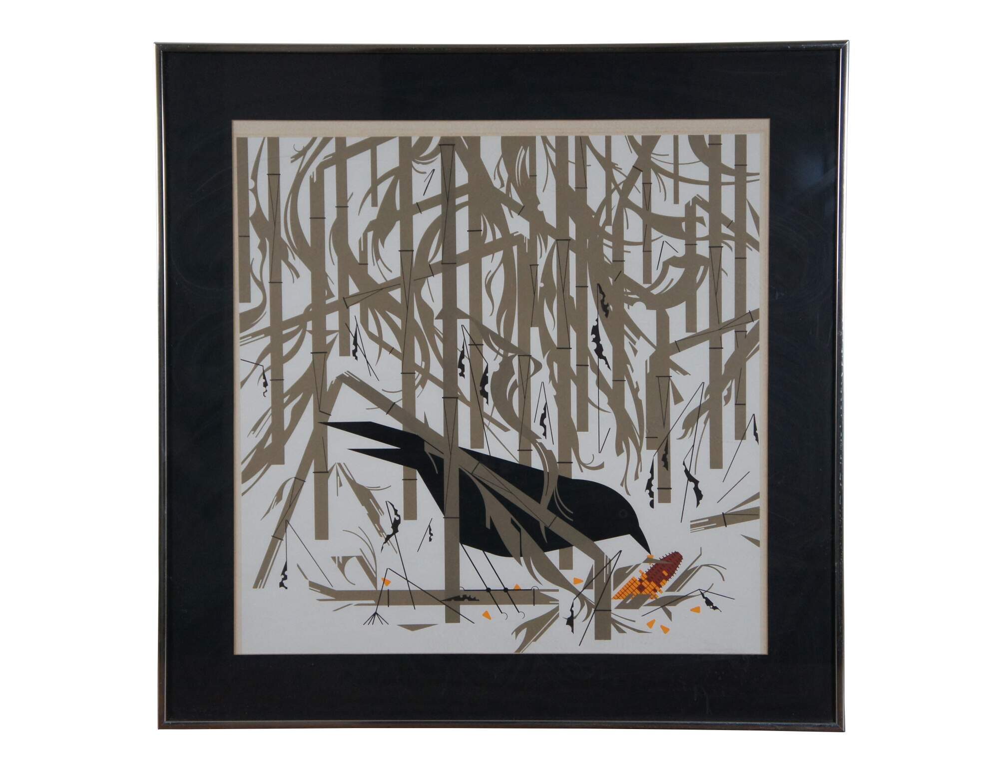 Vintage serigraph print titled "Crow in the Snow" by Charley Harper, showing a black crow nibbling on an ear of corn among snowy corn stalks. Framed under glass. Signed and numbered.