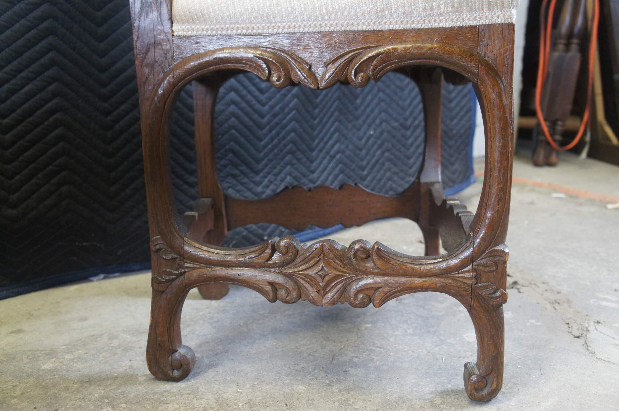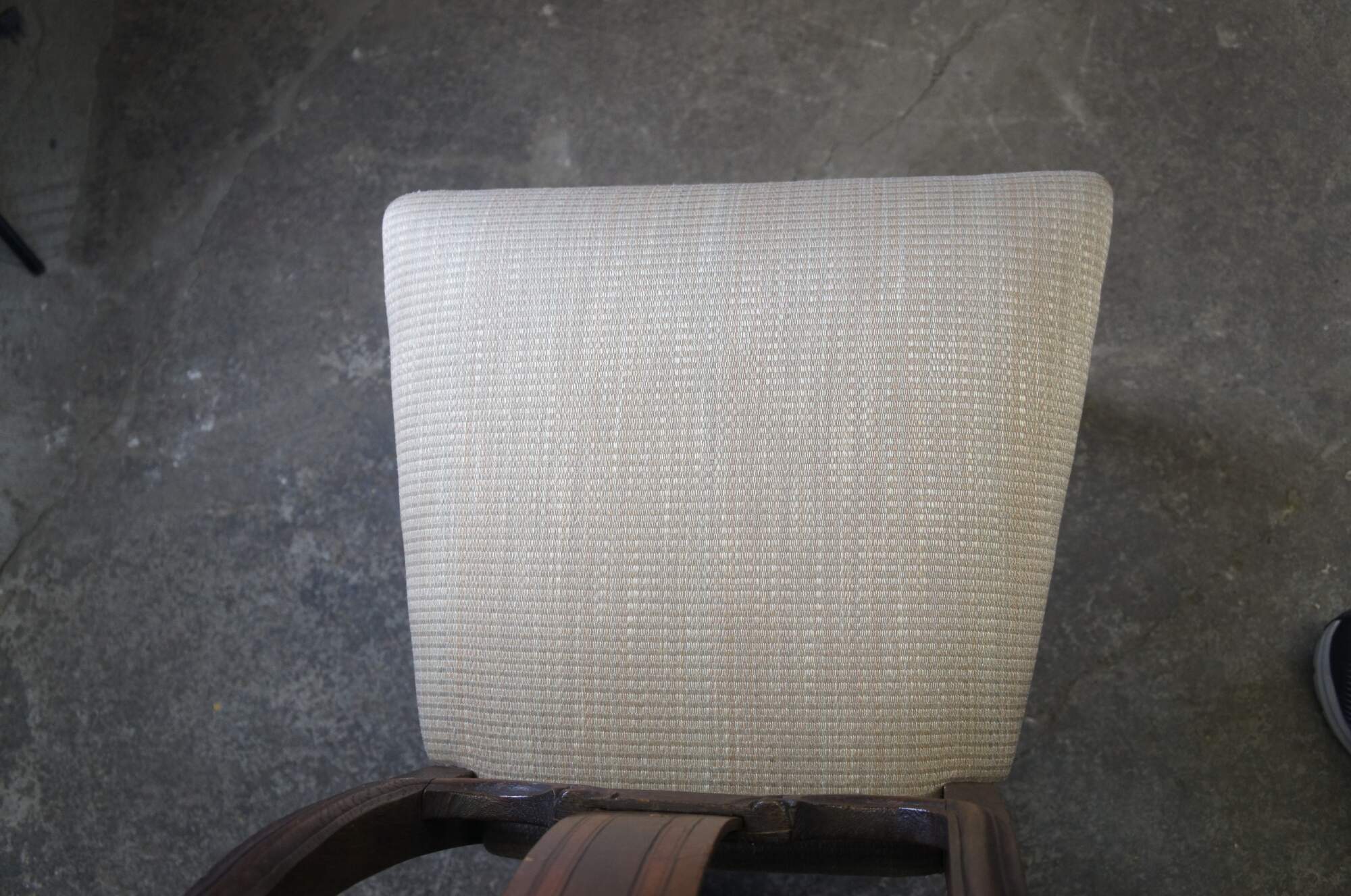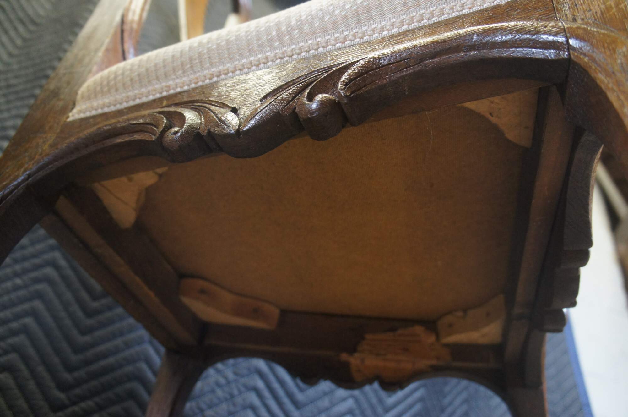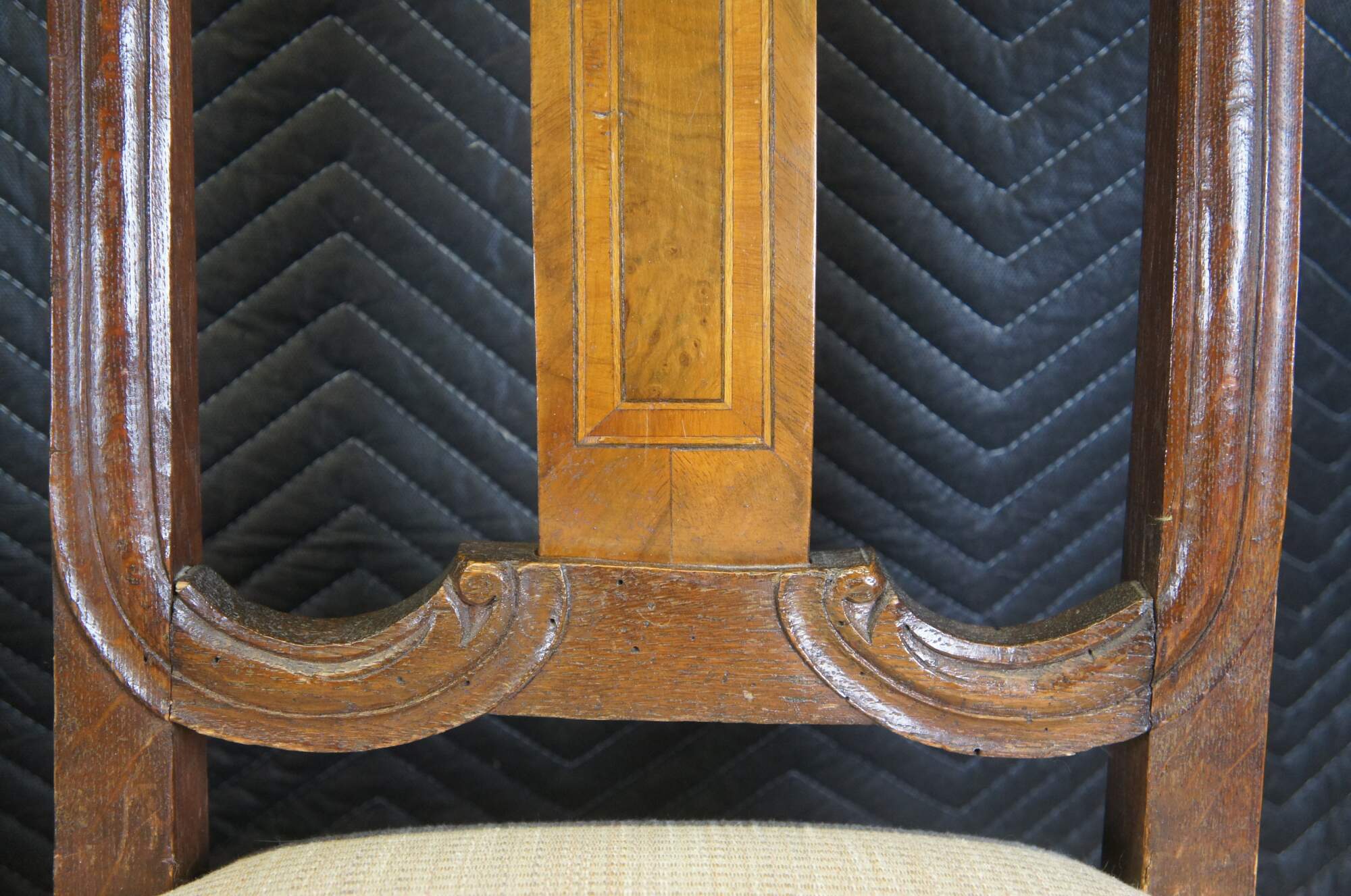 Fair antique condition, wear and distressing from age and use, worm holes, fading, marking, finish loss, split to top back of one.