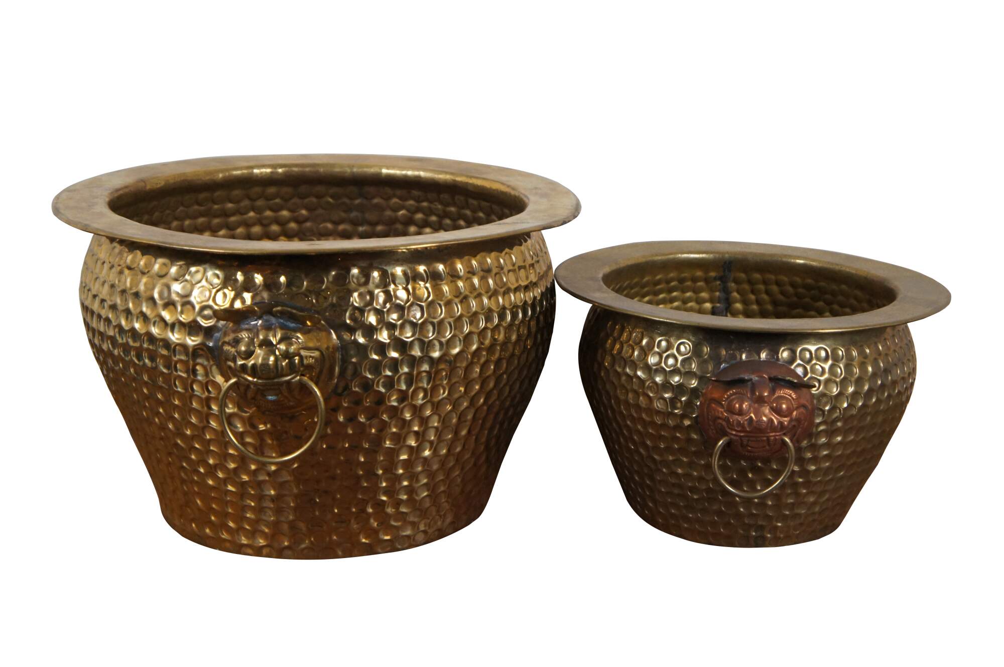 Three vintage Chinese nesting planters / jardinières / cachepots. Made of brass featuring round form with hammered dovetailed body that features foo dog / dragon / lion ring handles. The smallest one has copper handles.