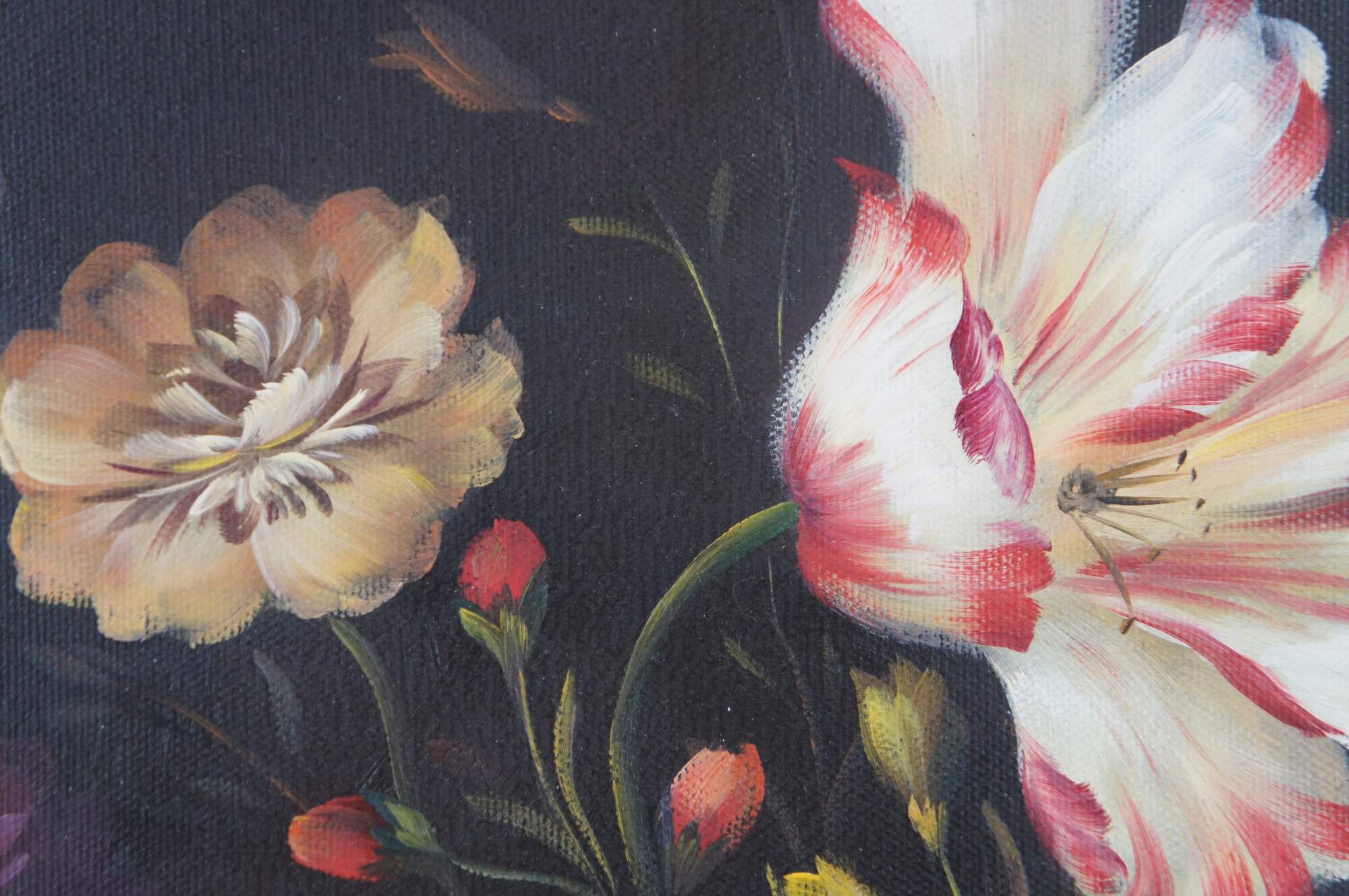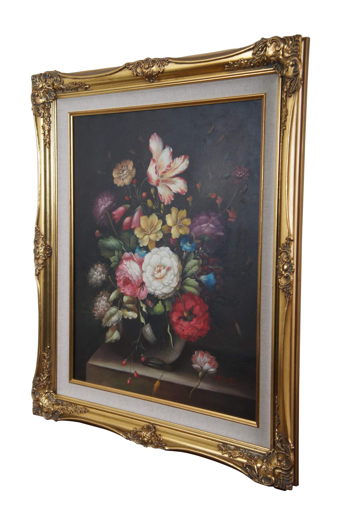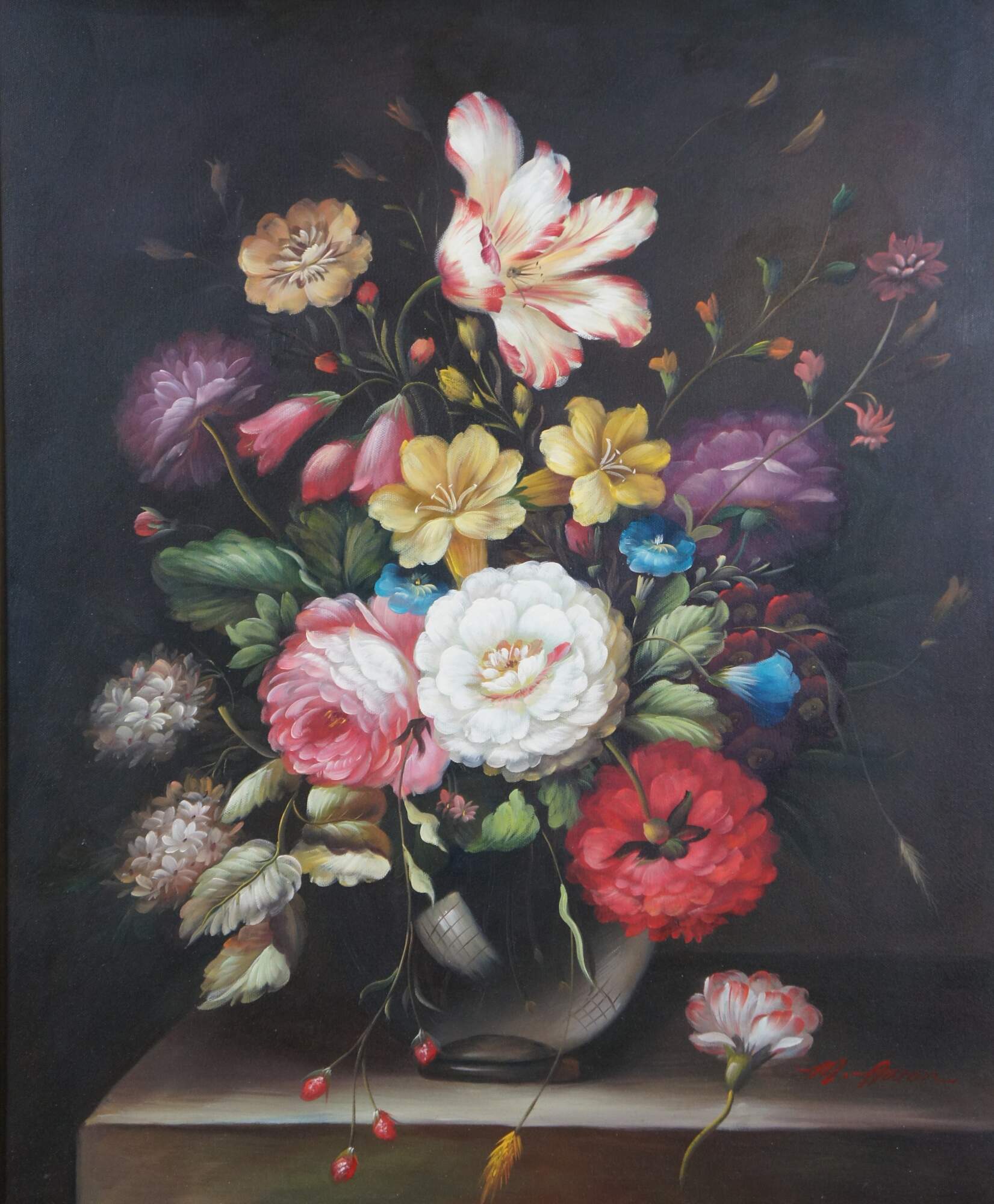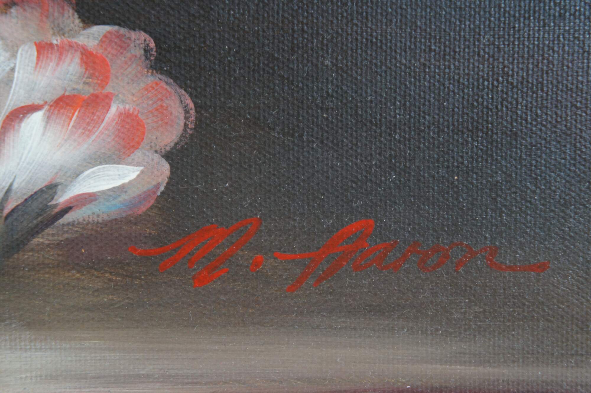 Vintage floral still life oil painting on canvas featuring a colorful bouquet of flowers in a vase on a table. Signed lower right M Aaron. Framed in ornate gold frame.
