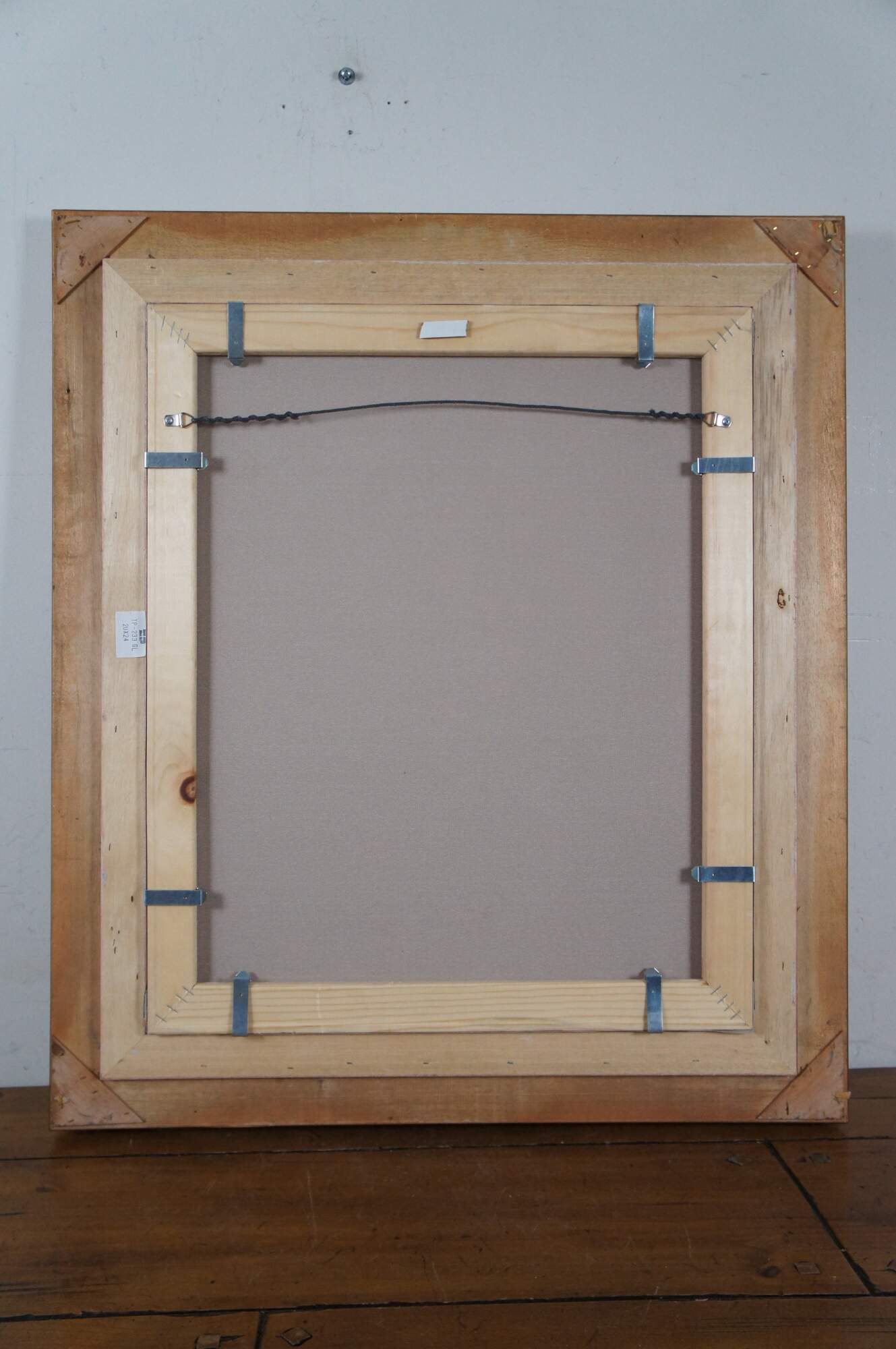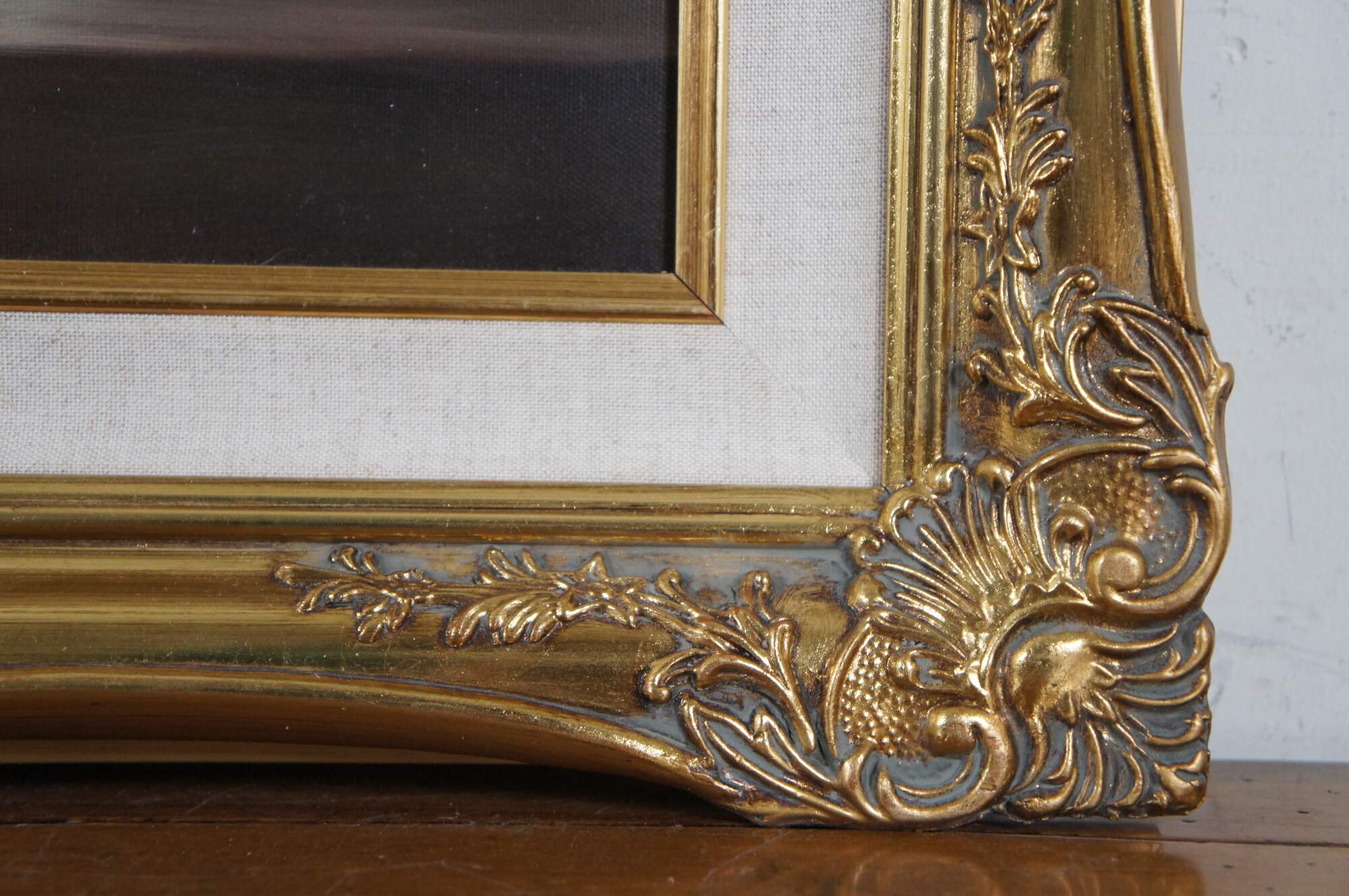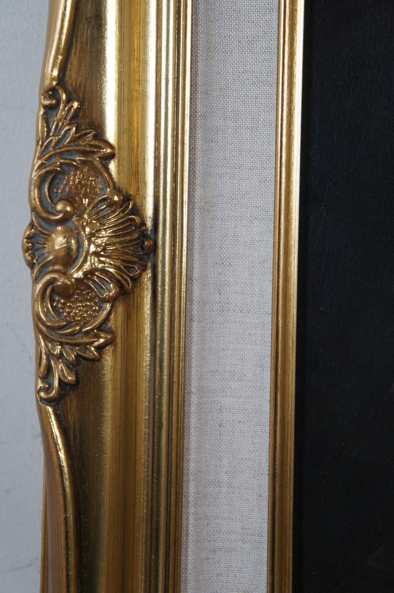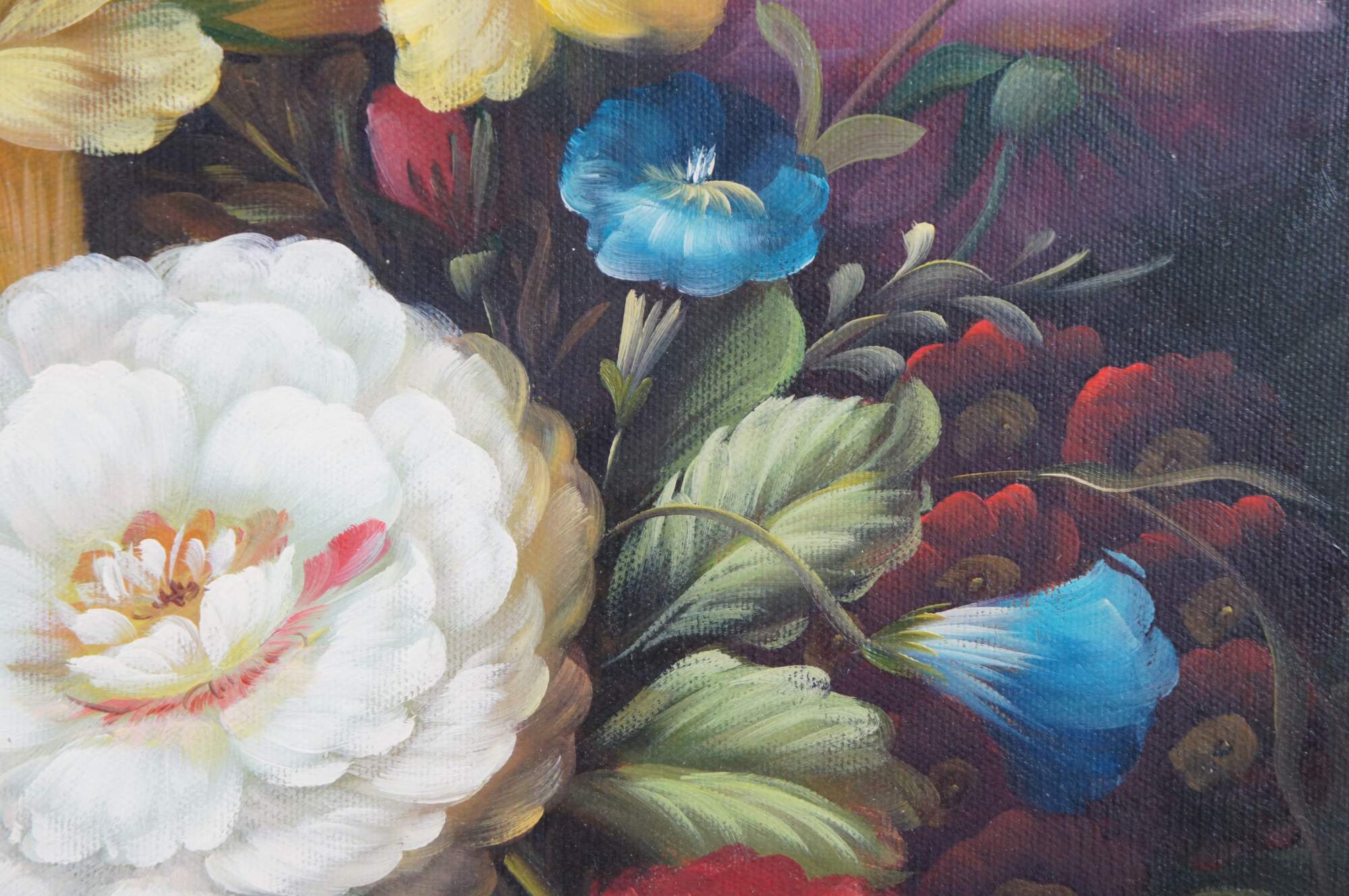 Vintage floral still life oil painting on canvas featuring a colorful bouquet of flowers in a vase on a table. Signed lower right M Aaron. Framed in ornate gold frame.
