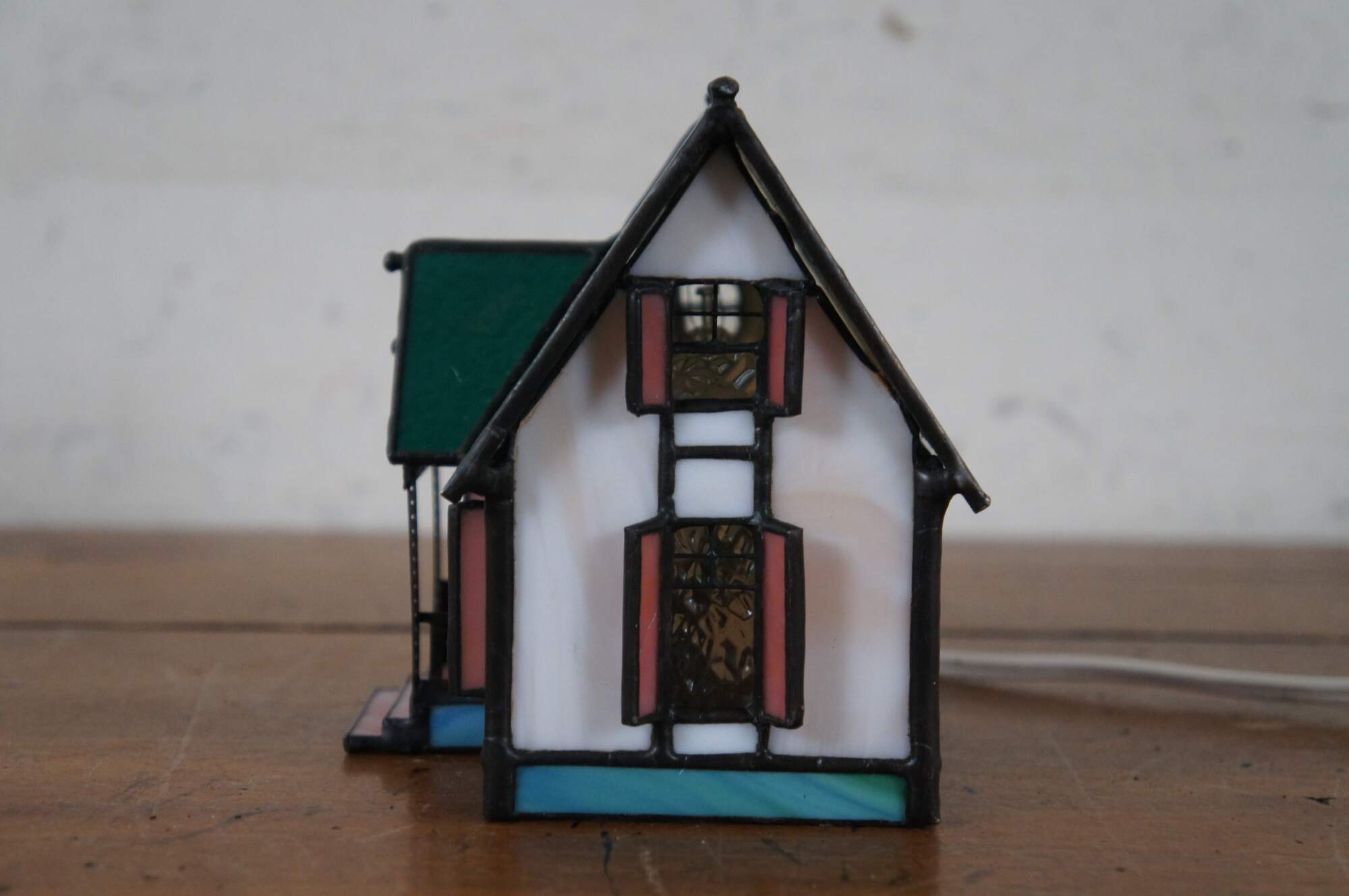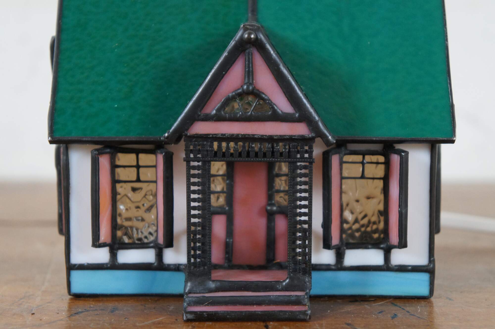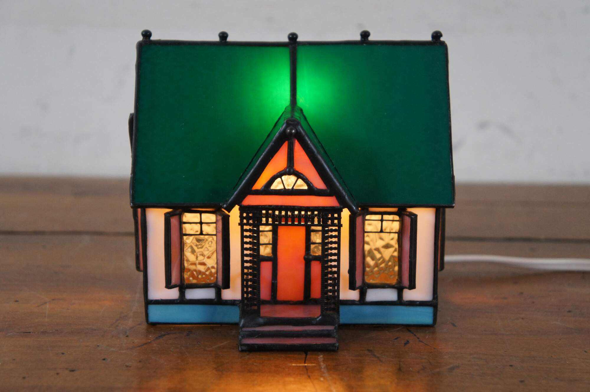 Vintage stained glass night light or lamp featuring a Victorian home or cottage with porch, shutters and green roof with finials.