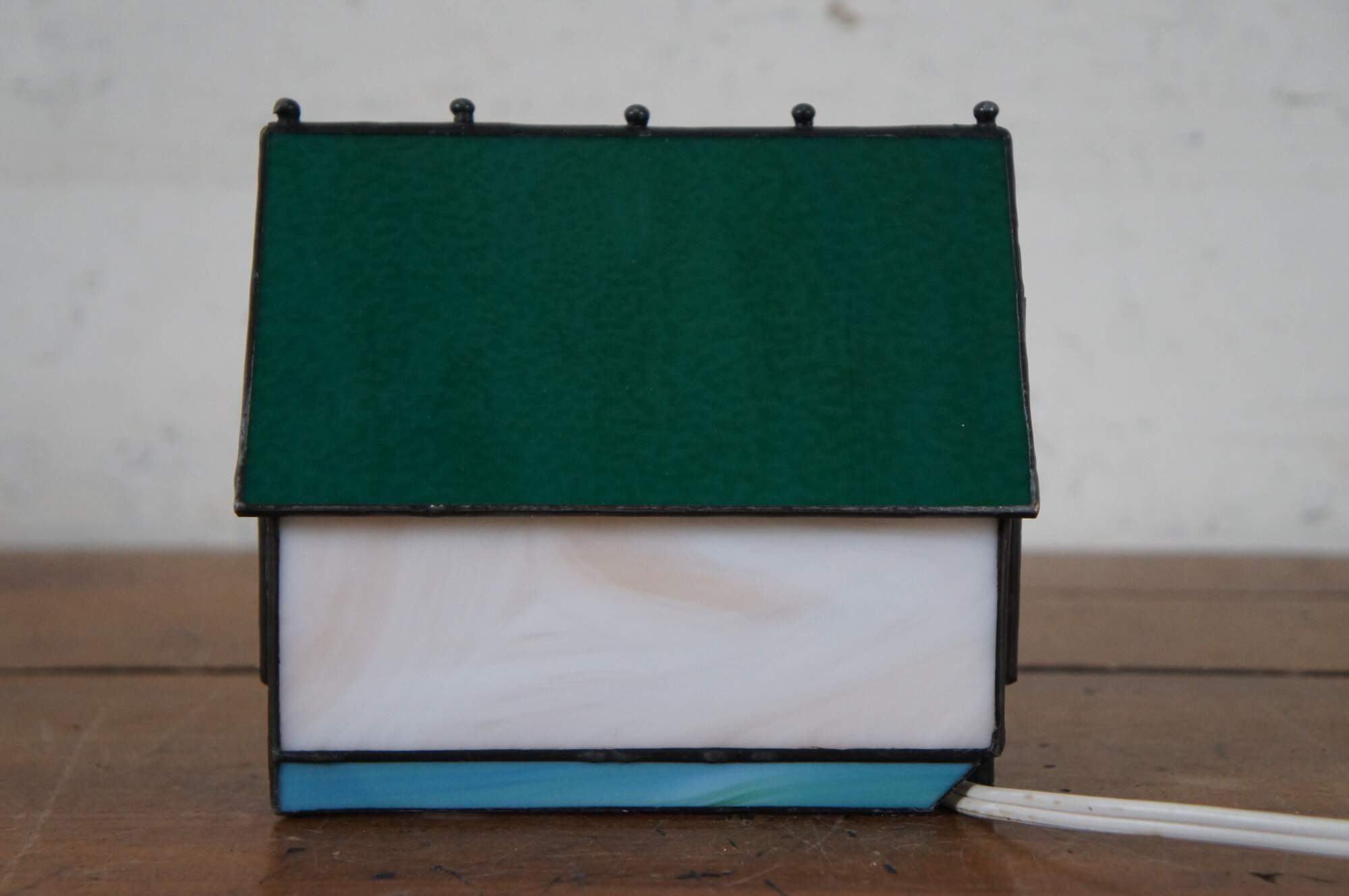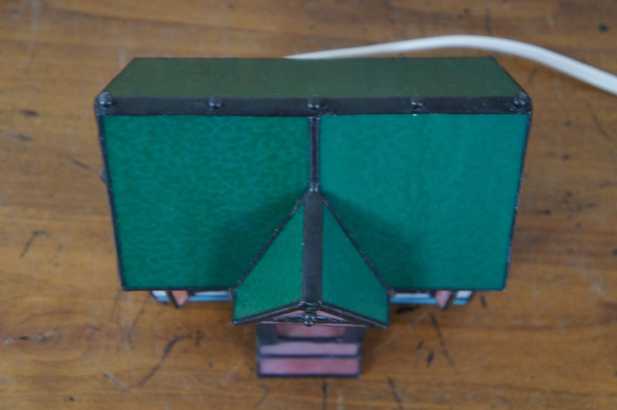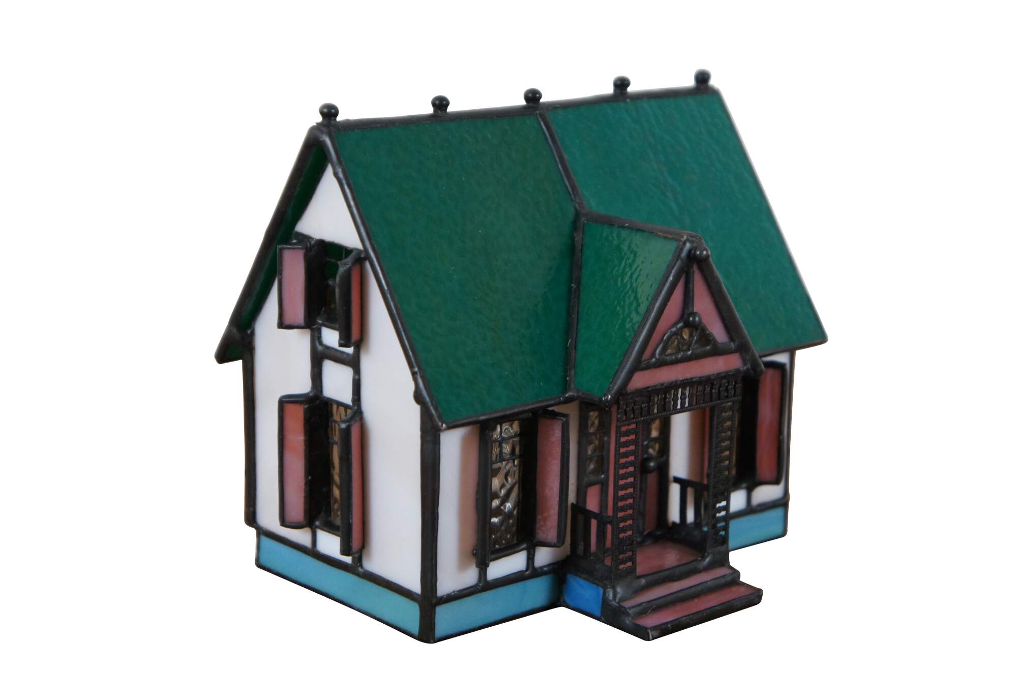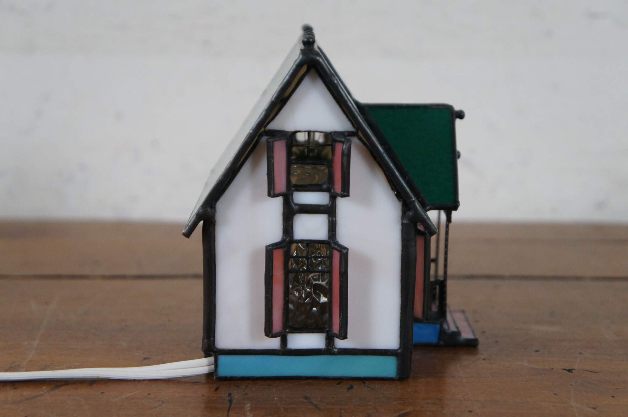 Vintage stained glass night light or lamp featuring a Victorian home or cottage with porch, shutters and green roof with finials.