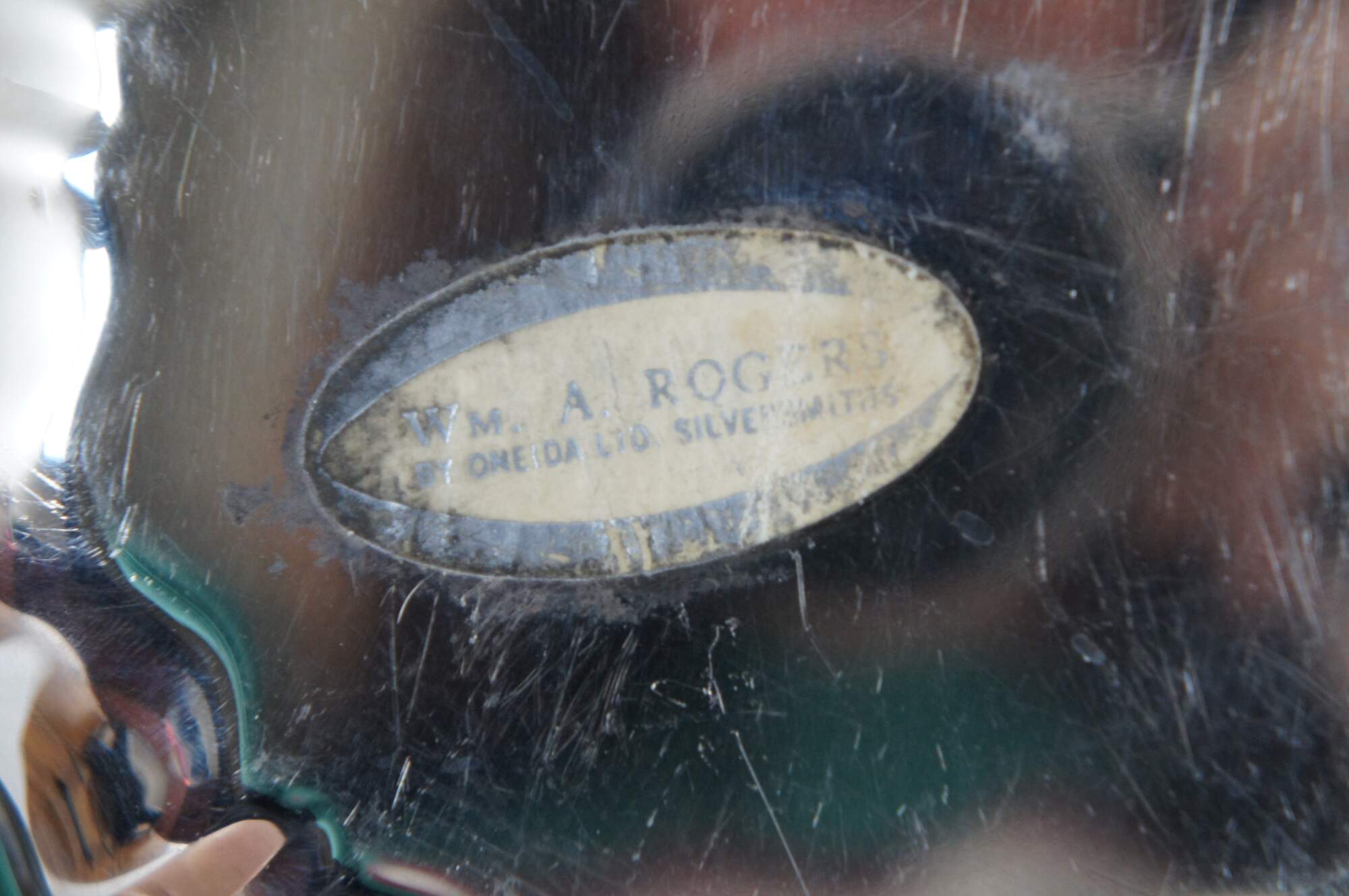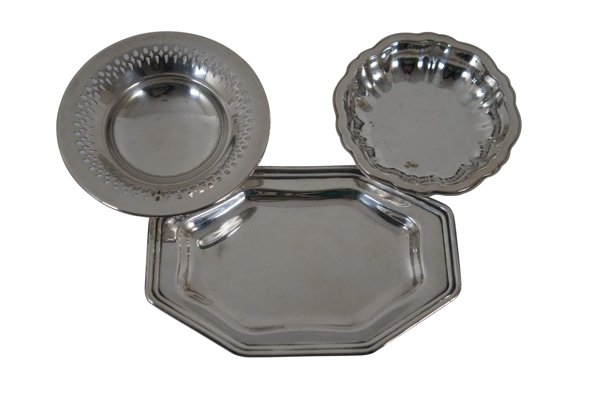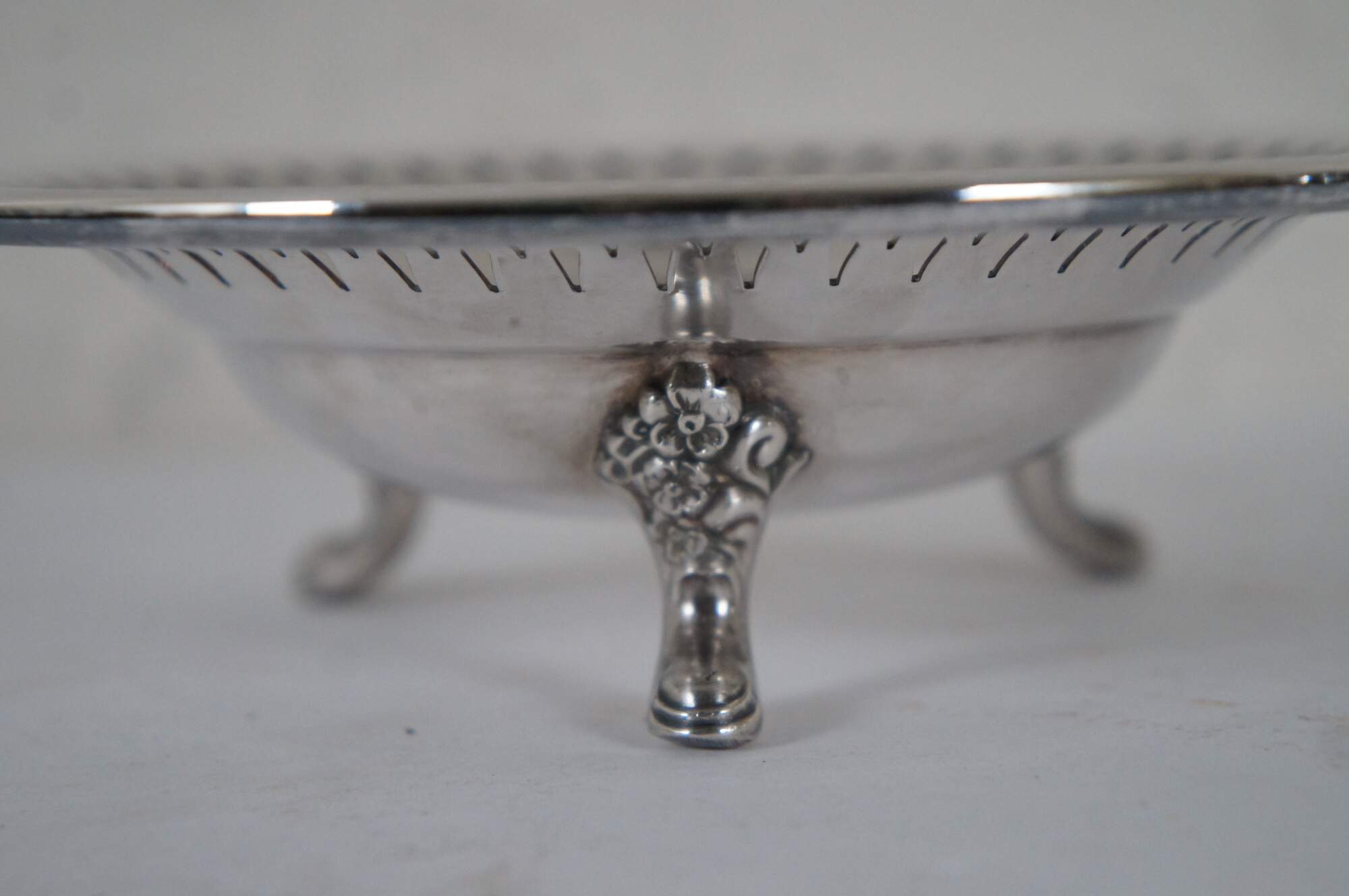 Four vintage silverplate serving pieces. Pitcher with ice catcher by FB Rogers Silver Co 1883, reticulated pierced footed compote dish or bowl, octagonal dish / plate / vanity tray by English Plating, and scalloped compote dish or bowl WM Rogers Oneida Silversmiths.