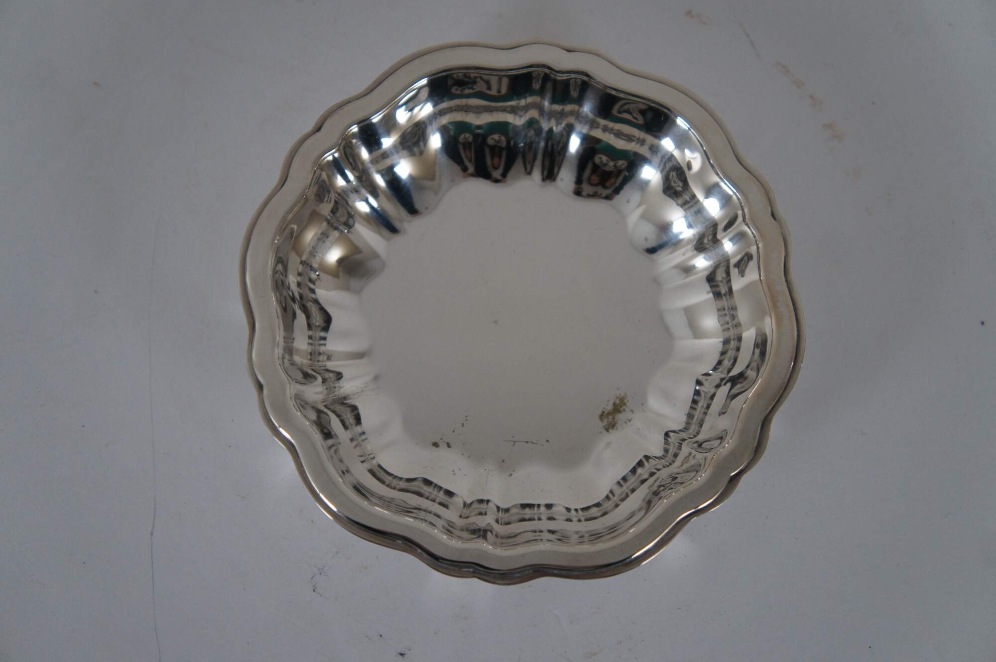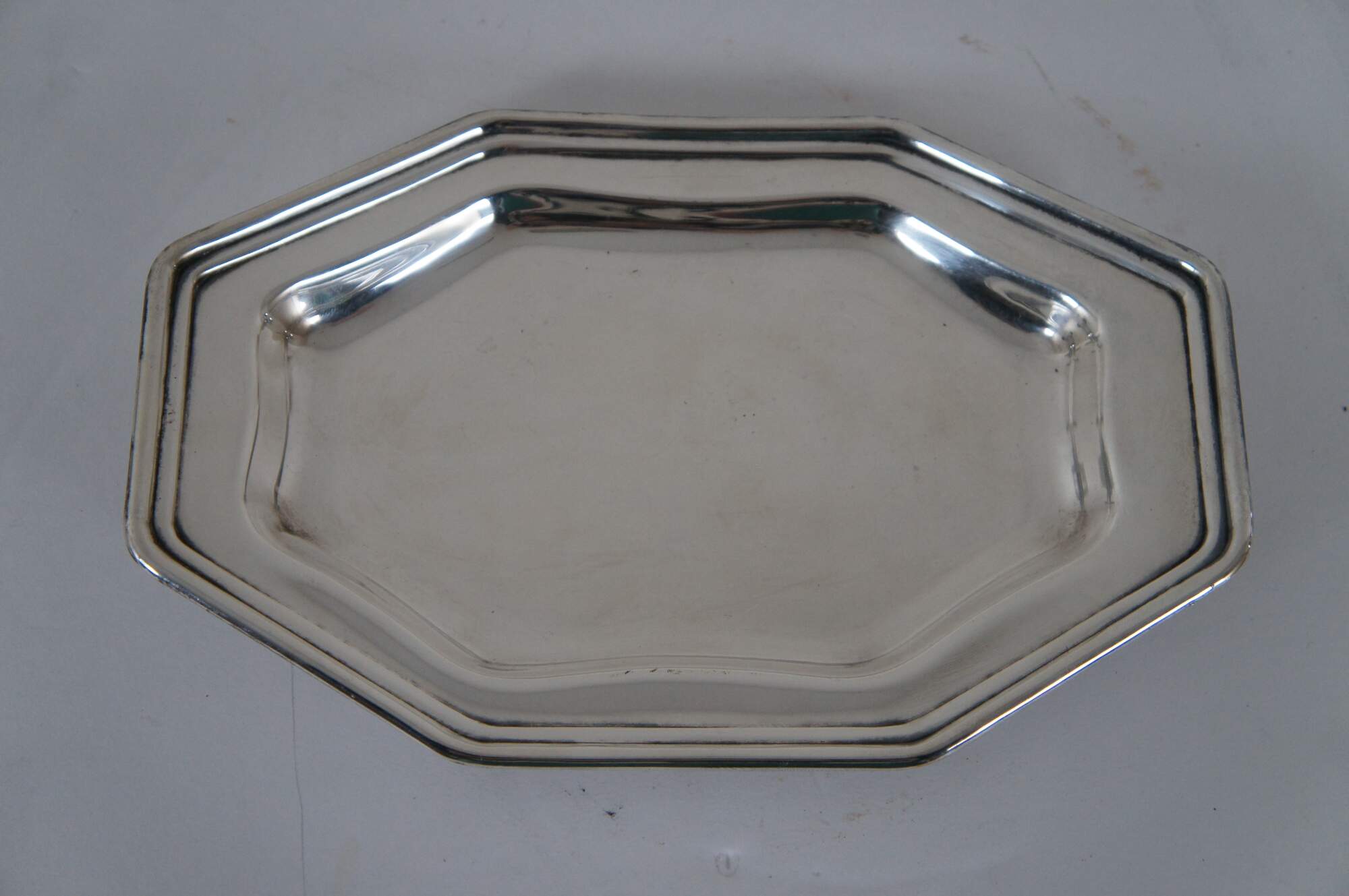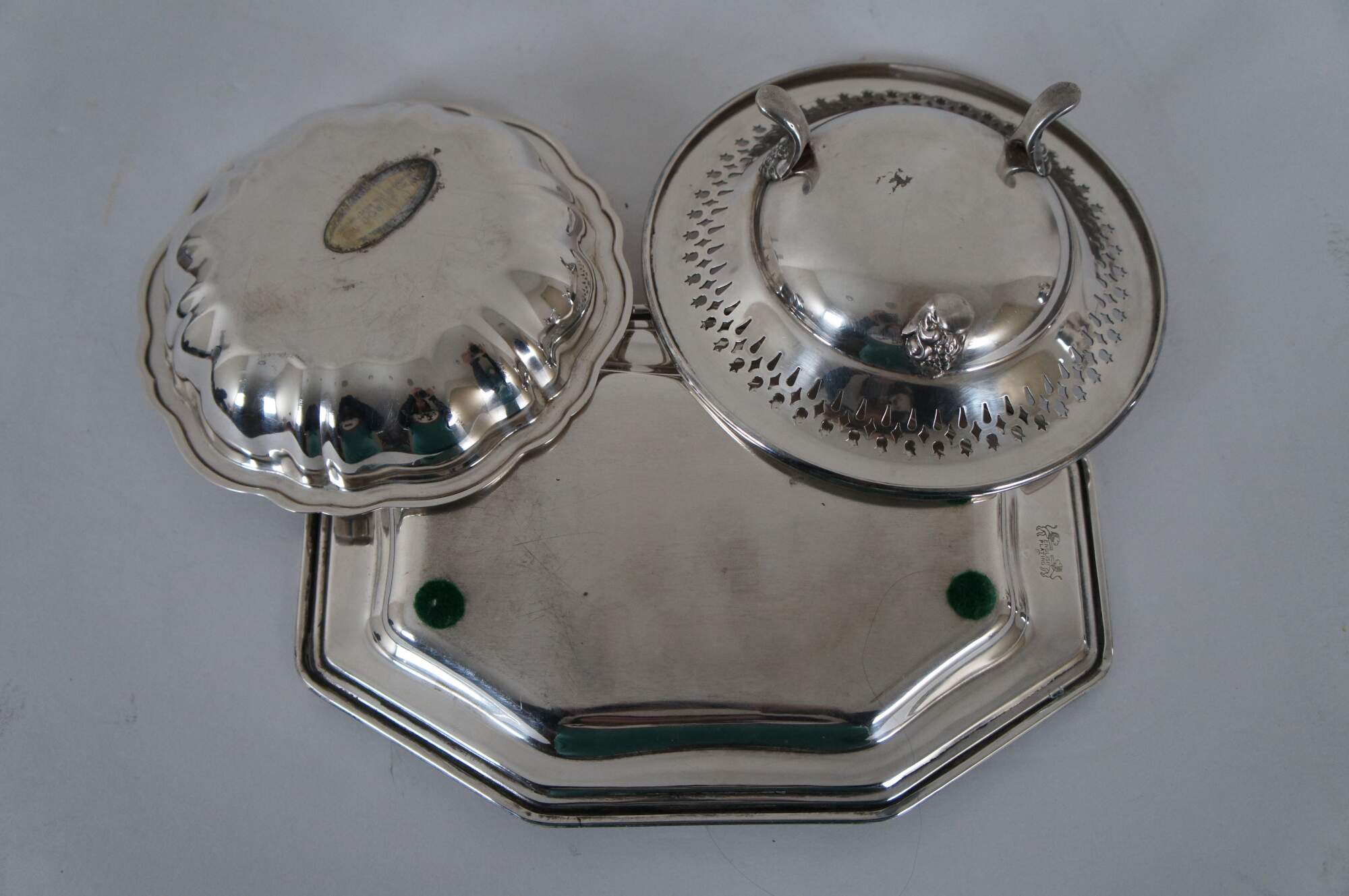 Four vintage silverplate serving pieces. Pitcher with ice catcher by FB Rogers Silver Co 1883, reticulated pierced footed compote dish or bowl, octagonal dish / plate / vanity tray by English Plating, and scalloped compote dish or bowl WM Rogers Oneida Silversmiths.