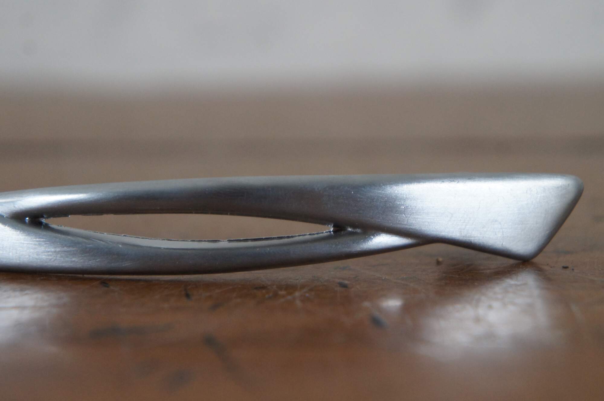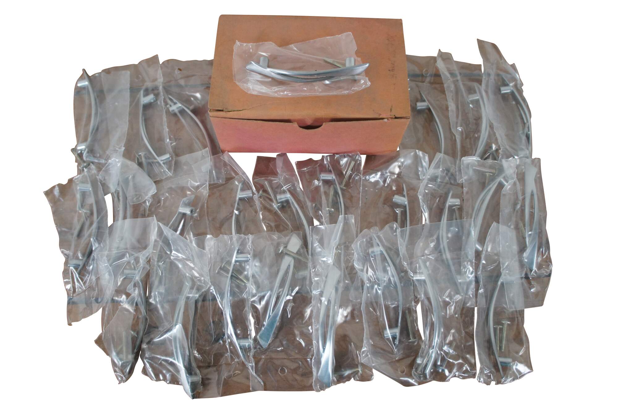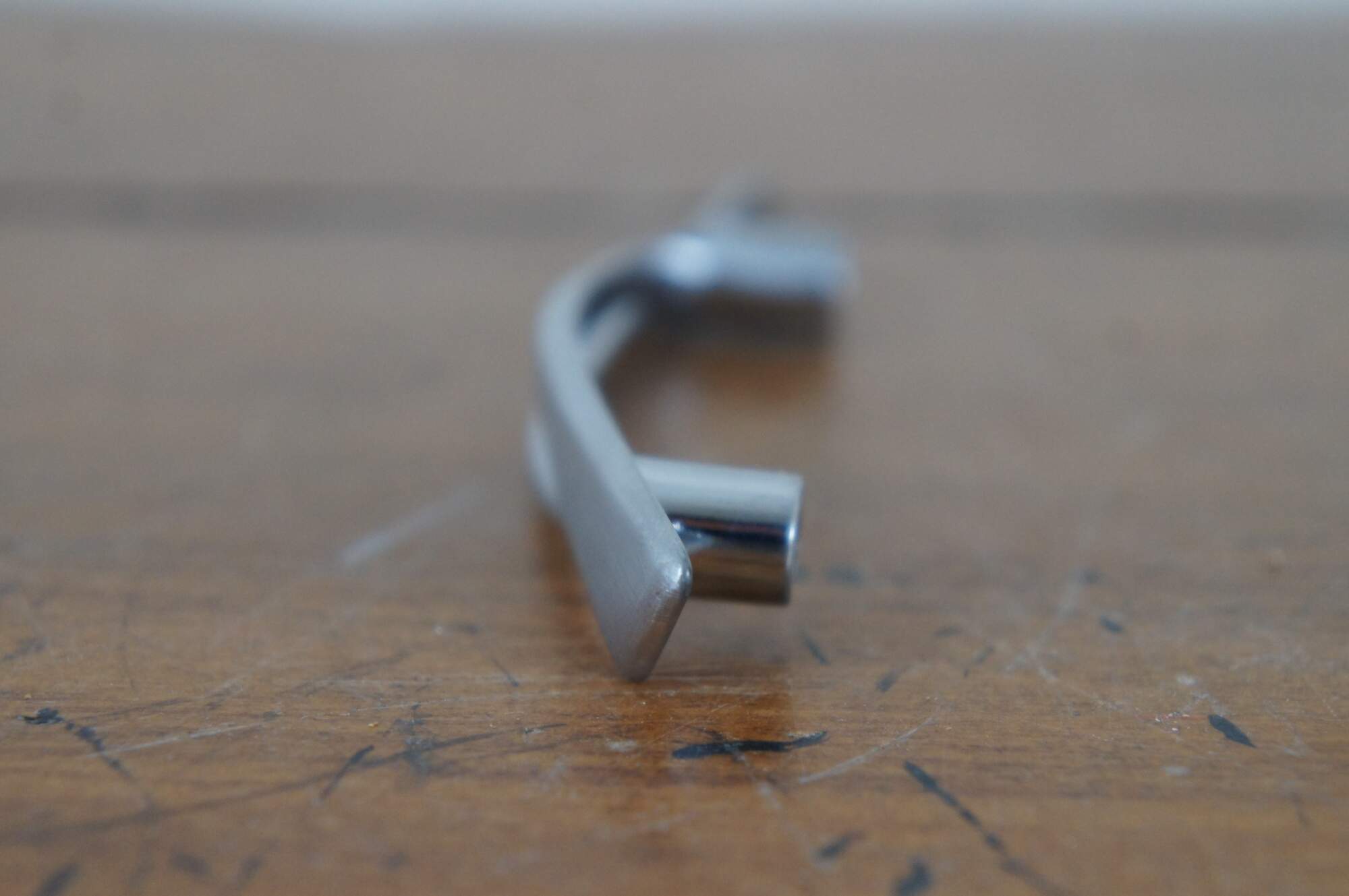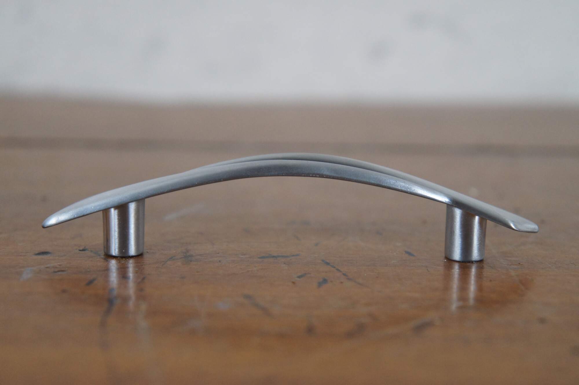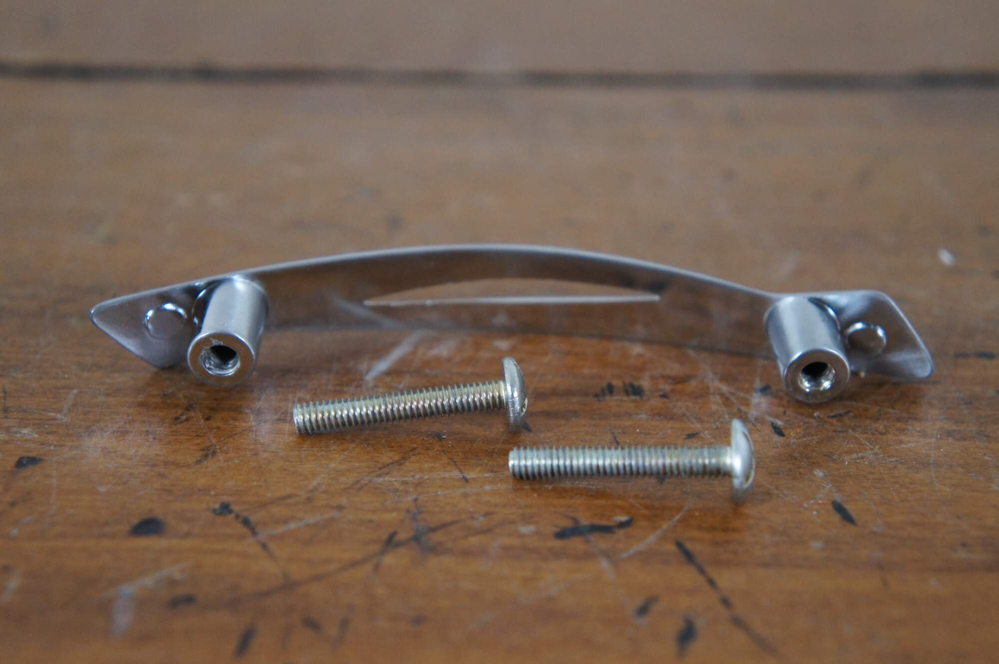 25 Available – mid century modern style National Lock Co Medalist hardware, item number C299 drawer pulls, die cast Galaxie shape, in dull chrome (26D). 3" center hole, 4.5" length, screws included. 61-769.