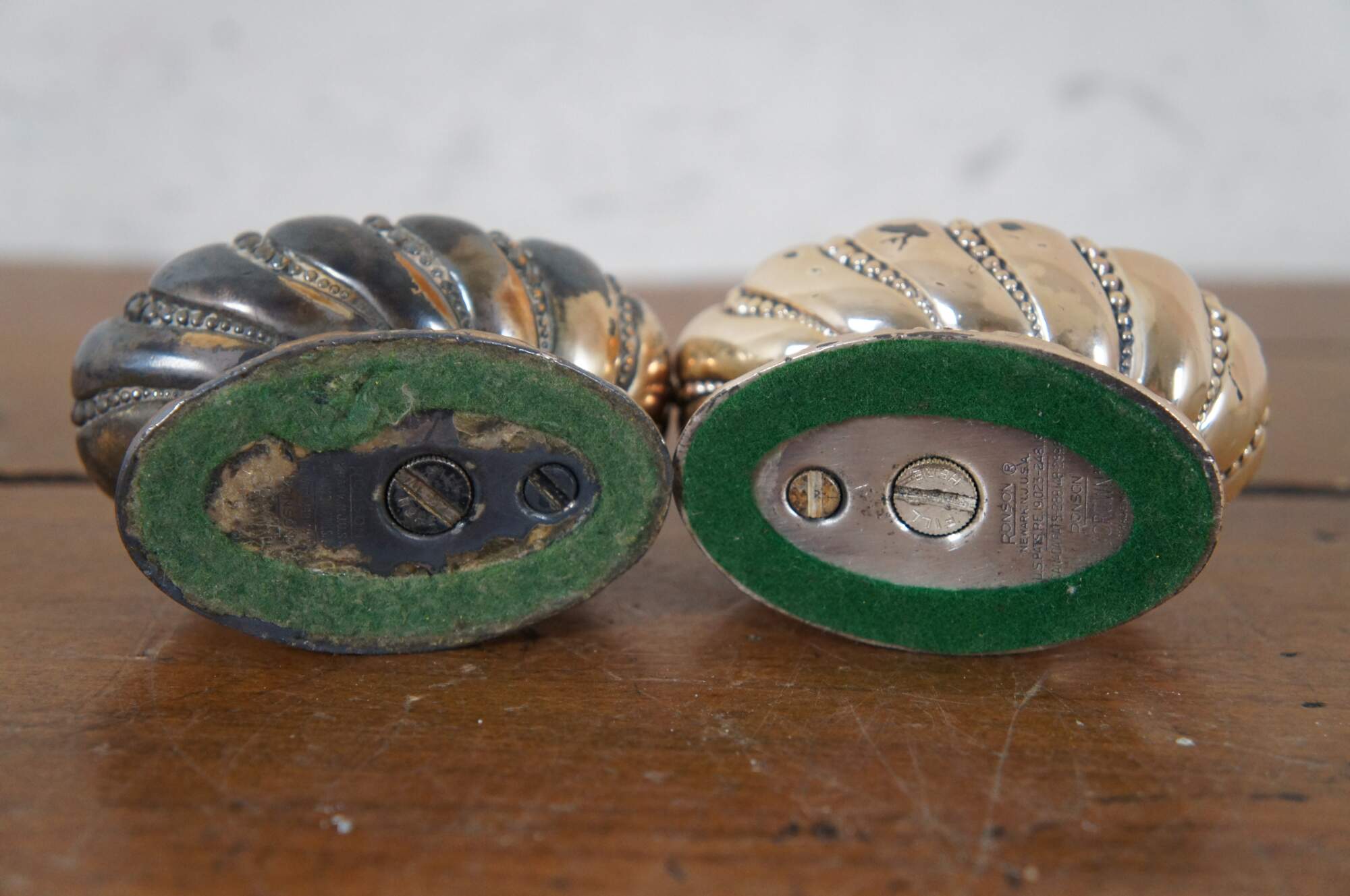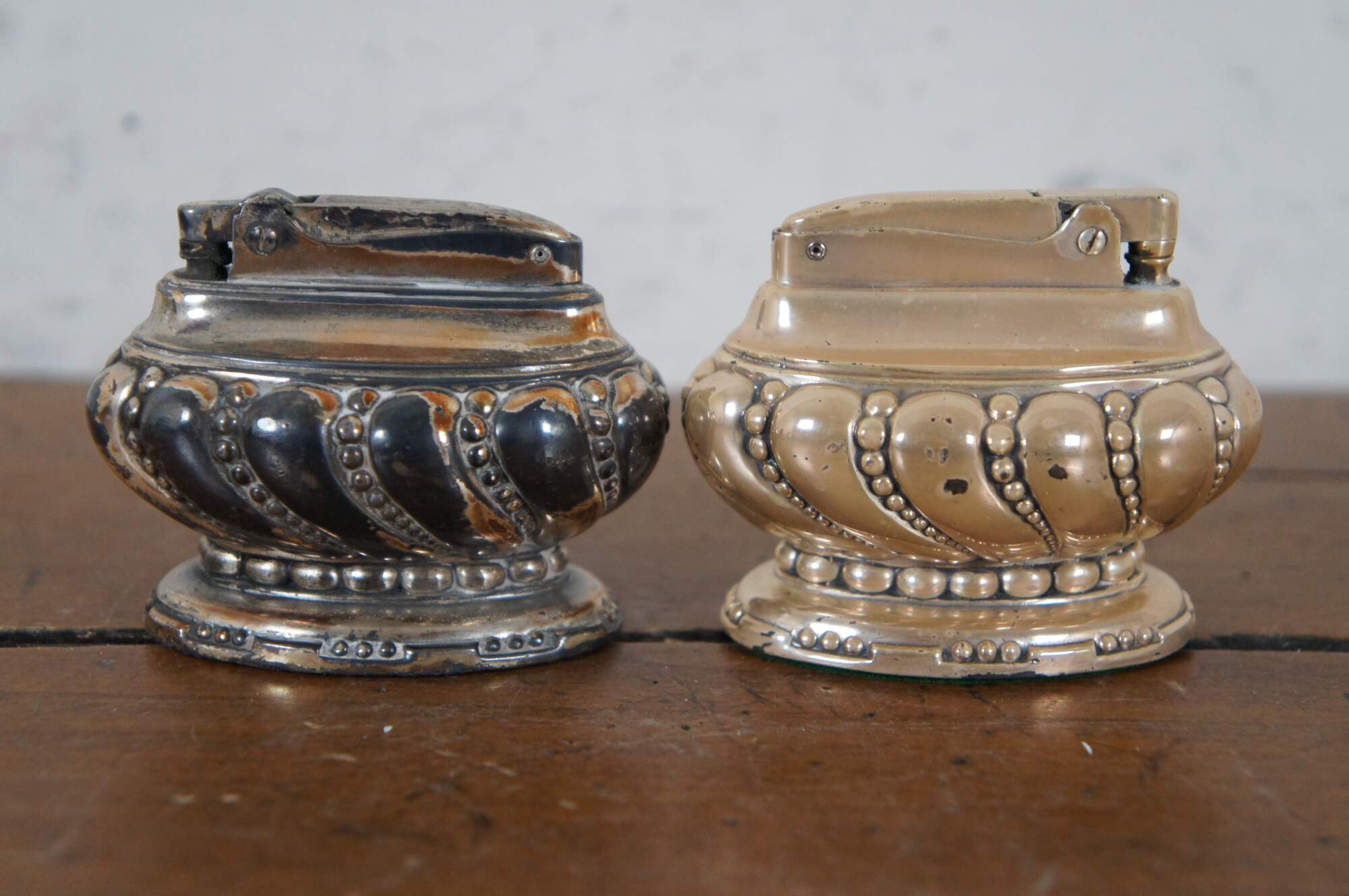 Pair mid 20th century Ronson "Crown" tobacco table lighters featuring a footed oval body molded with swirling beaded details.