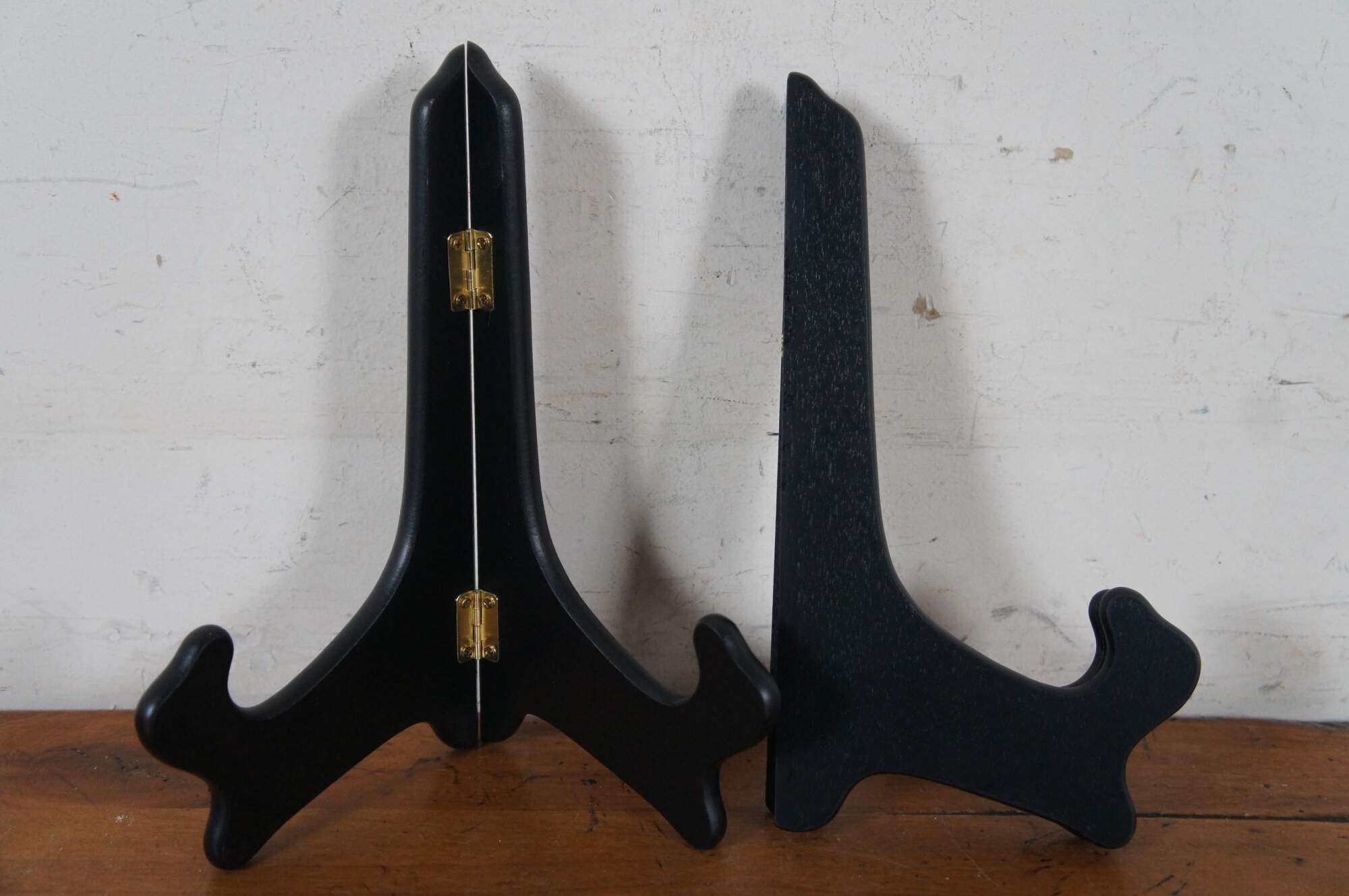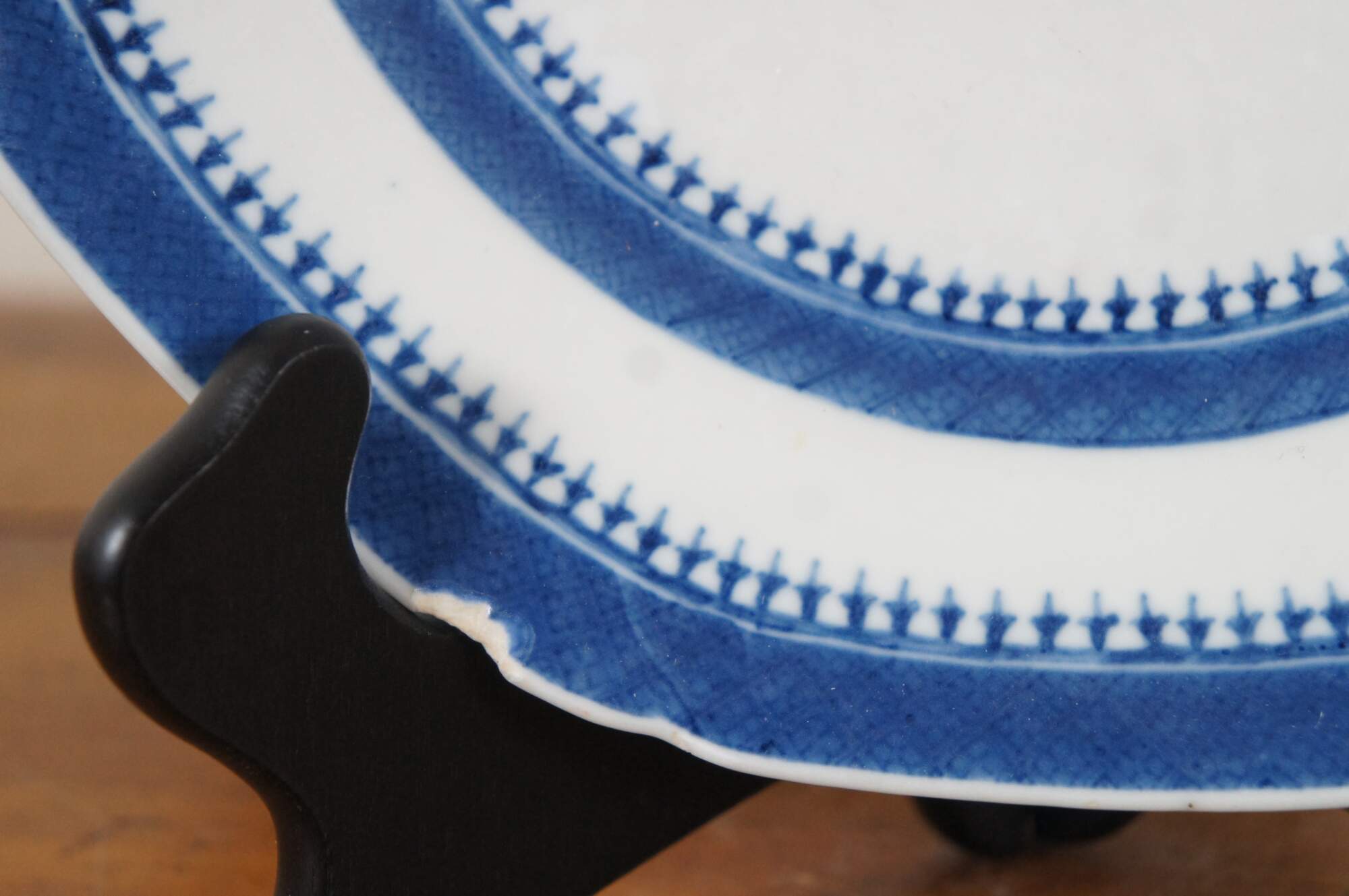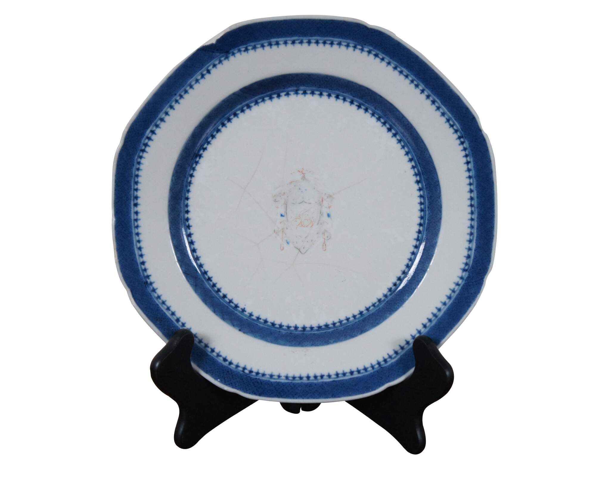 Pair of 18th century Chinese Export porcelain plates featuring slightly scalloped edges, hand painted blue and white borders and armorial crest / coat of arms at the center. Includes two folding stands for display.