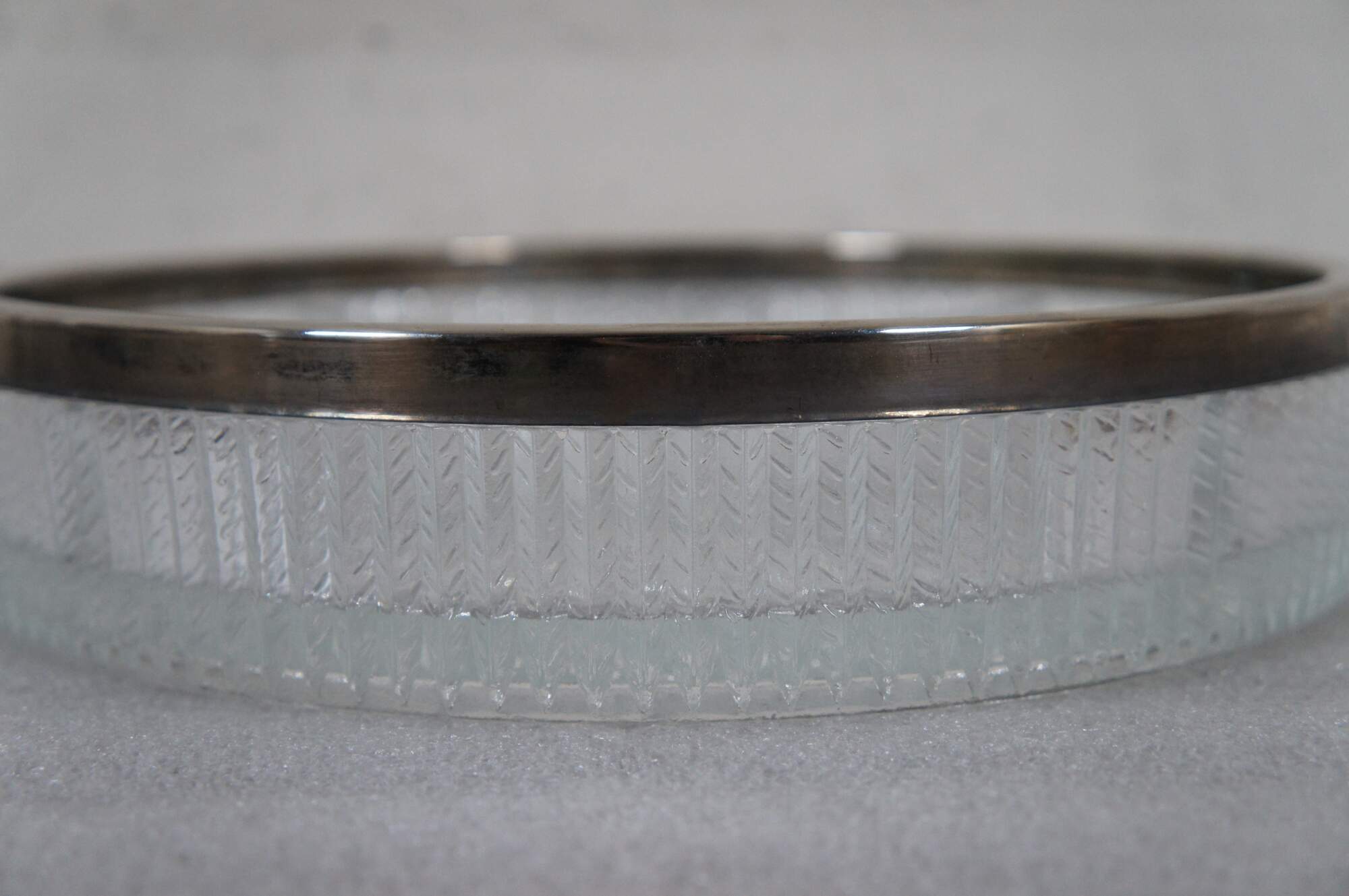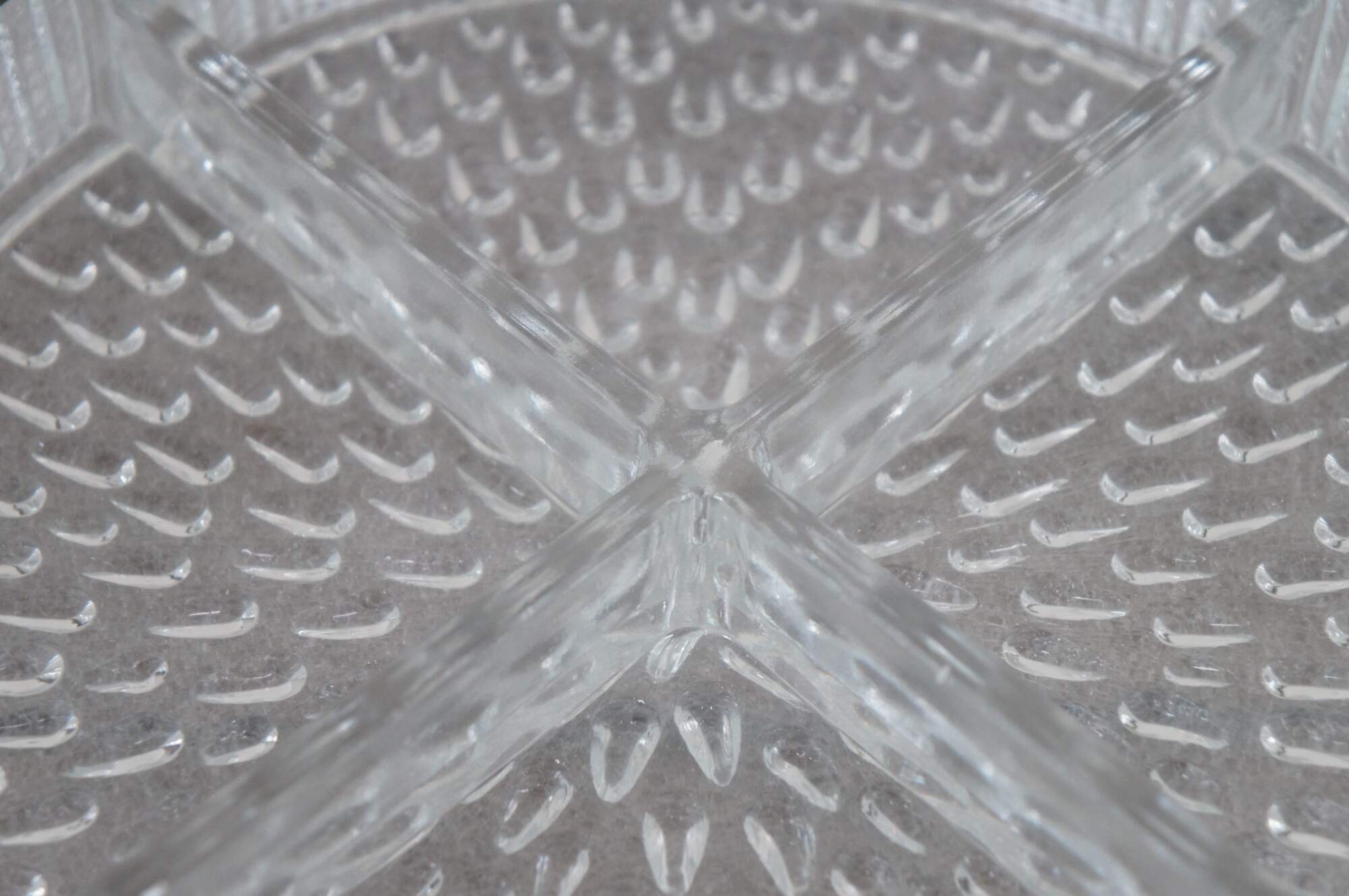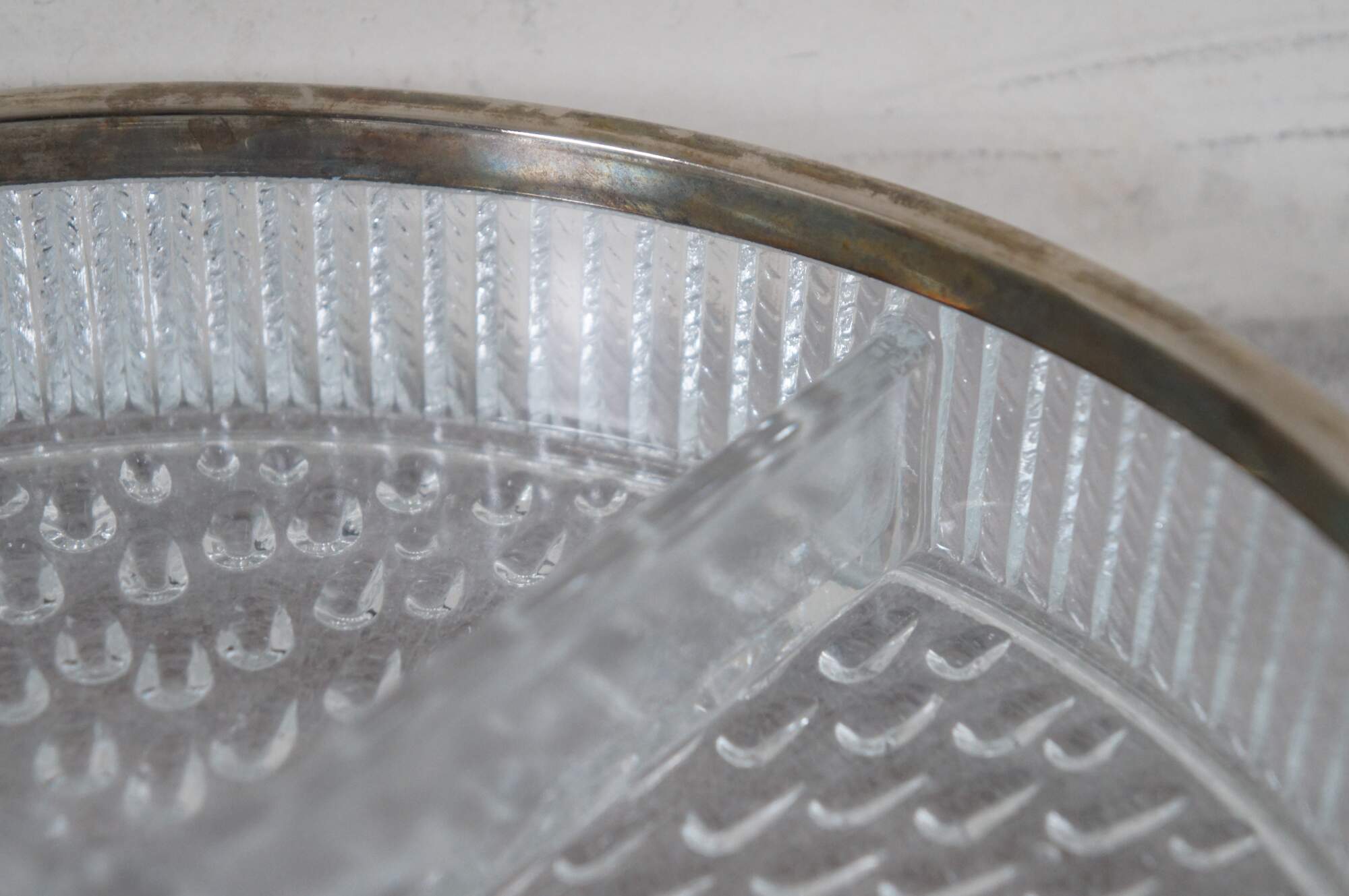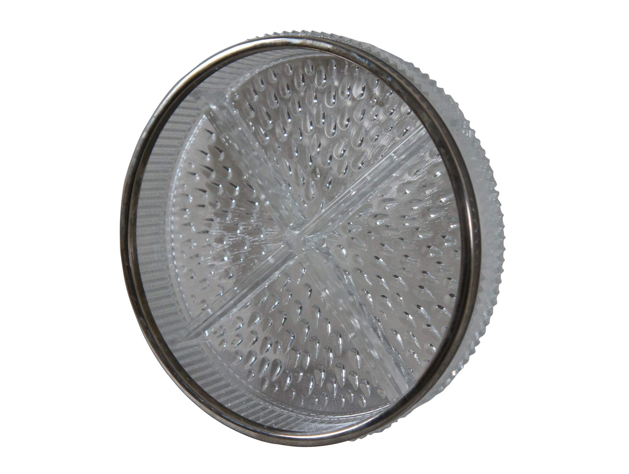 Mid to late 20th century pressed glass four section, round, divided serving dish with silver plate edge. Features teardrop pattern on base with ribbed herringbone sides. Marked England on rim.