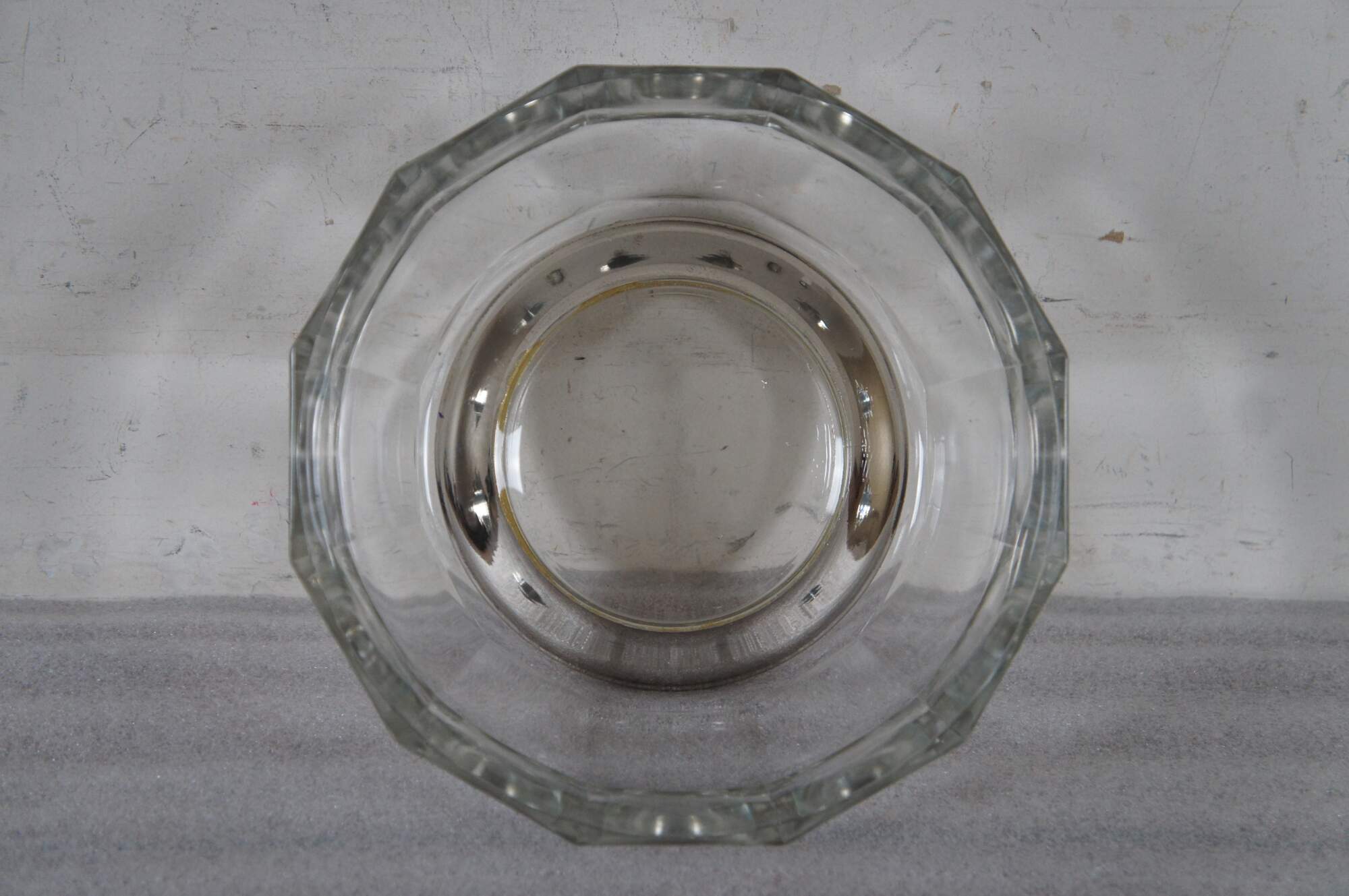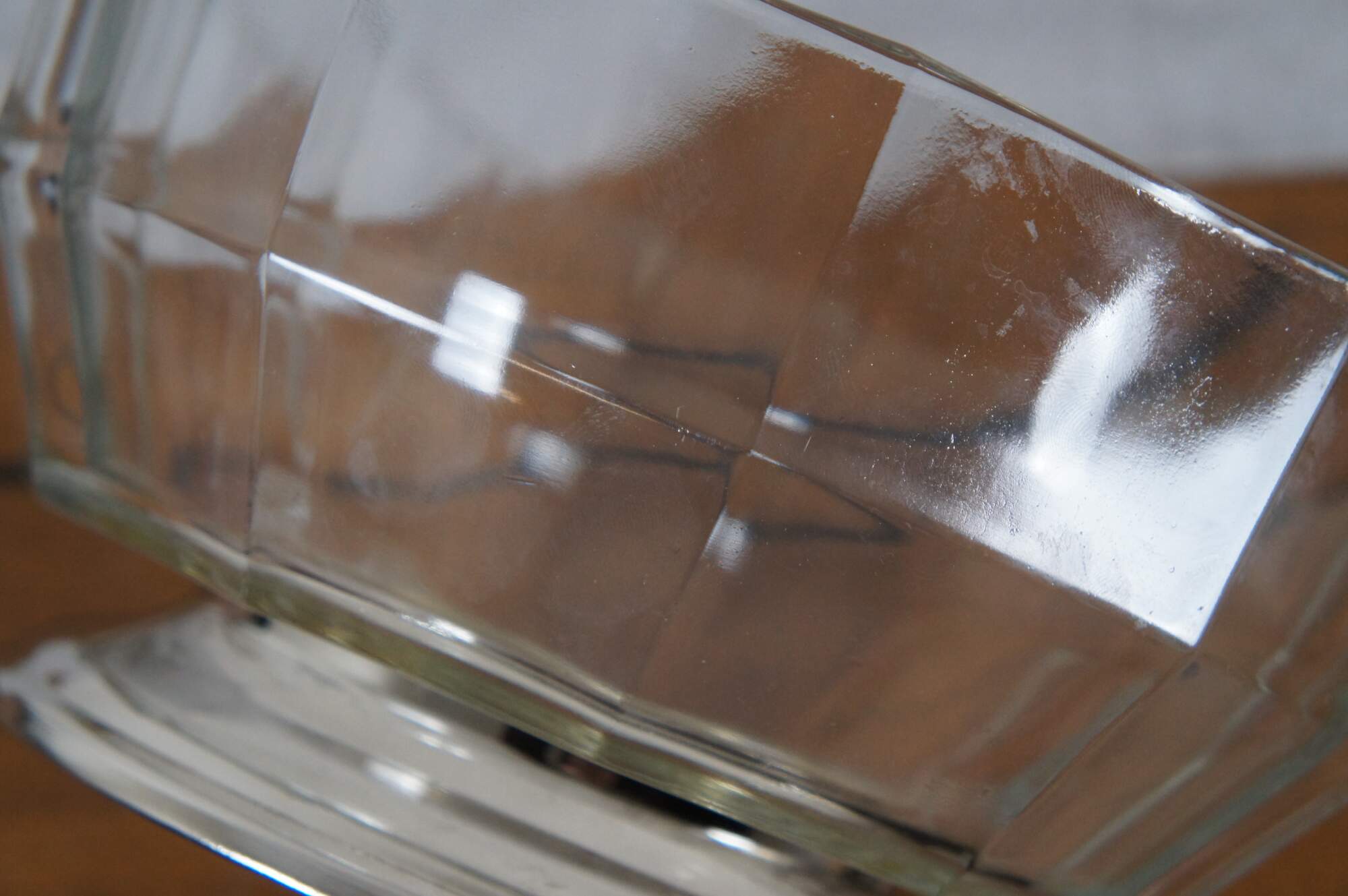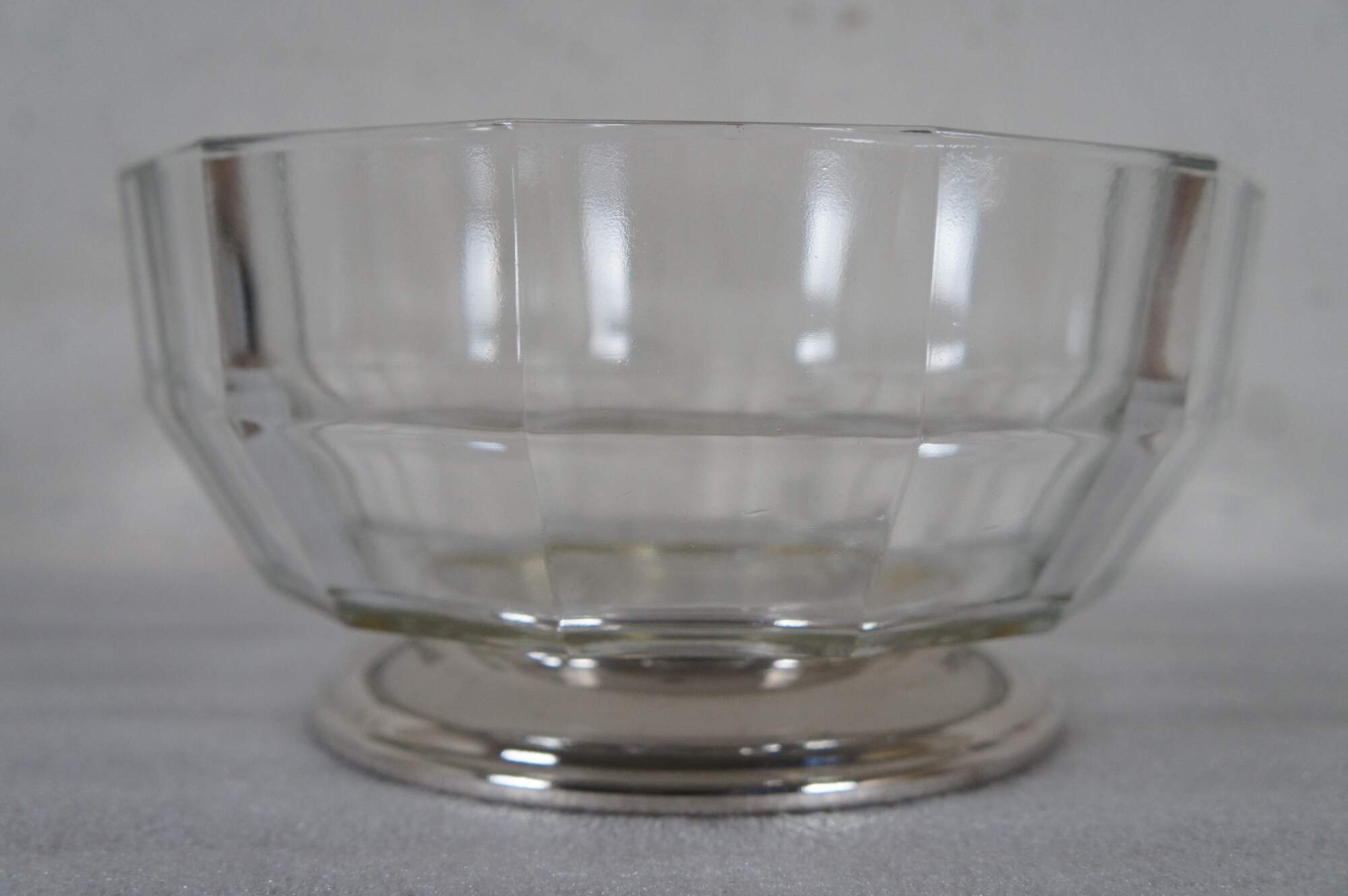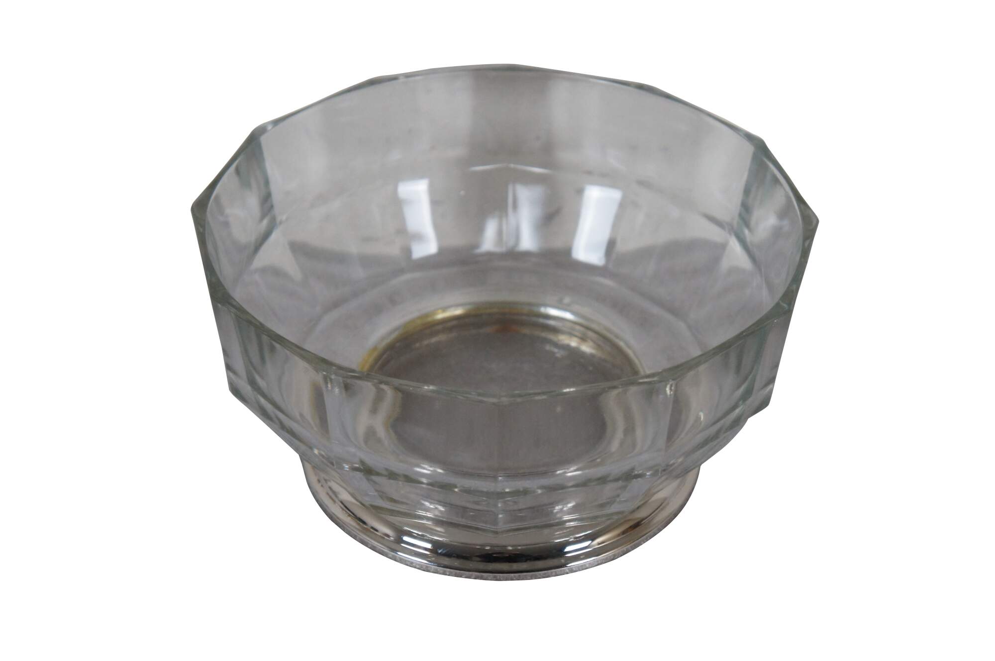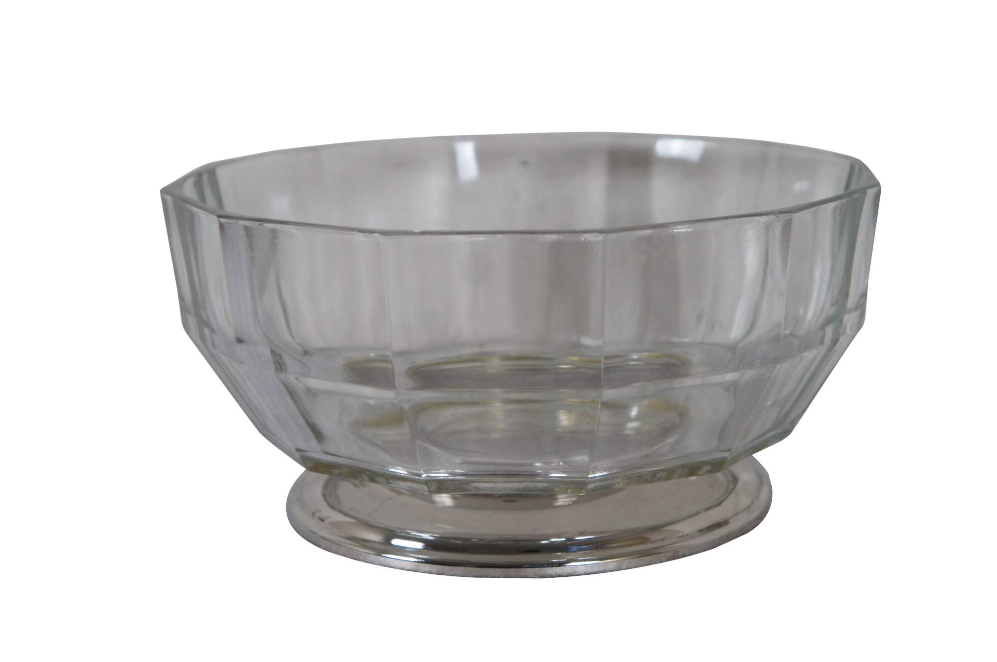 Mid to late 20th century pressed glass centerpiece / fruit bowl featuring a mid century modern faceted design and silver plate base.