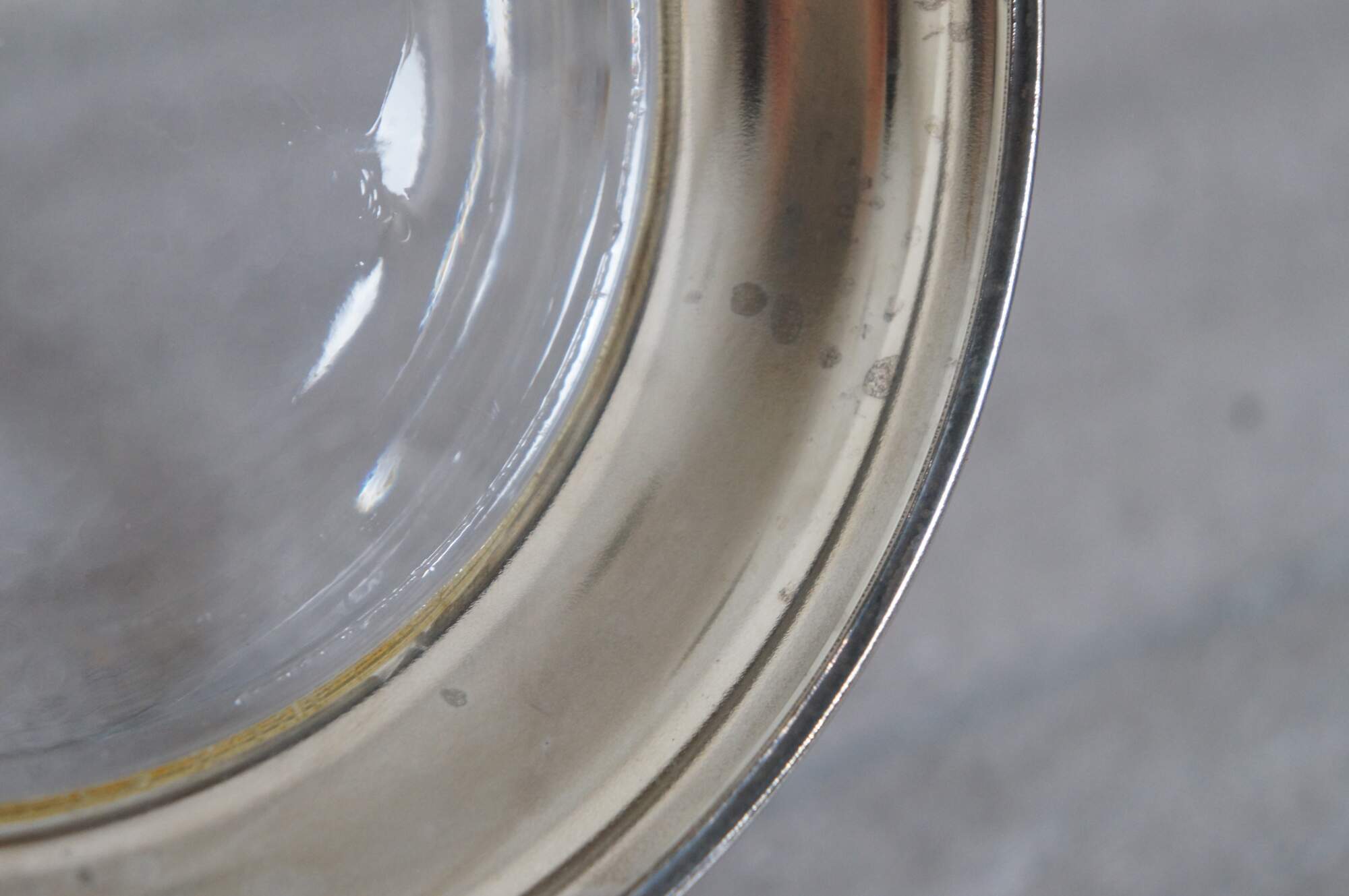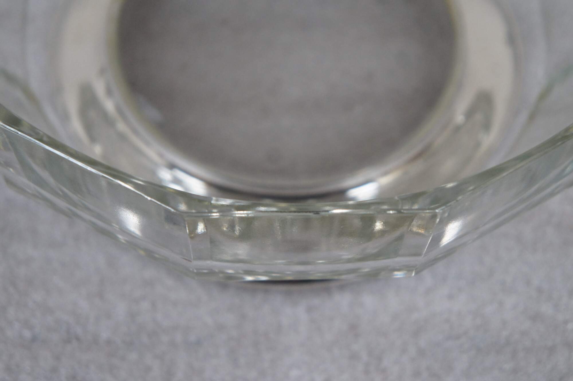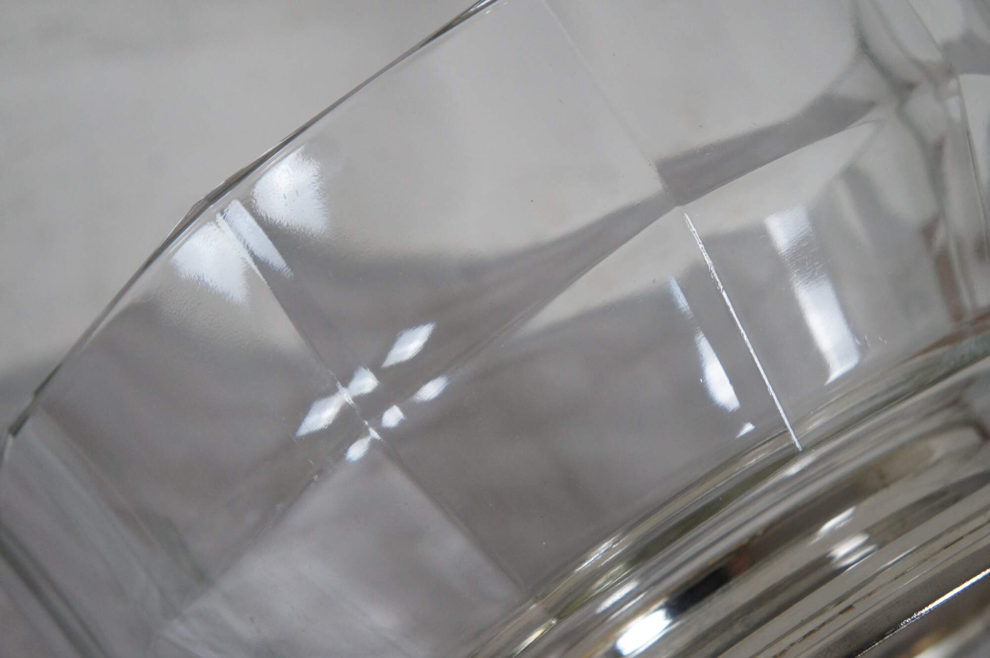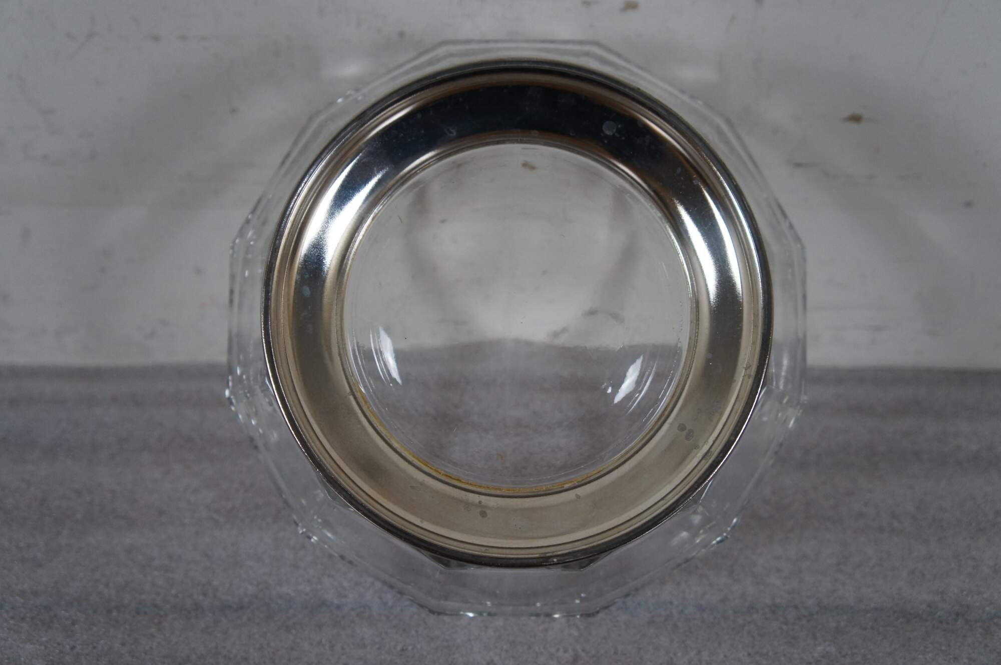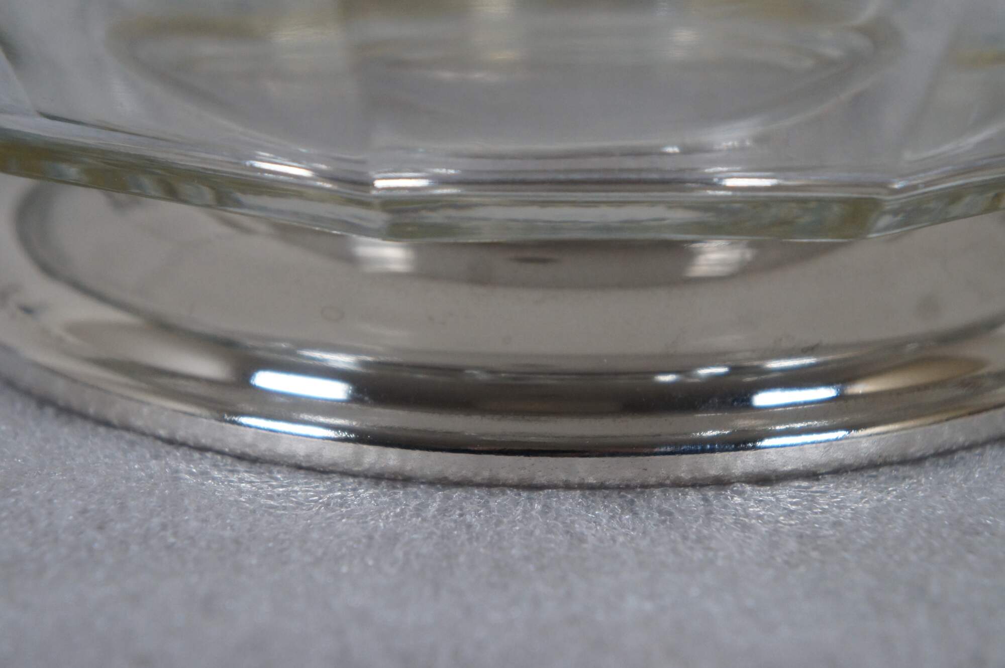 Mid to late 20th century pressed glass centerpiece / fruit bowl featuring a mid century modern faceted design and silver plate base.