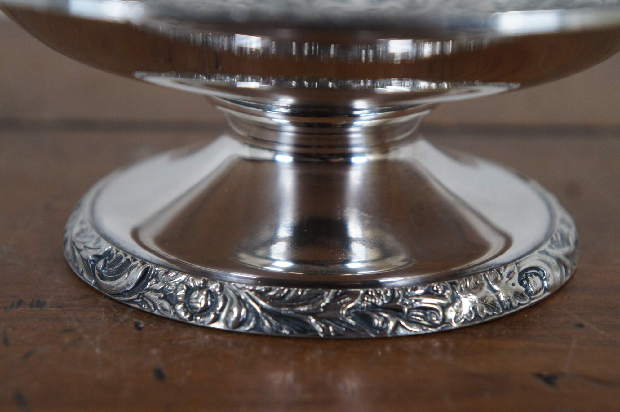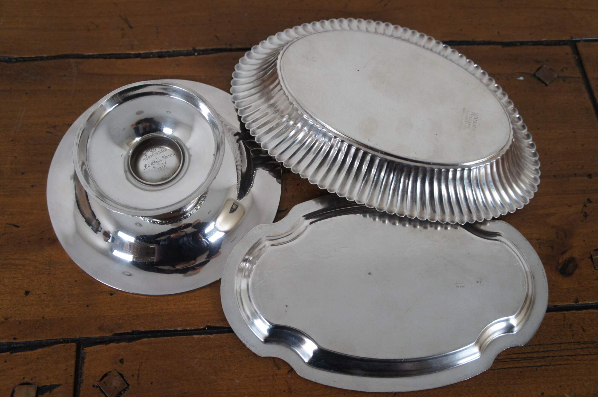 Set of 3 vintage assorted silverplate serving dishes. Wilcox Silver Plate Co / International silver Co. Beverly Manor N7062 footed bon bon / nut dish. Wallace Avalon Silverplate 1450 oval dish with fluted sides. And a small card tray / platter marked JLS.