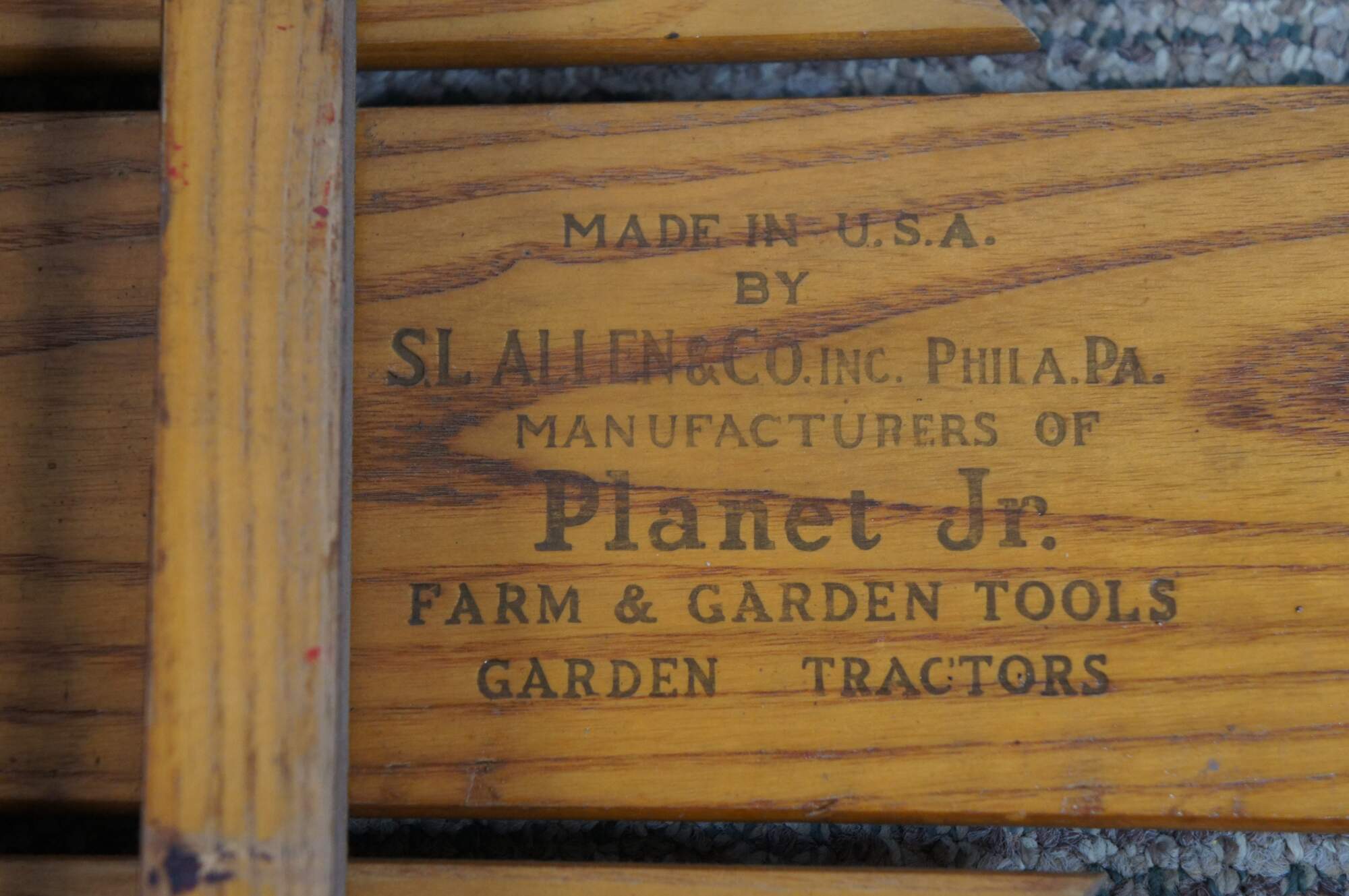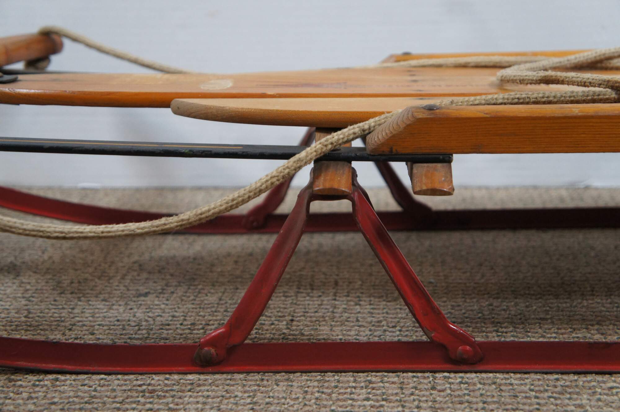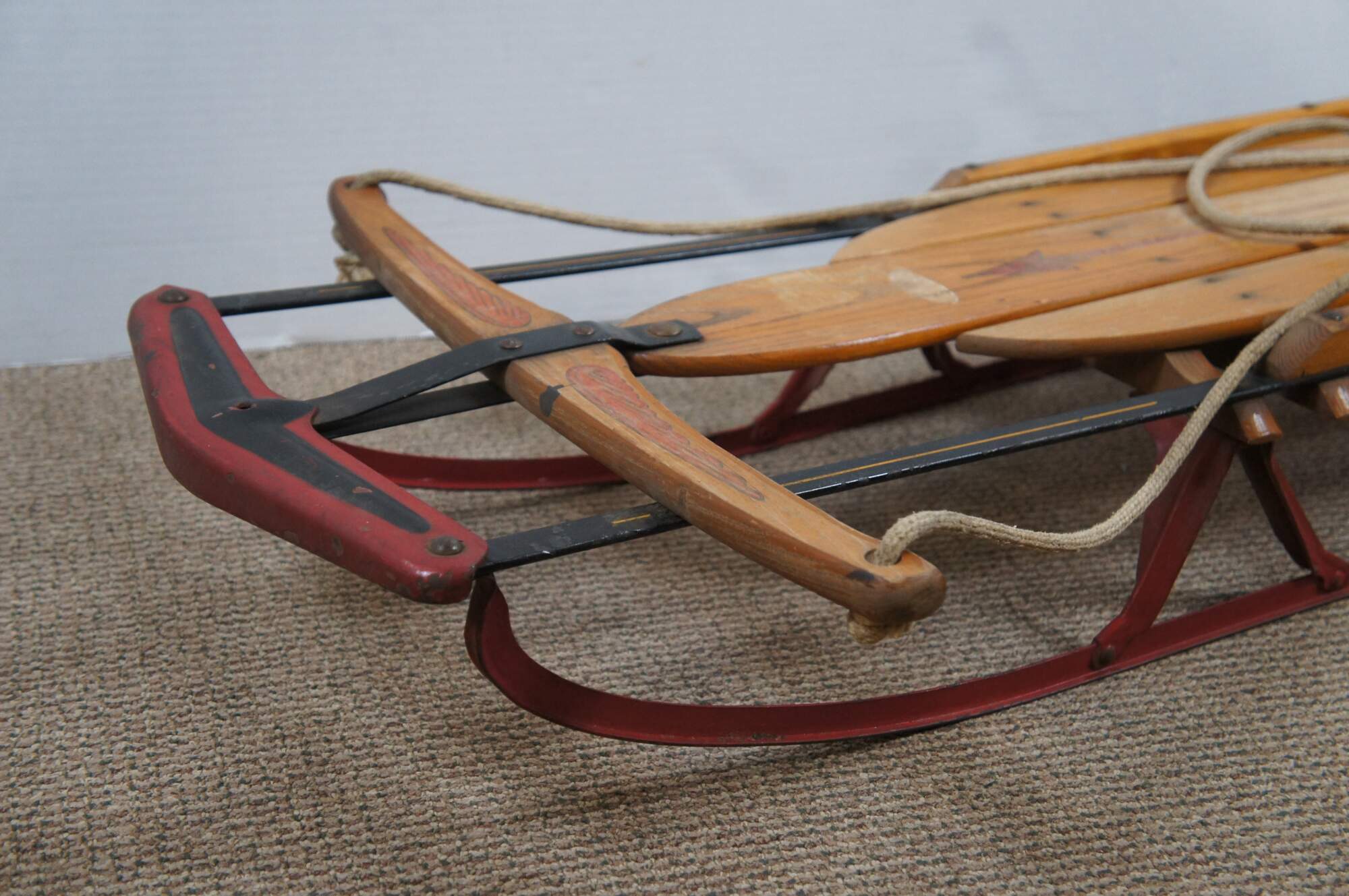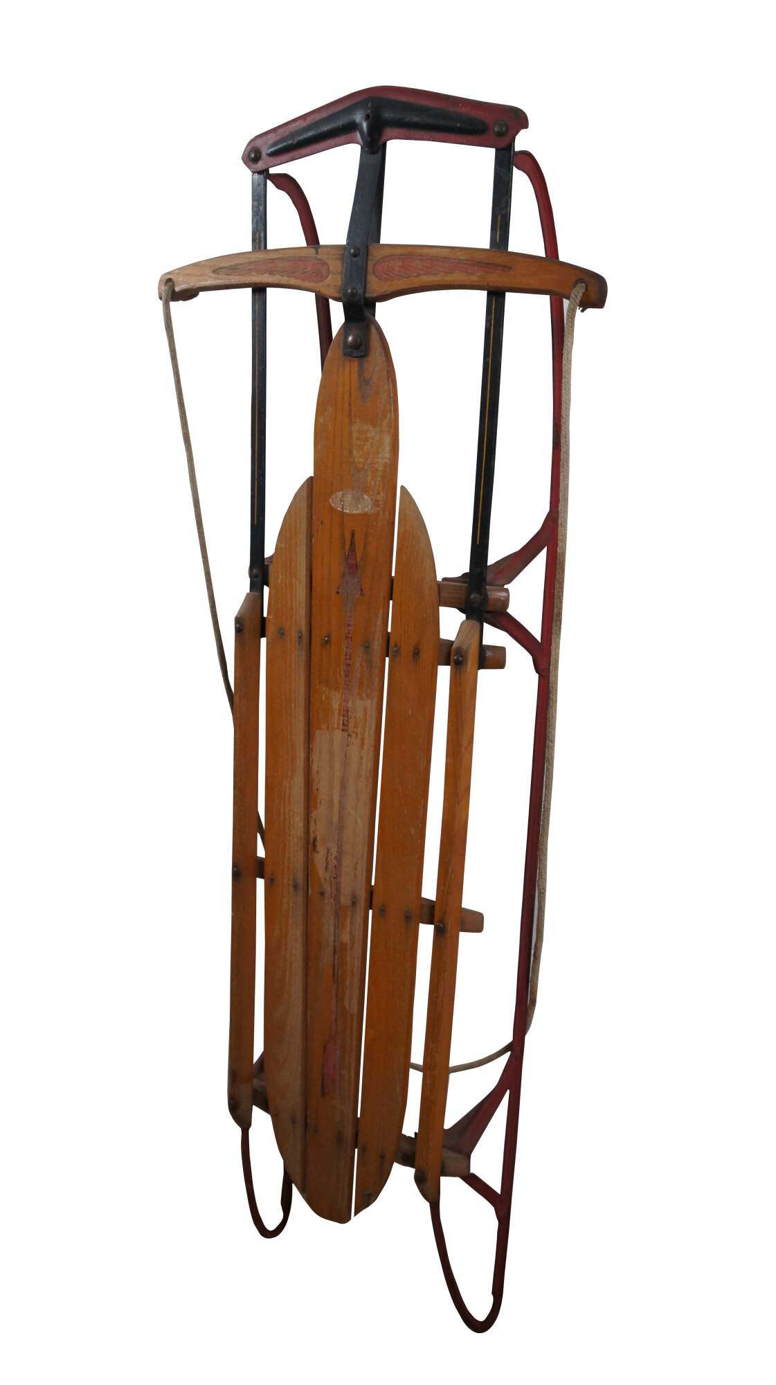 Mid century Flexible Flyer Airline Junior No. 251 winter / snow sled with safety runners and "super steering". Crafted of wood slats with red painted iron runners and rope handle. Made in USA by S.L. Allen & Company Inc of Philadelphia, PA. Planet Jr. Farm & Garden Tools.