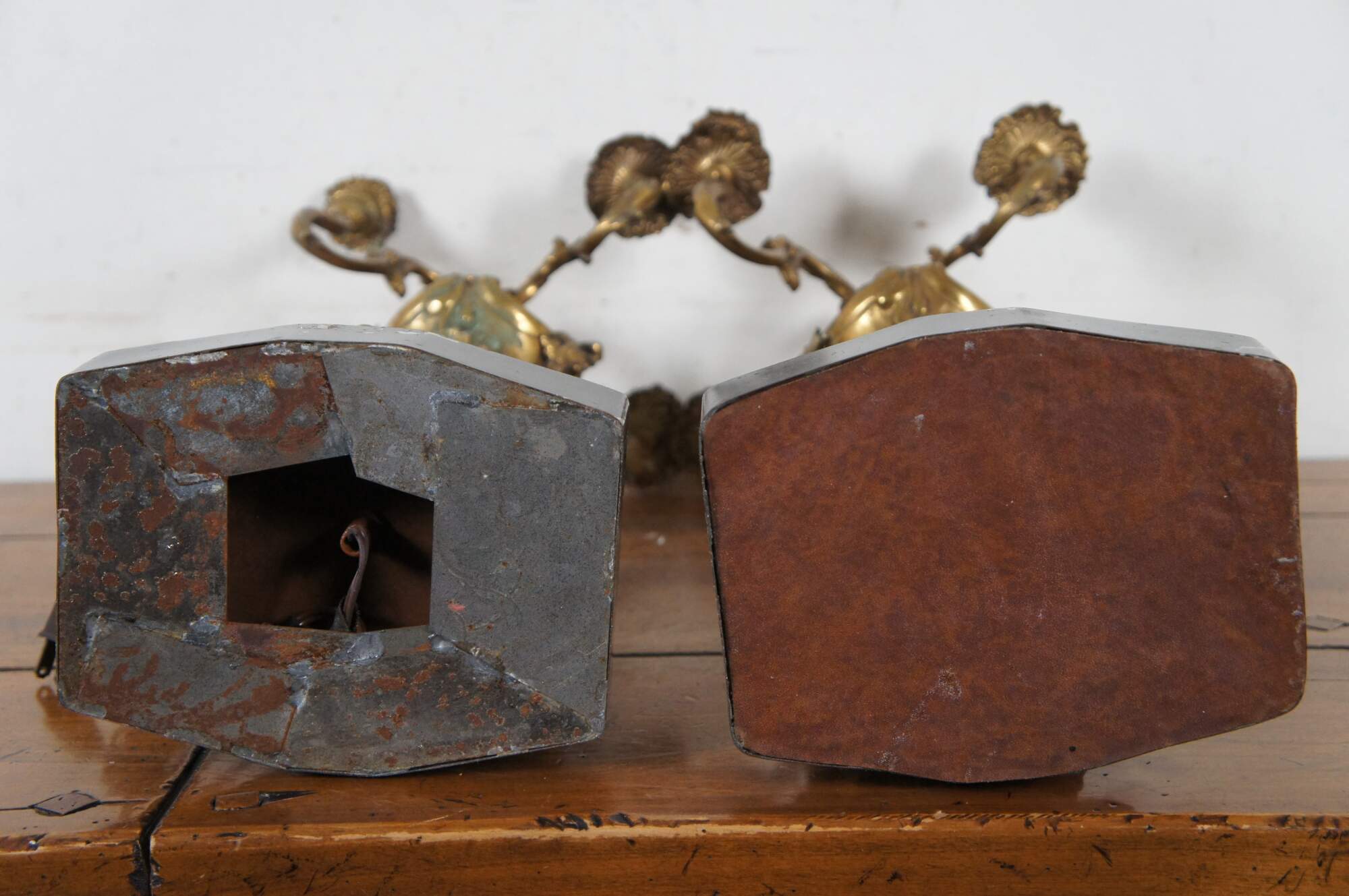 Pair of antique bronze baroque style four arm candelabras, mounted on black painted metal bases and partially converted for electrics.